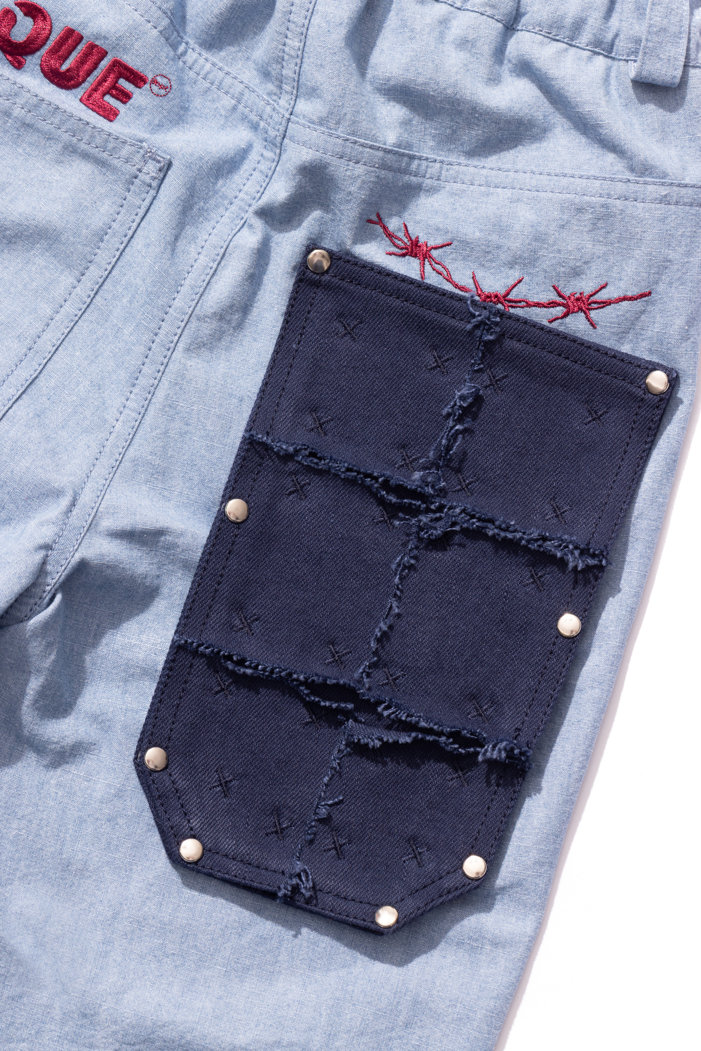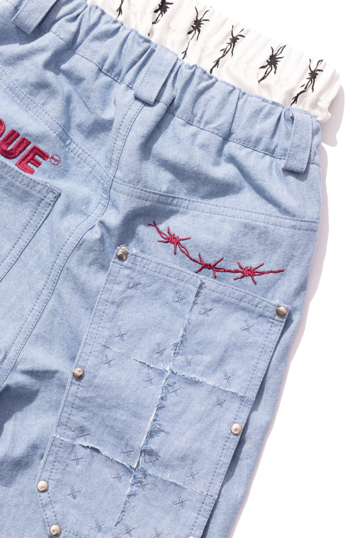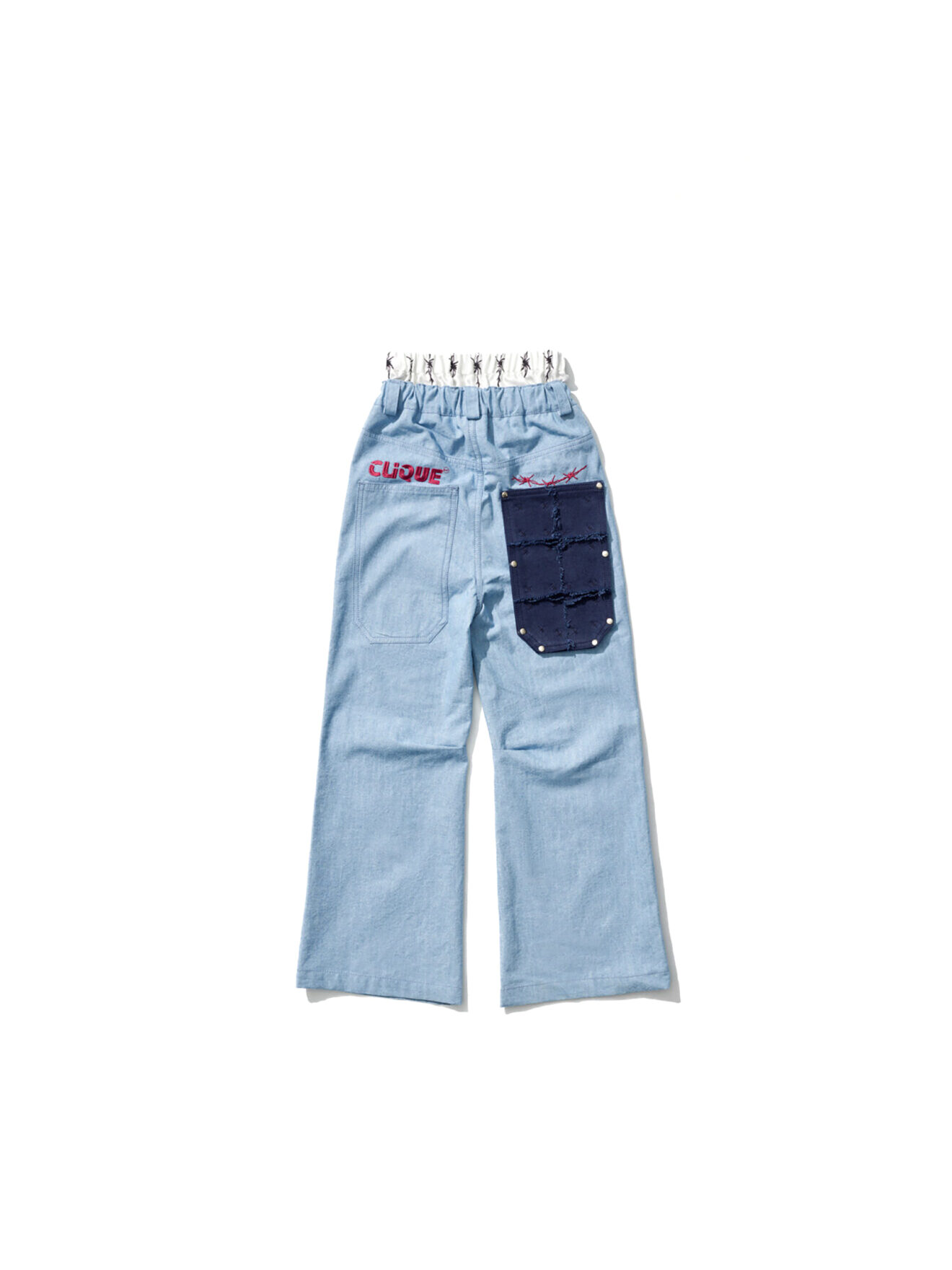 A pair of sturdy denim pants featuring a performance-inspired silk waist insert along with a removable back pocket, side stripes and multiple printed, patched and embroidered motifs throughout. Inspired by 90s tennis equipment and working out in denim, focused to showcase a uniform look.