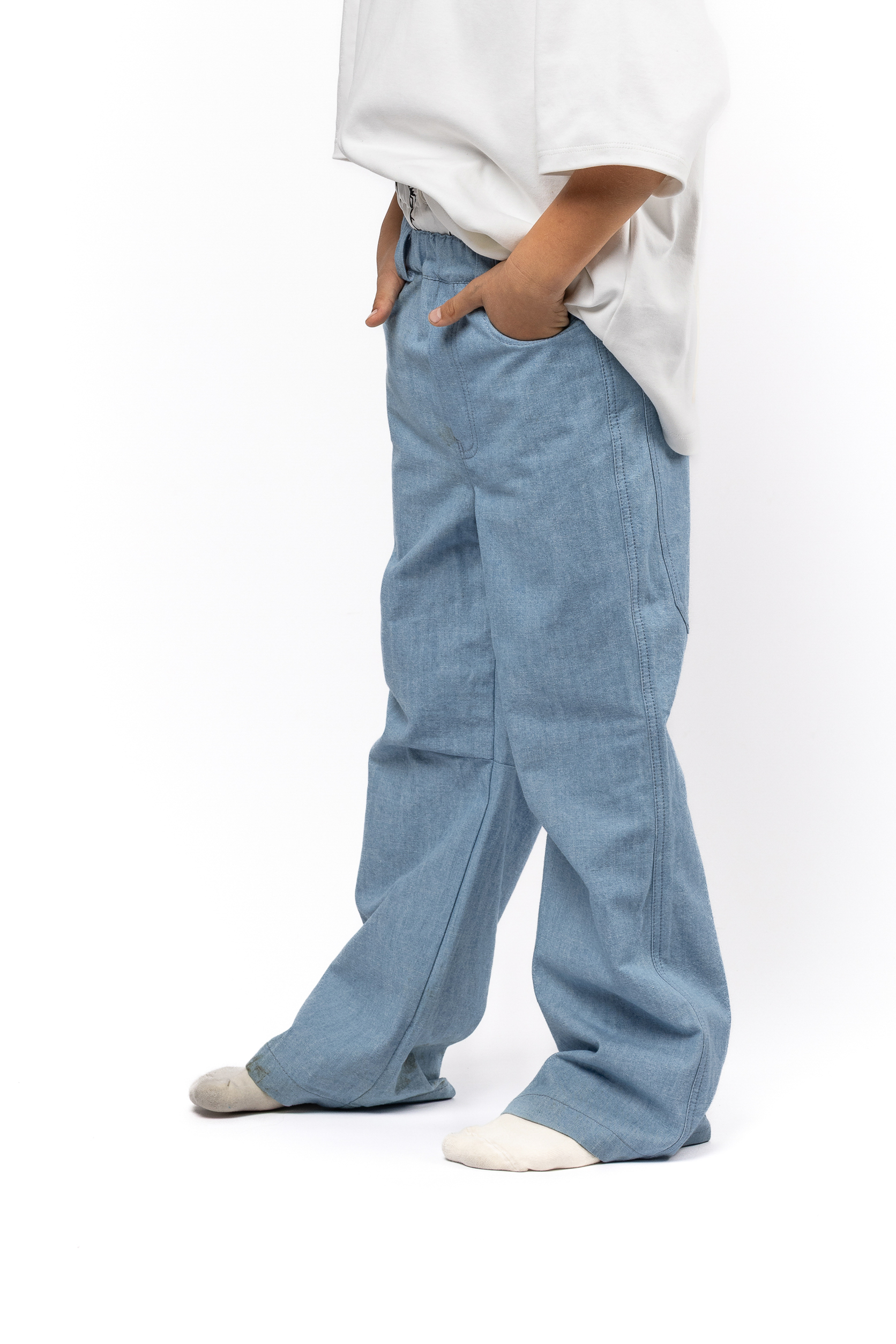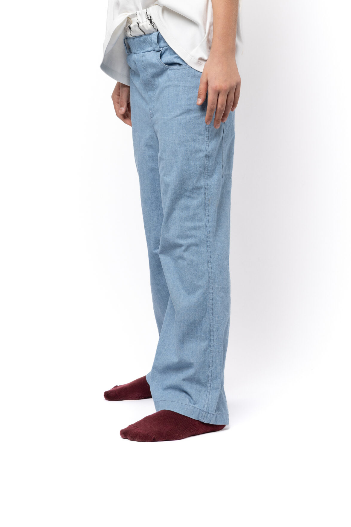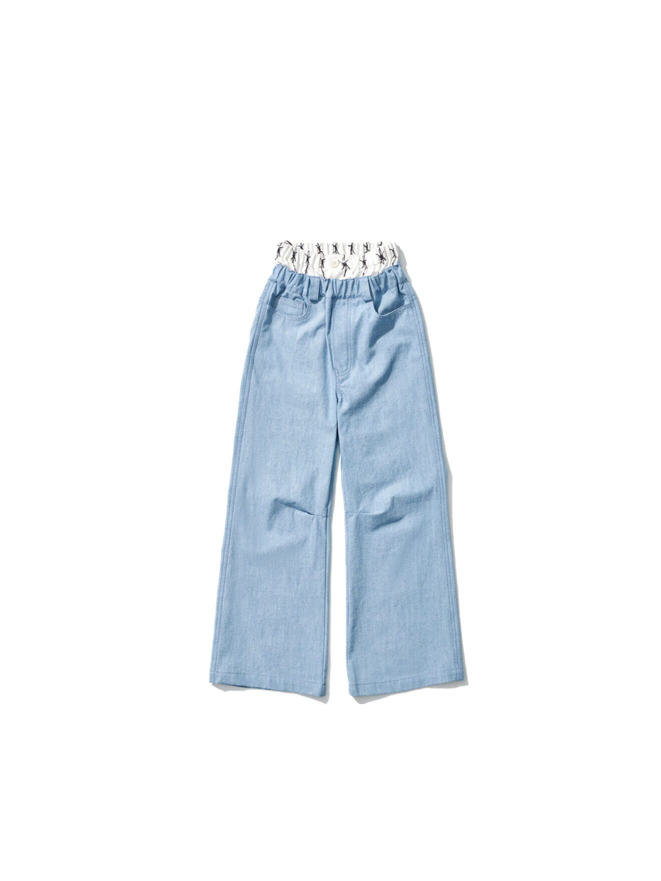 A pair of sturdy denim pants featuring a performance-inspired silk waist insert along with a removable back pocket, side stripes and multiple printed, patched and embroidered motifs throughout. Inspired by 90s tennis equipment and working out in denim, focused to showcase a uniform look.