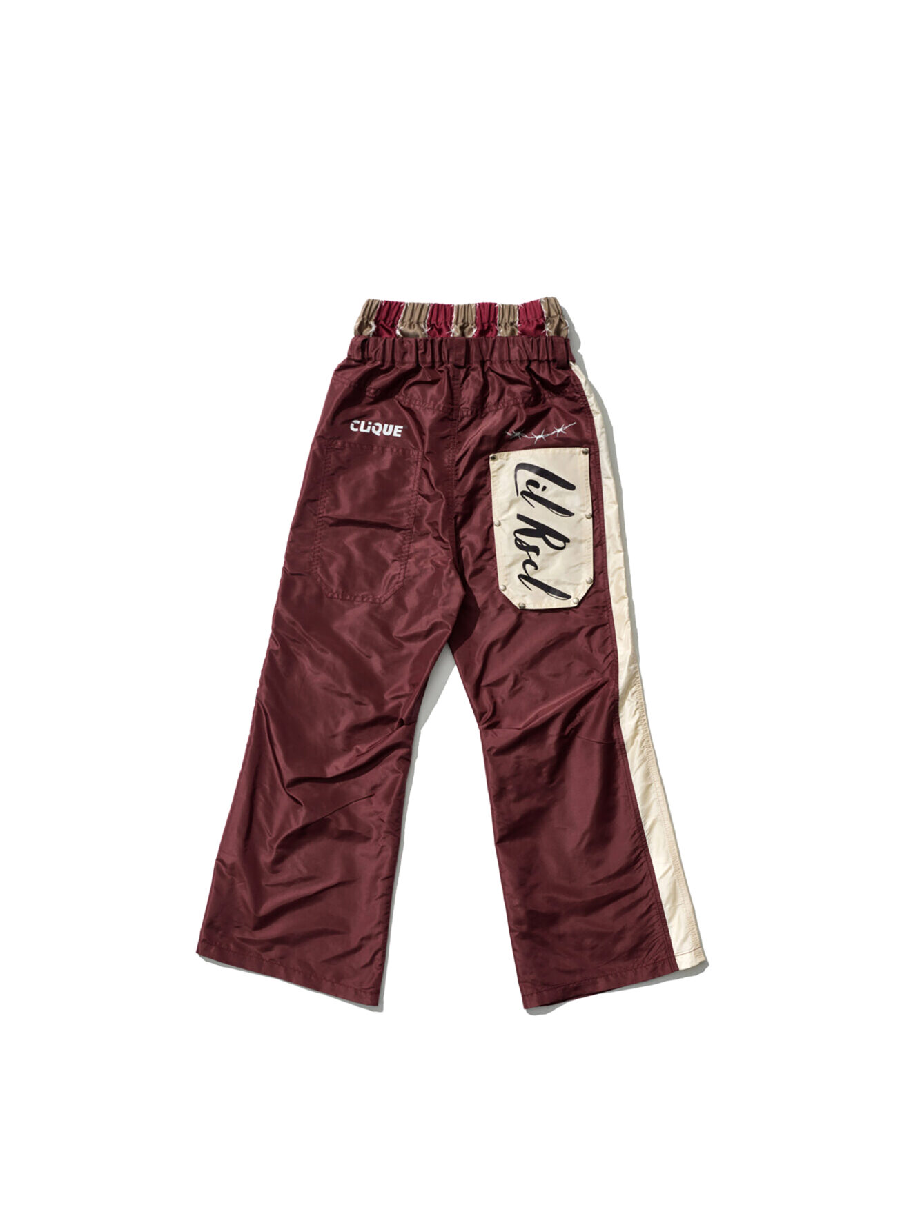 The "Jr." addition symbolizes the garment's shrinking to accommodate even the youngest of wearers. A pair of flowy, light sports trousers made from a high-sheen Italian silk, featuring a performance-inspired silk boxer short waist insert along with a removable elongated back pocket, side stripes and multiple printed motifs throughout. Inspired by 90s tennis equipment, focused to showcase a uniform look.