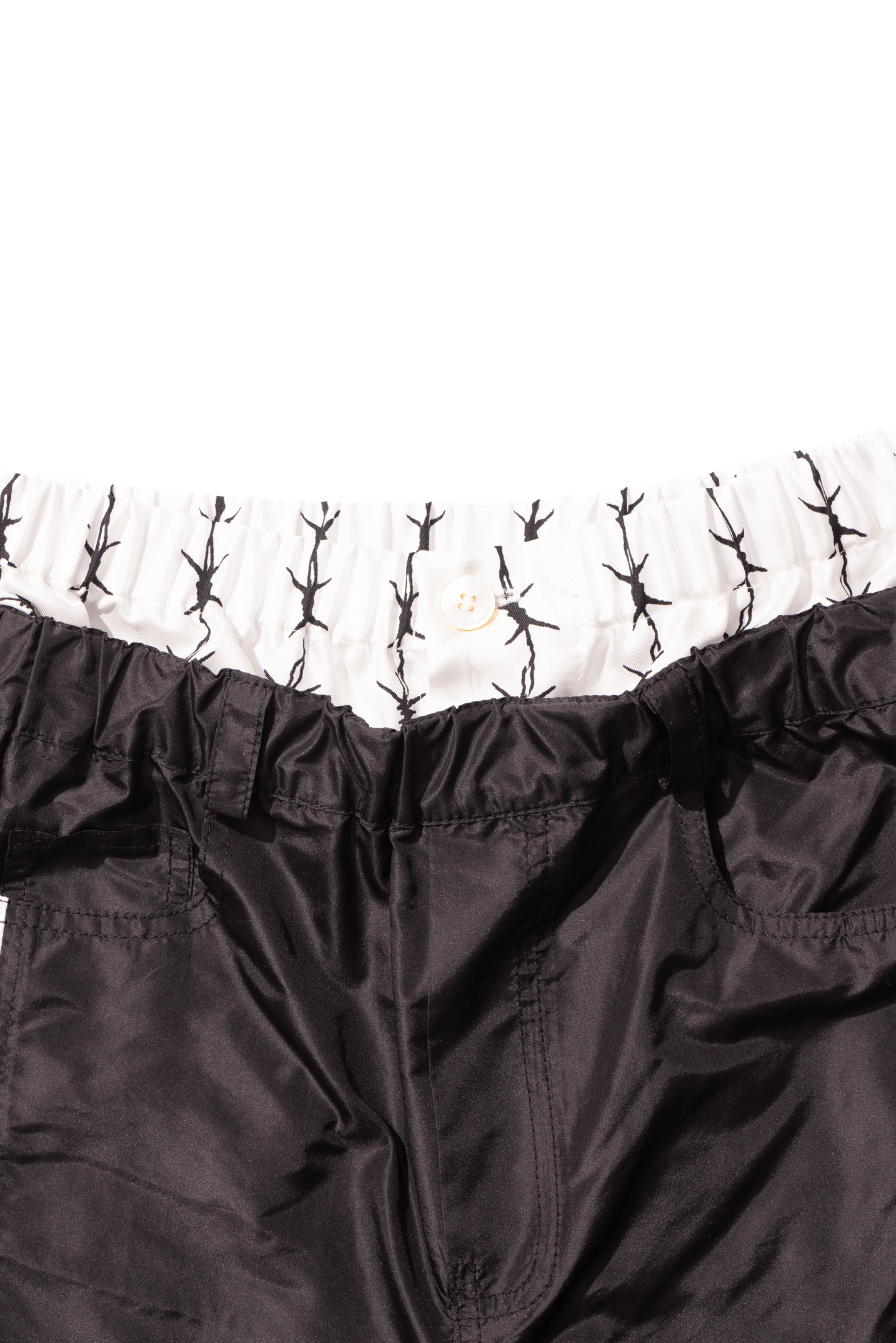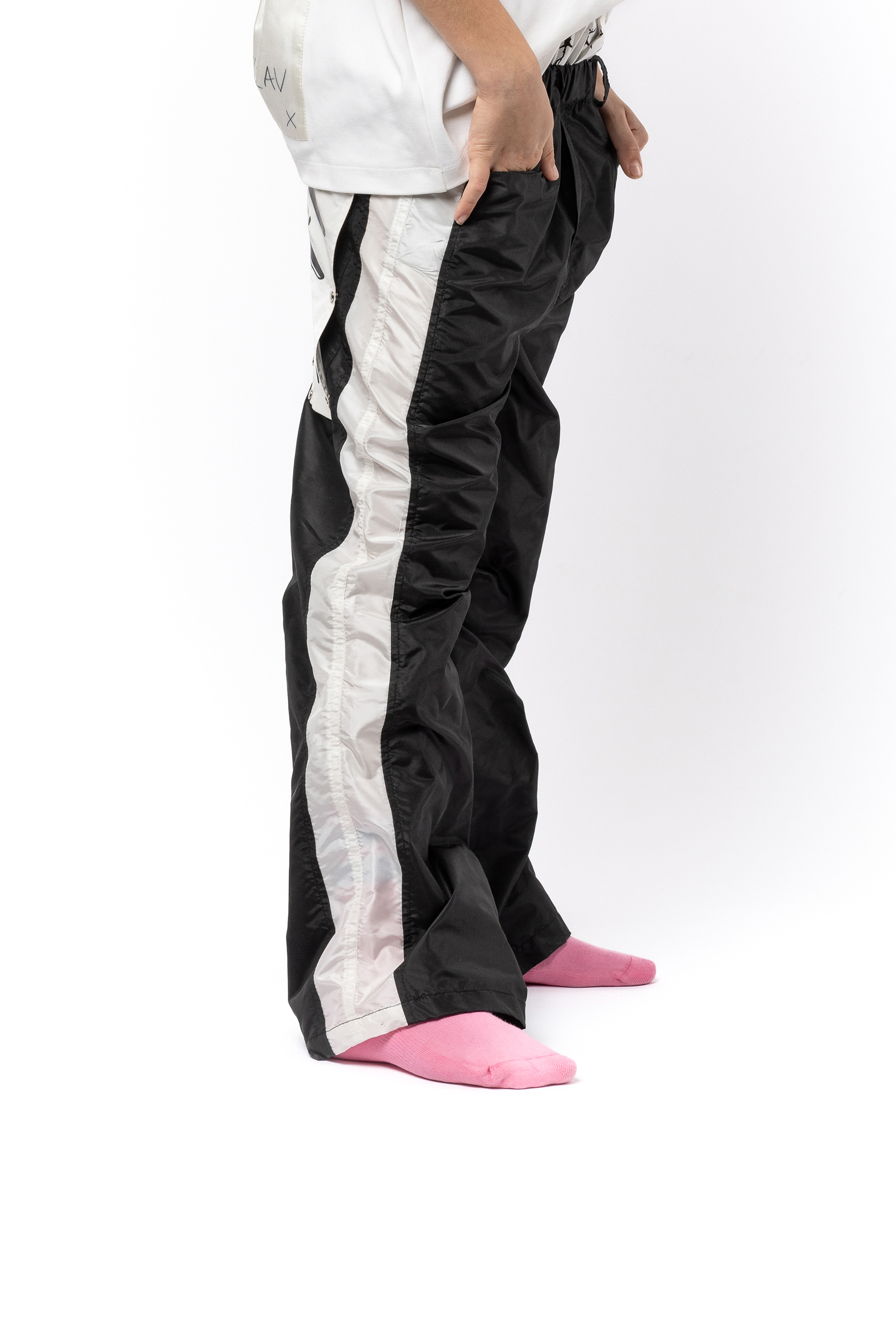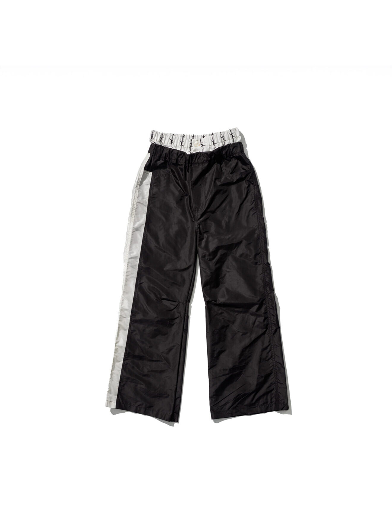 A pair of flowy, light sports trousers made from a high-sheen Italian silk, featuring a performance-inspired silk boxer short waist insert along with a removable elongated back pocket, side stripes and multiple printed motifs throughout. Inspired by 90s tennis equipment, focused to showcase a uniform look.