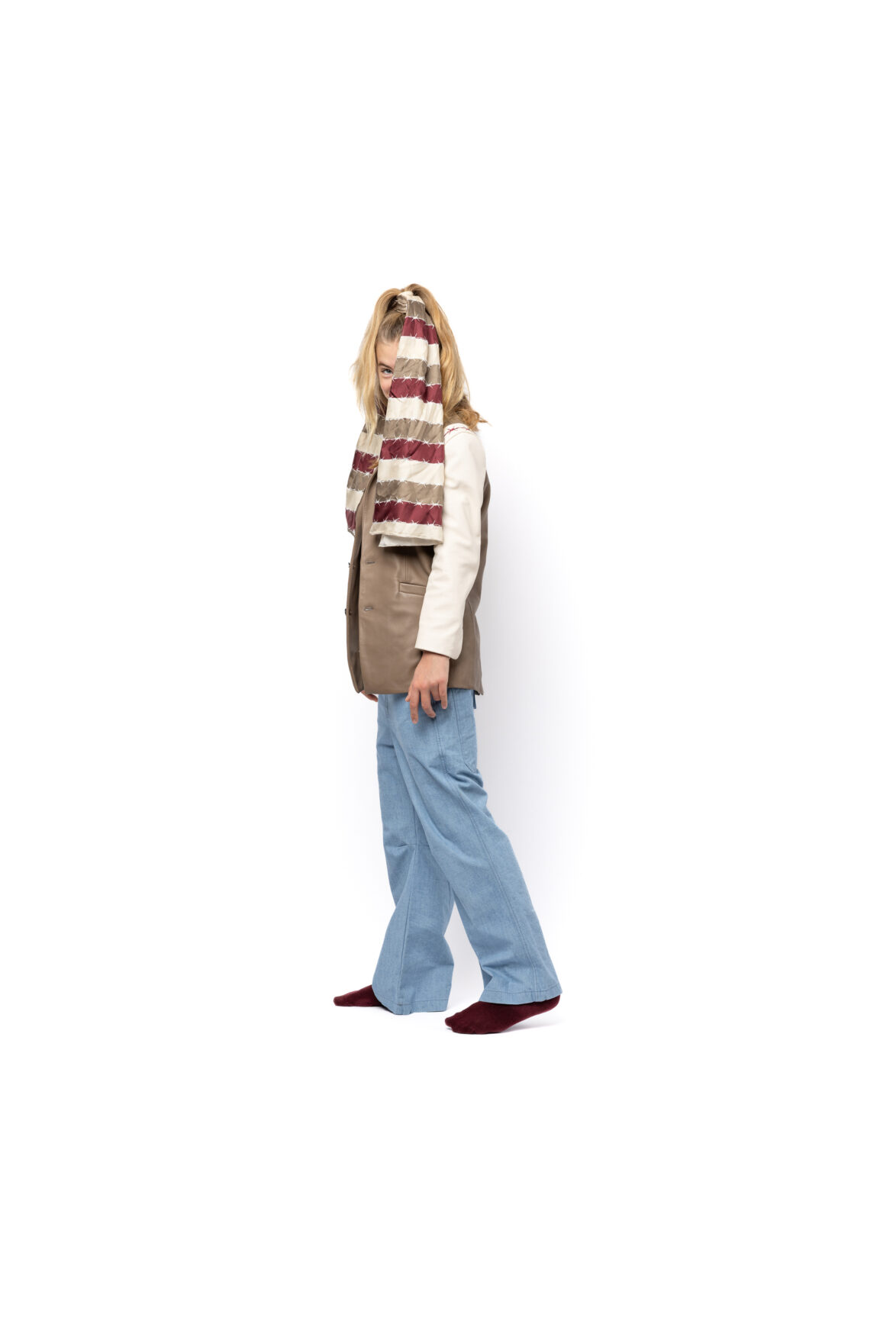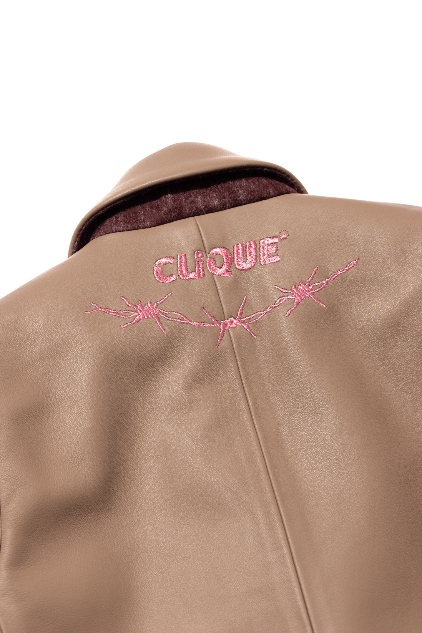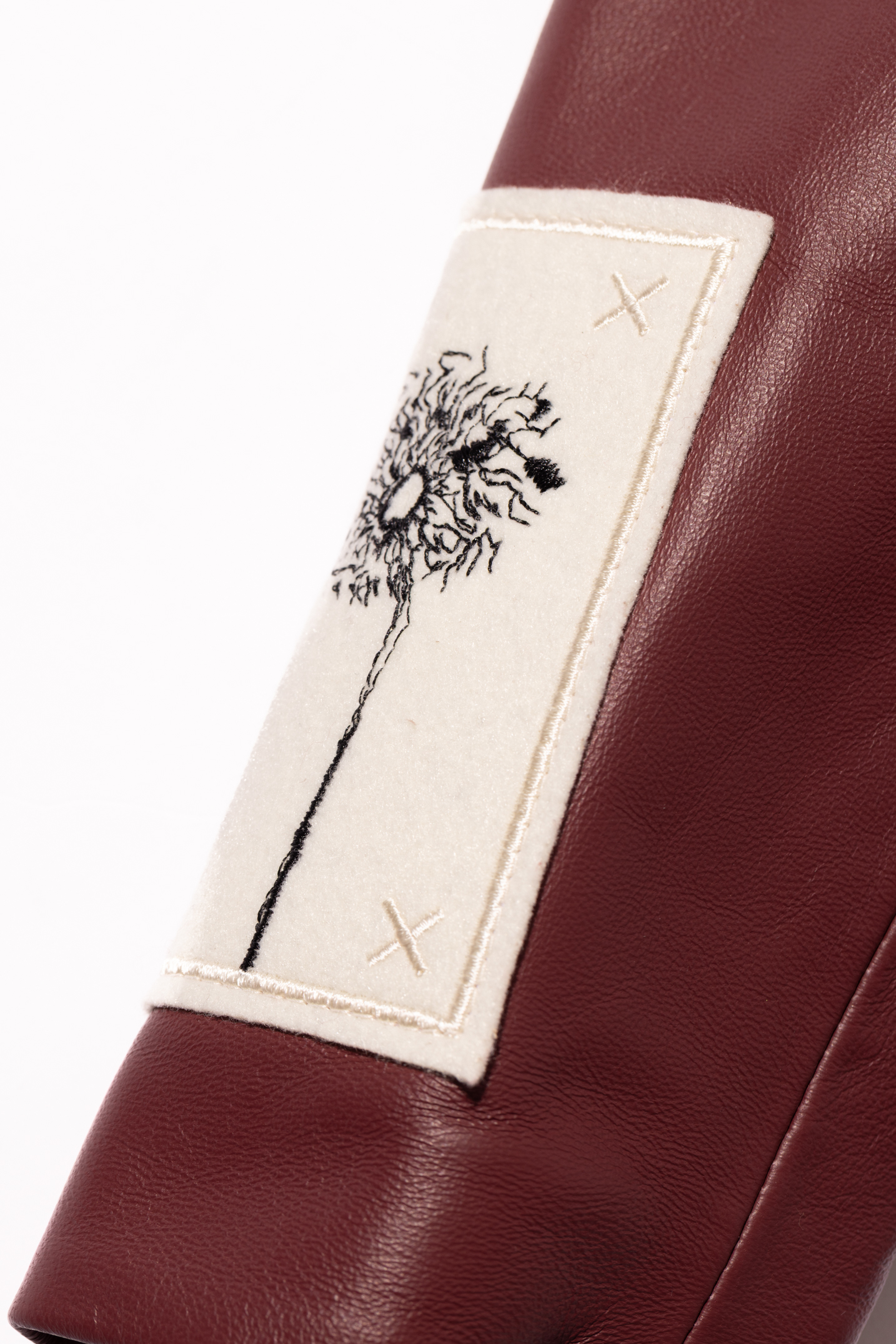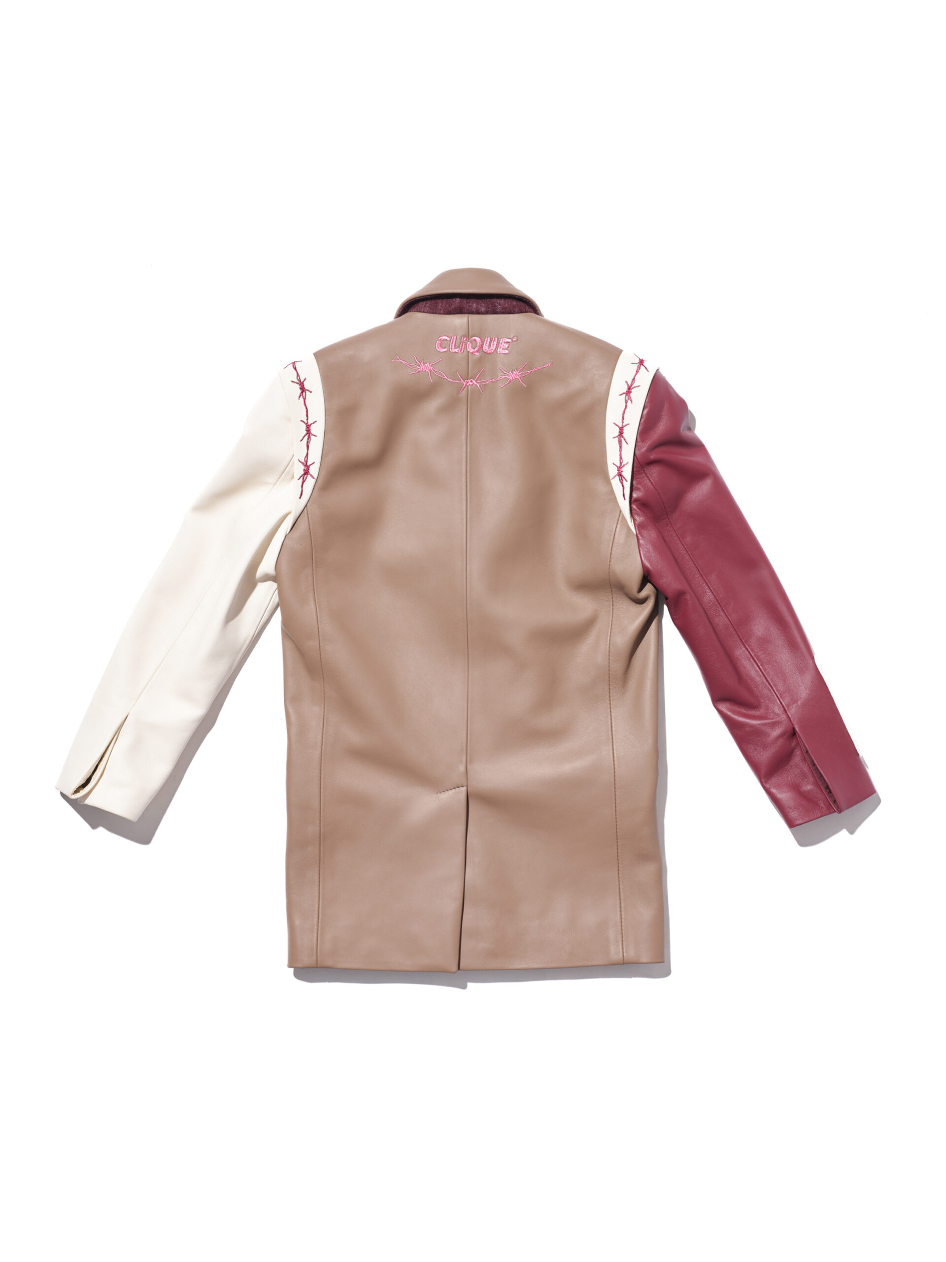 An oversized suit jacket with exaggerated shoulders, two-button closure and peak lapels. Inspired by 90s power suiting and featuring contrast coloured silk shoulder inserts along with embroideries and printed motifs throughout. Made from high grain Italian Bovina with a soft cupro lining.