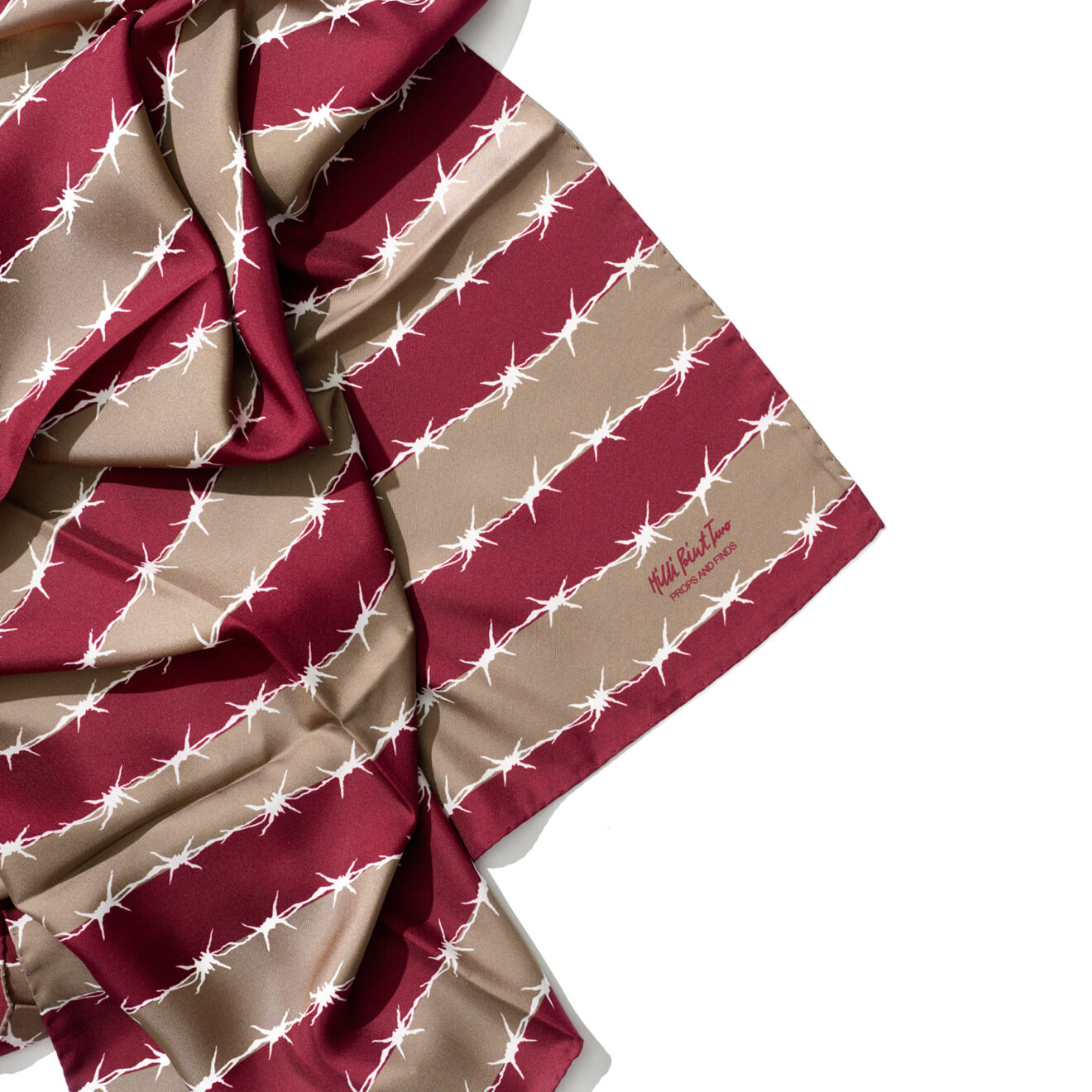 Either hiding the wavy or protecting the precious head, this silk bandana will cover up most of the losses incurred during the day, and spangle with unprecedented smoothness. Made from 100% Italian silk tafetta and featuring the brand's signature barbwire paisley print throughout, in a luxurious taupe hue with chianti detailing.