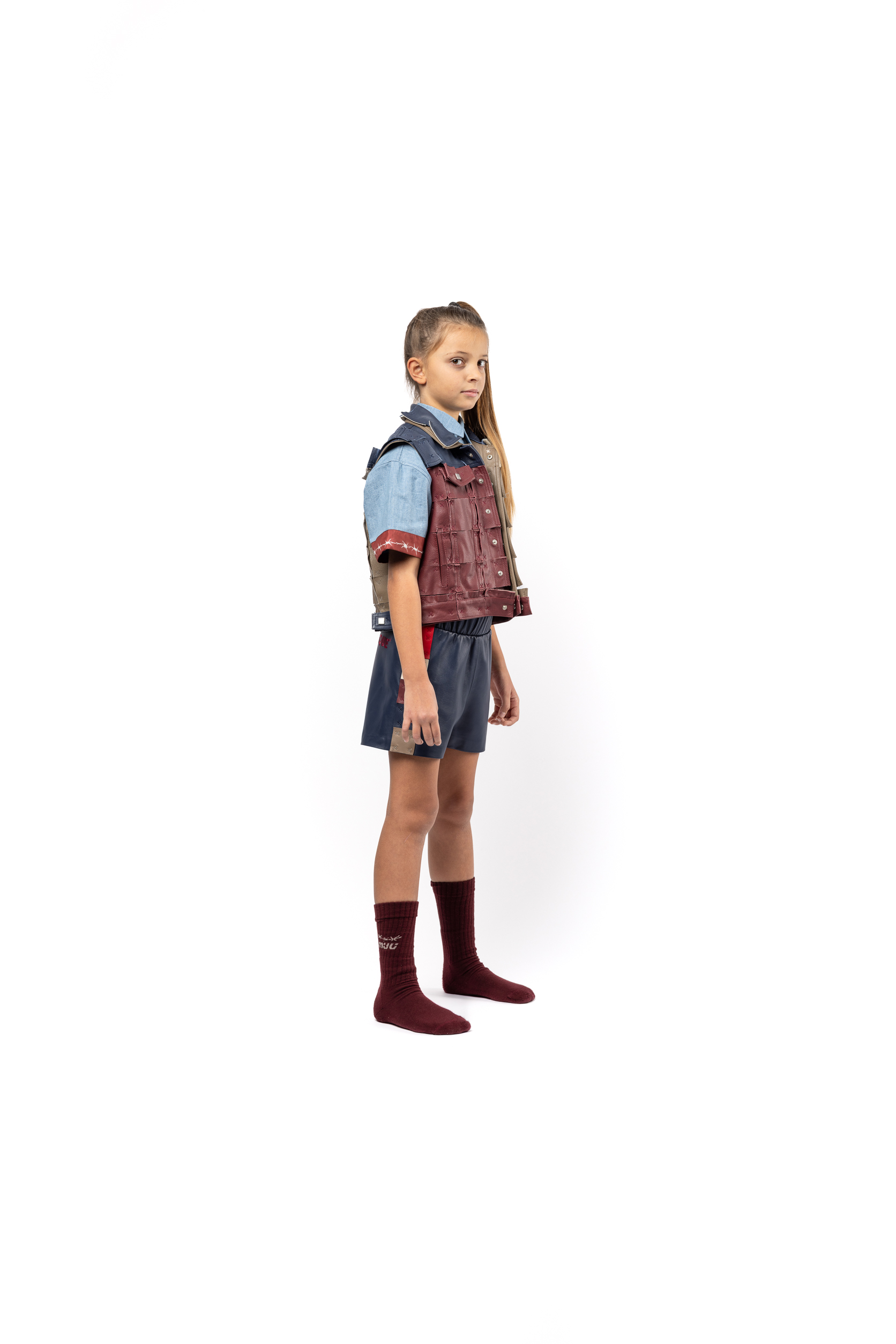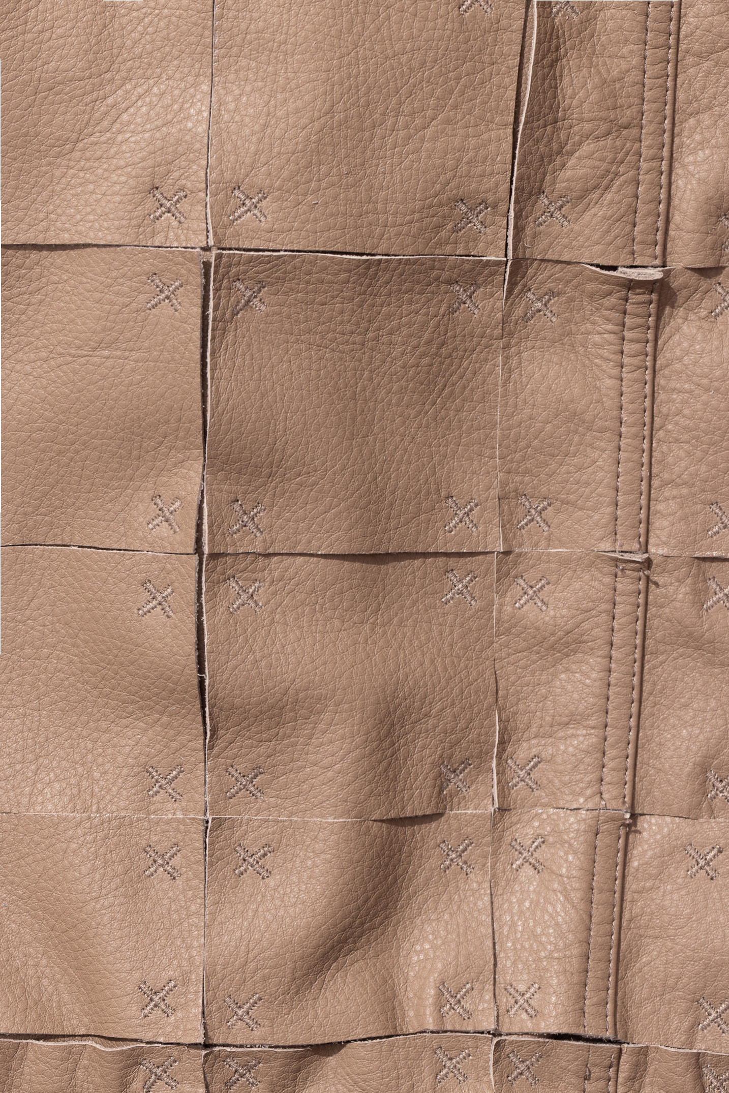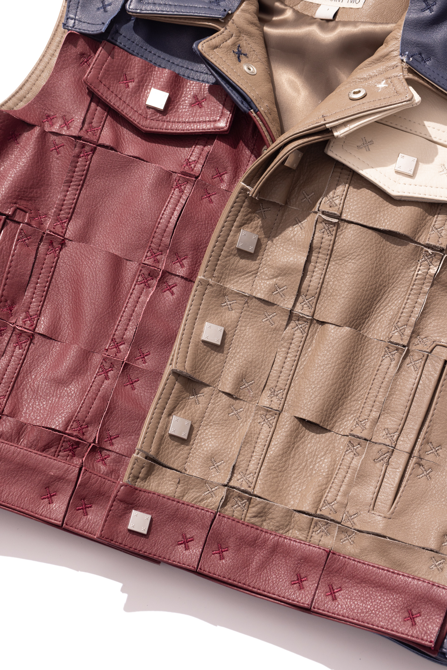 A cropped sleeveless jacket made from 100% Italian Bovina leather, utilizing the signature "3D" deconstructed finish. The vest was made by fusing two identical pieces with one lasercut into square fragments and sewn onto the base garment. Features printed details on the body.