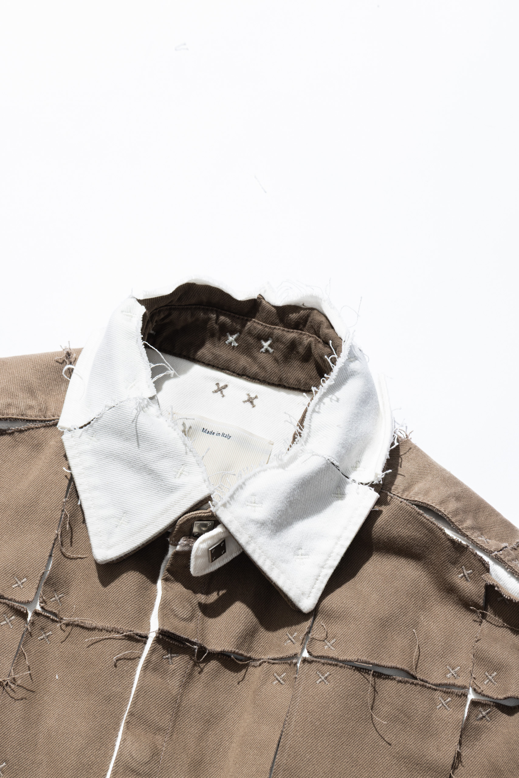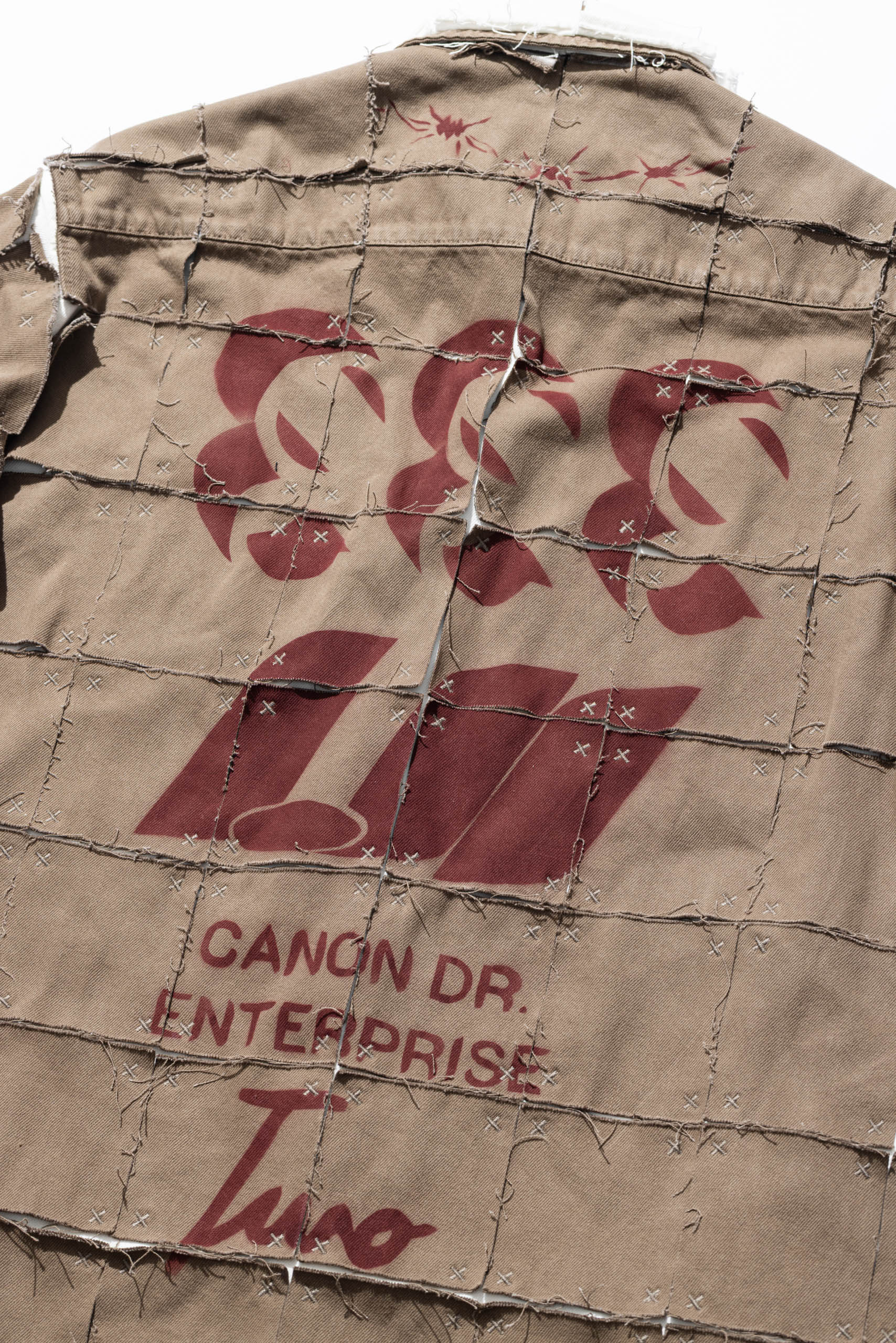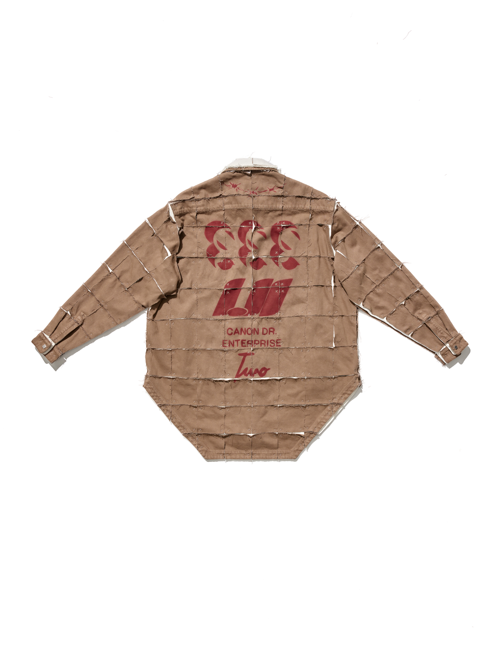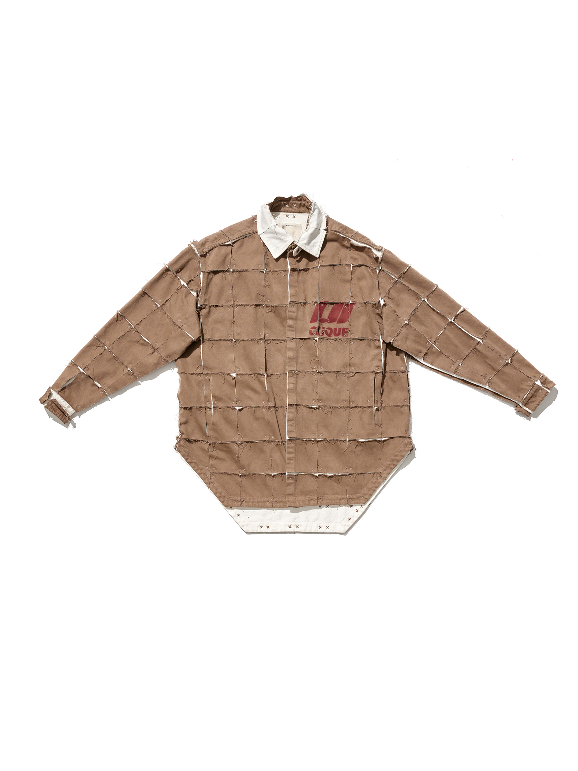 An oversized and elongated work shirt made from Berto denim twill utilizing the brand's signature "3D" deconstruction technique along with the signature "calyxa" hemline. The shirt was made by fusing two identical pieces with one being laser cut into square fragments and sewn onto the base garment. Features multiple branded motifs in a mix of graphic prints.