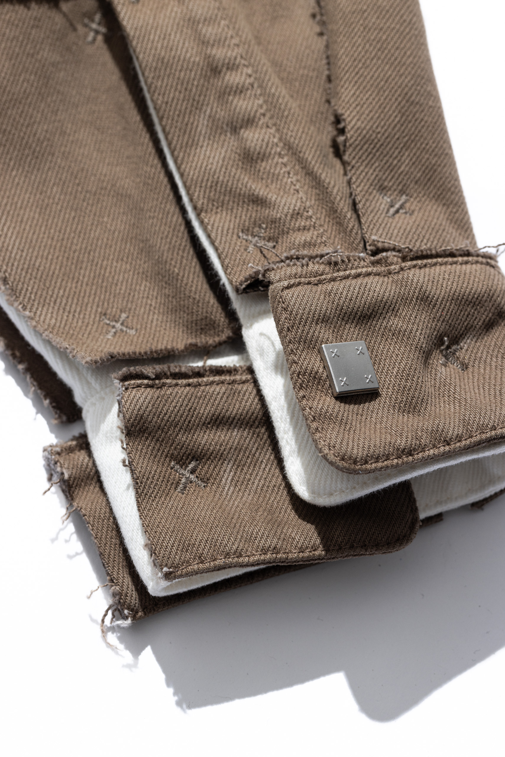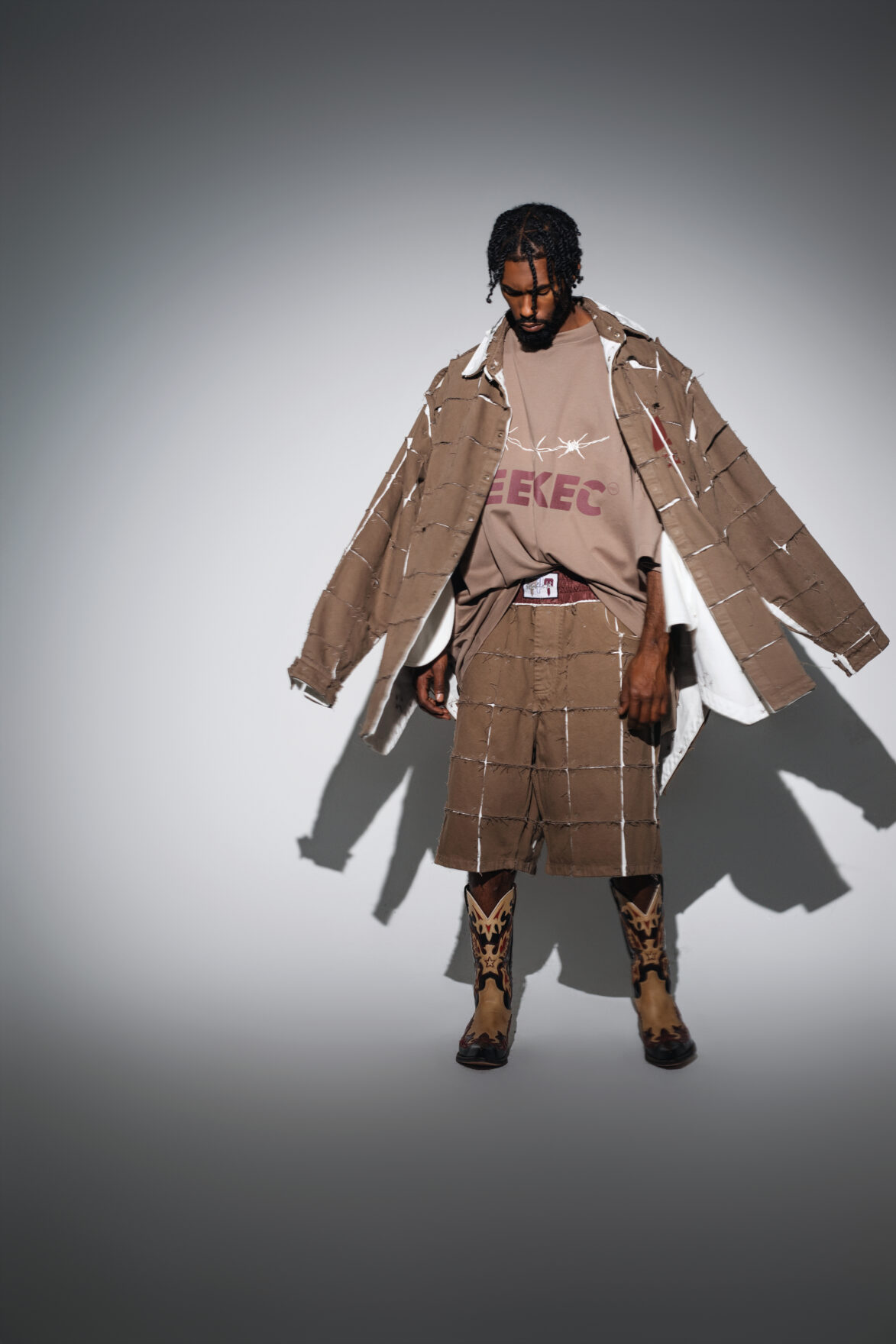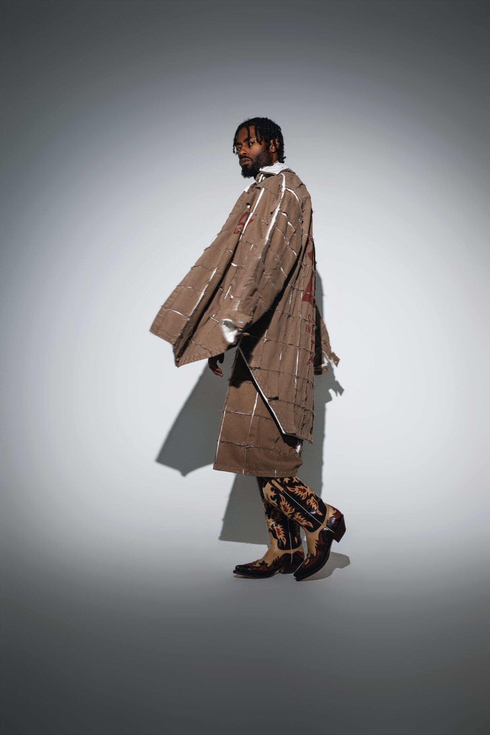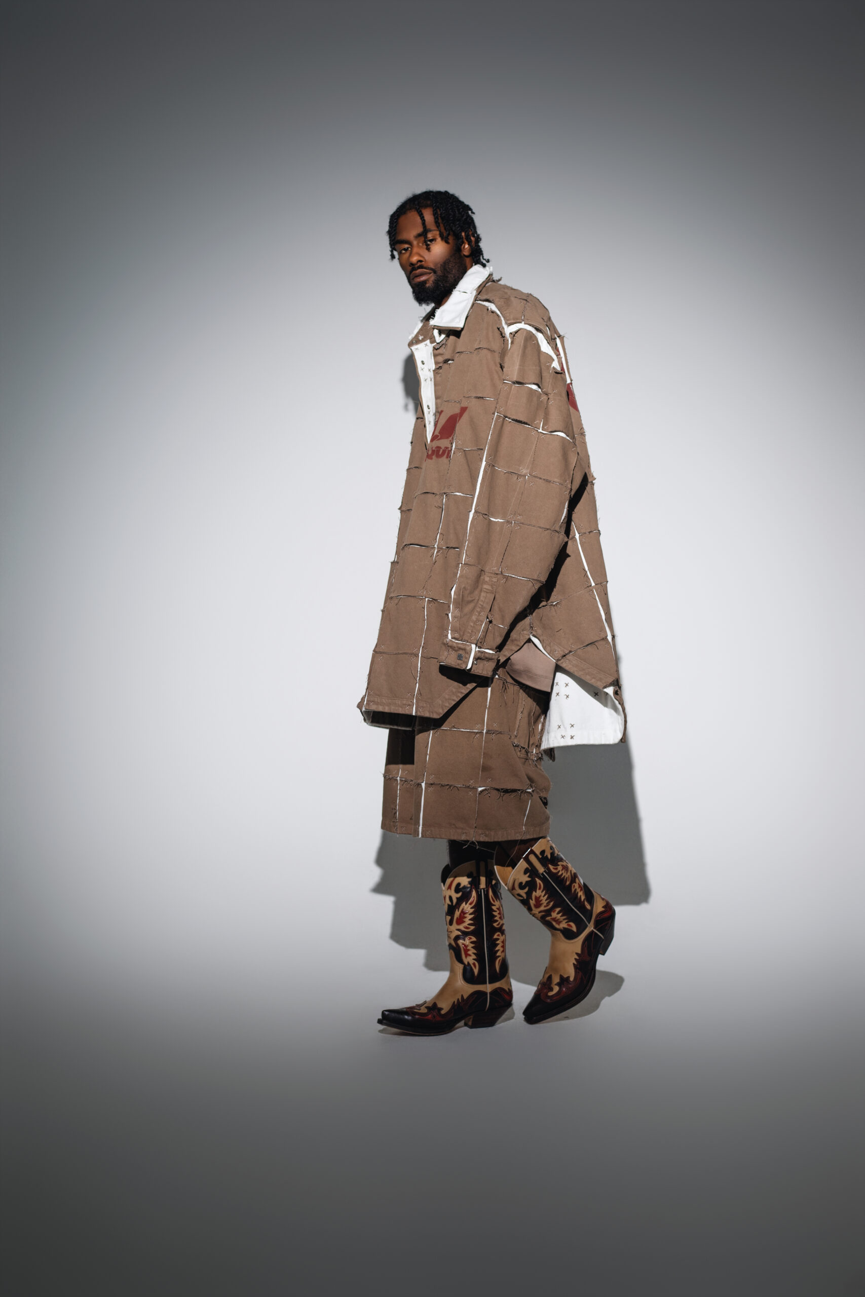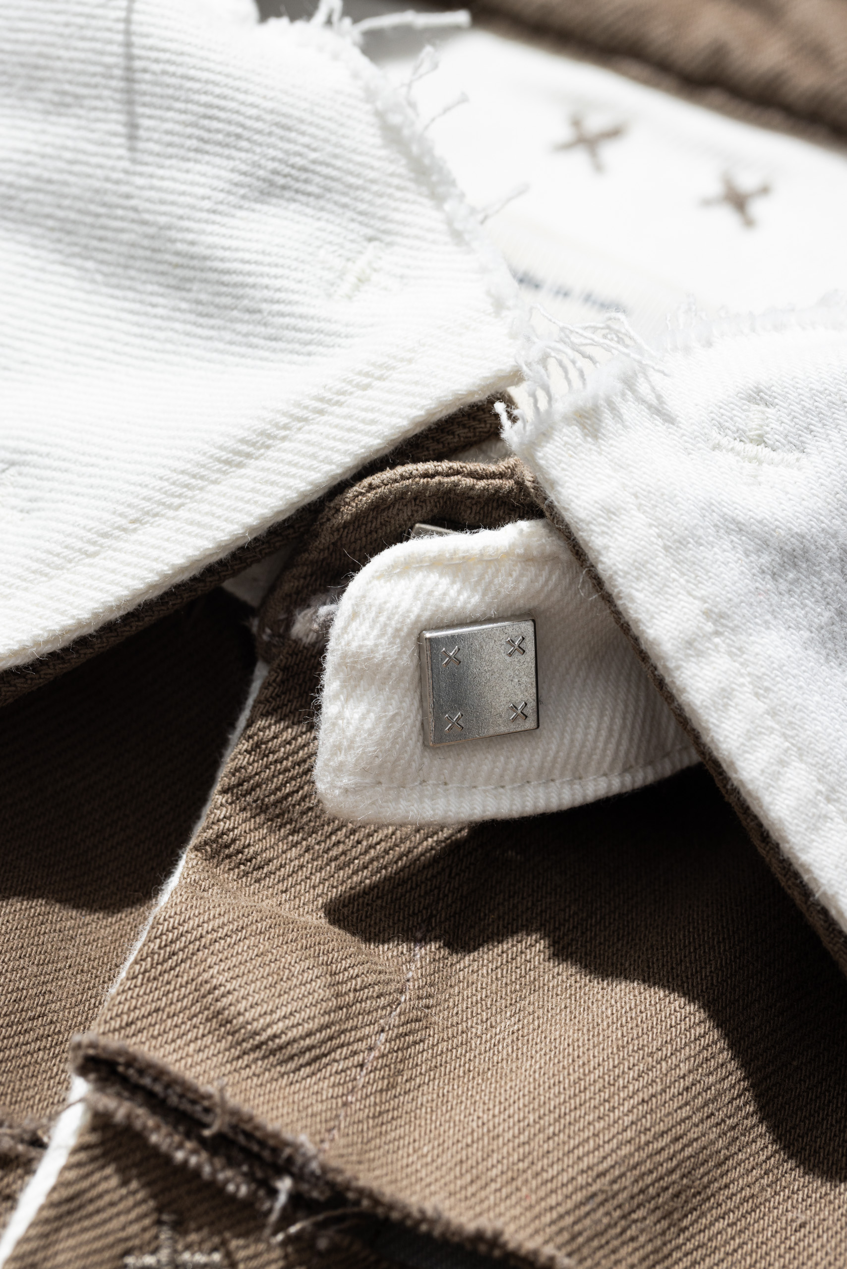 An oversized and elongated work shirt made from Berto denim twill utilizing the brand's signature "3D" deconstruction technique along with the signature "calyxa" hemline. The shirt was made by fusing two identical pieces with one being laser cut into square fragments and sewn onto the base garment. Features multiple branded motifs in a mix of graphic prints.
