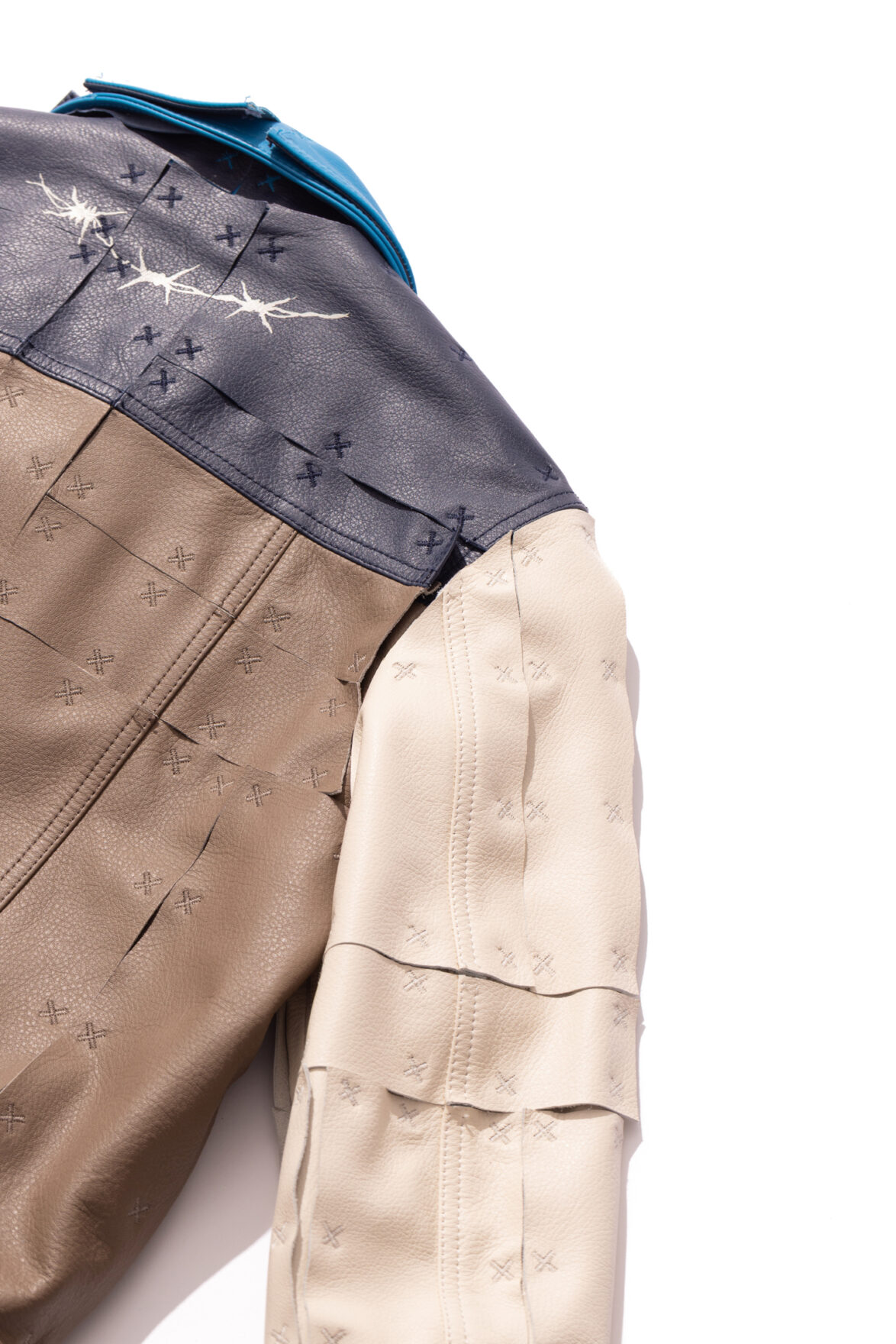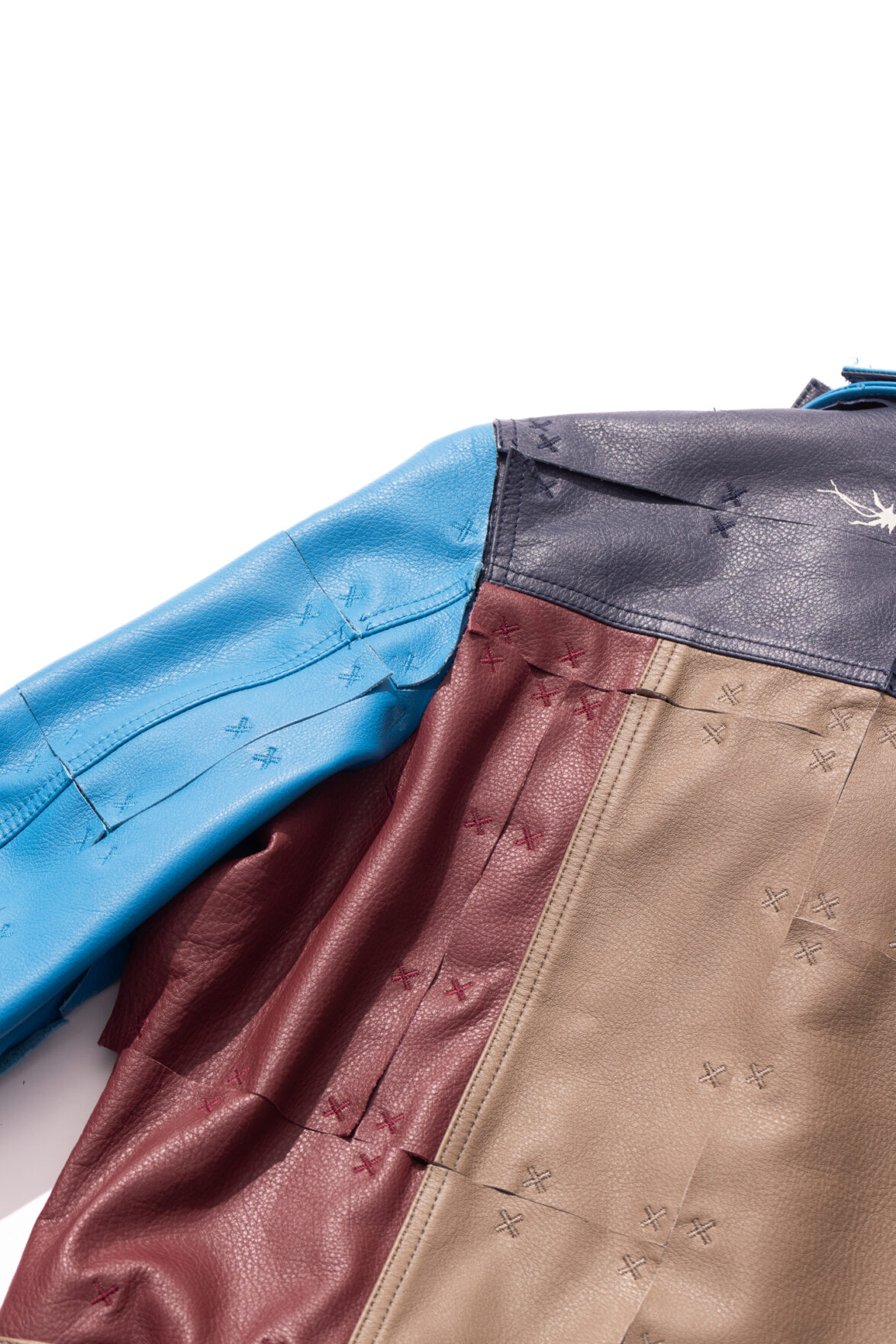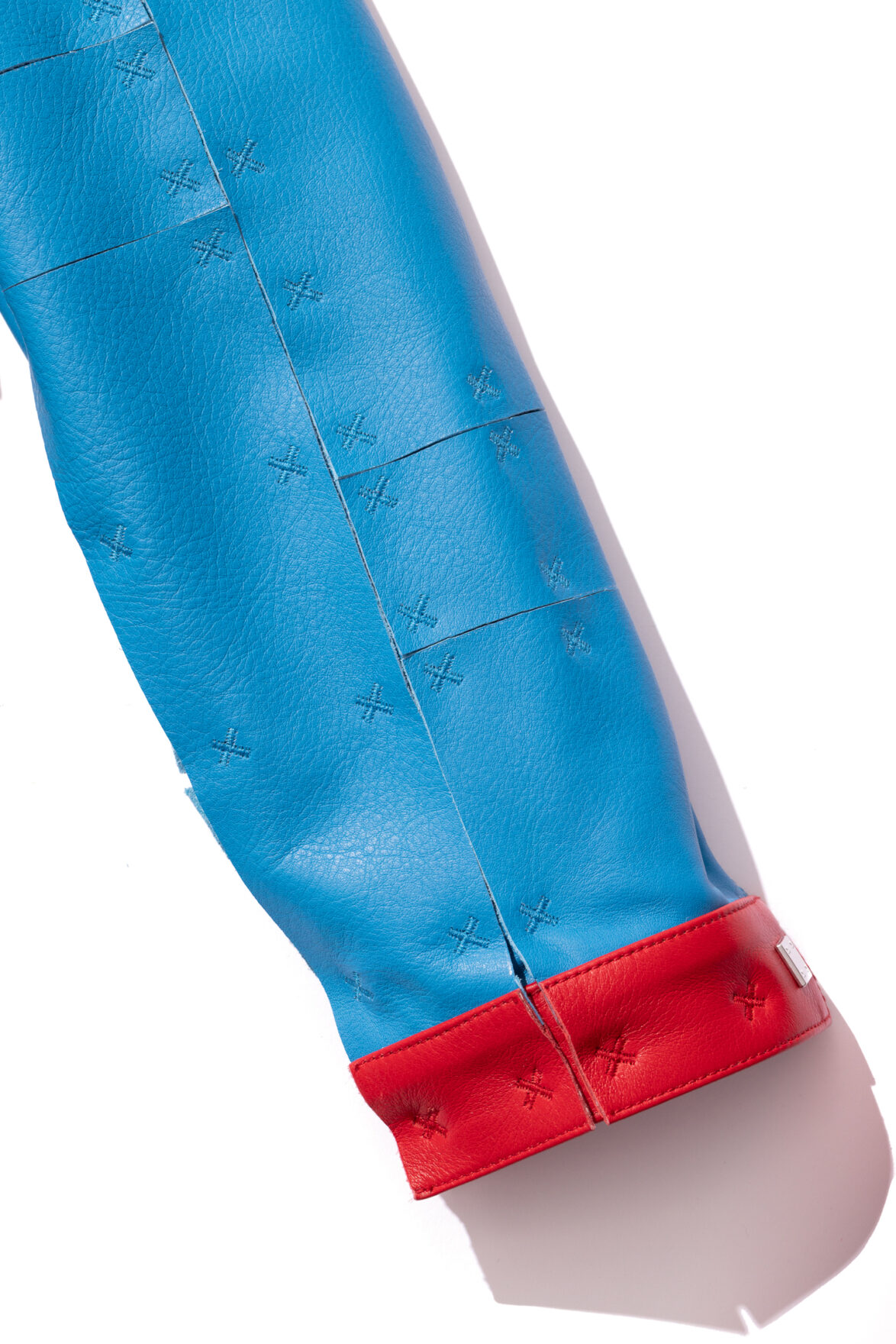 A trucker silhouette jacket made from 100% Italian Bovina leather, utilizing the signature "3D" deconstructed finish. Cut for an exaggerated crop with elongated sleeves. The jacket was made by fusing two identical pieces with one lasercut into square fragments and sewn onto the base garment. Features printed details on the body along with custom Riri studs and YKK hardware.