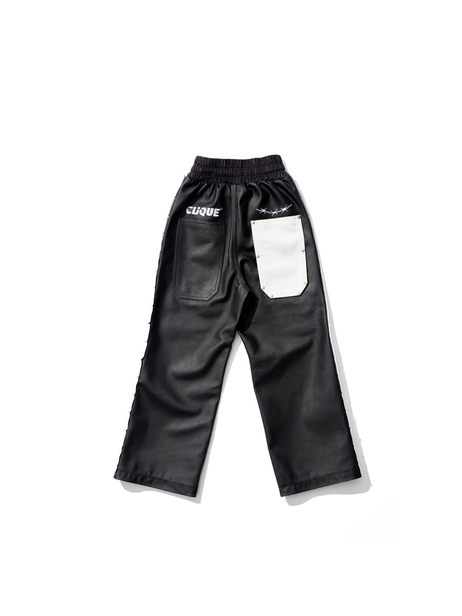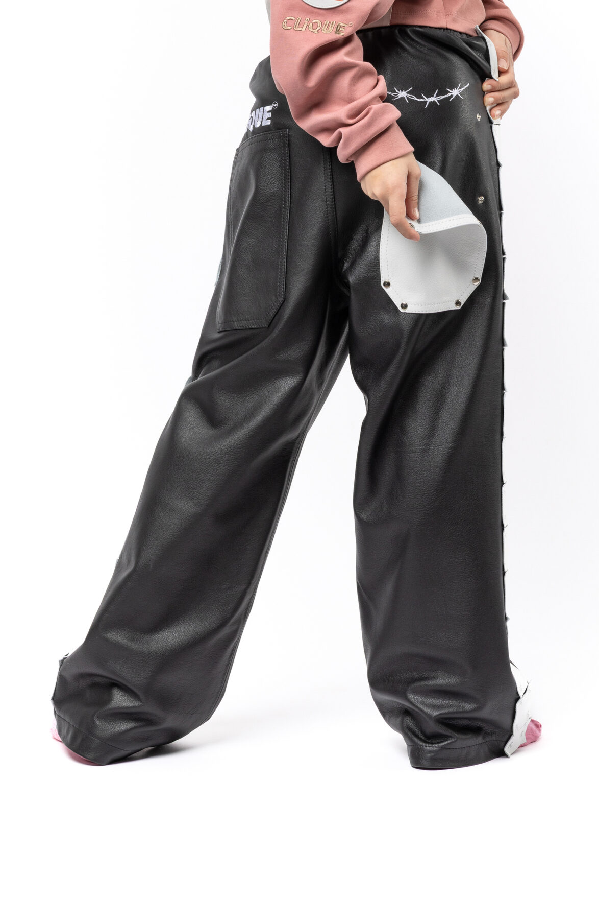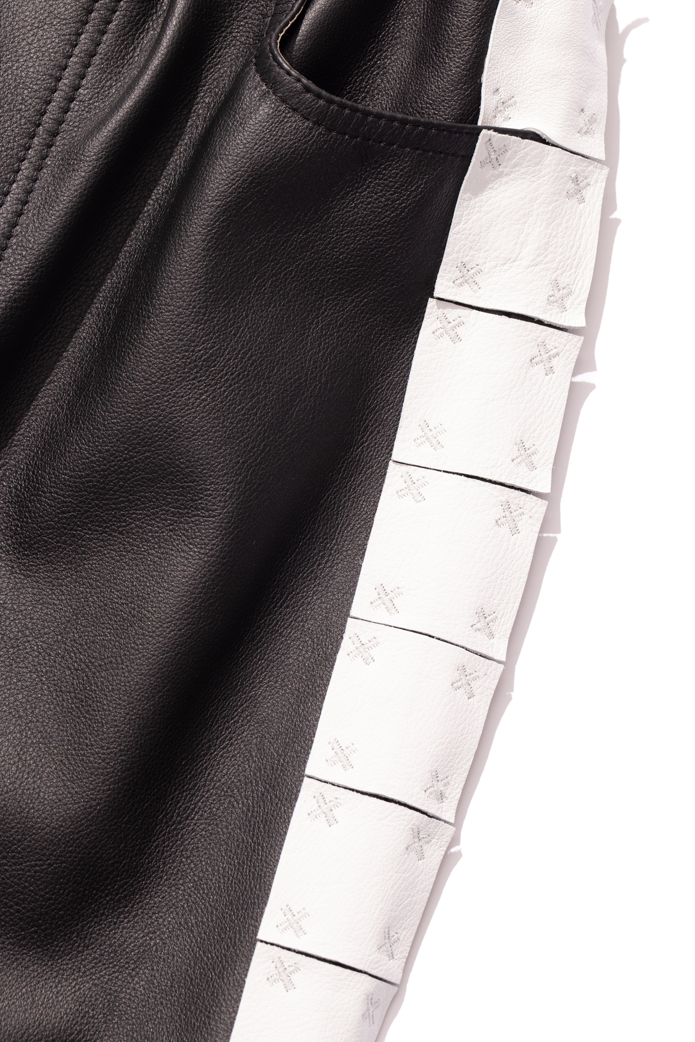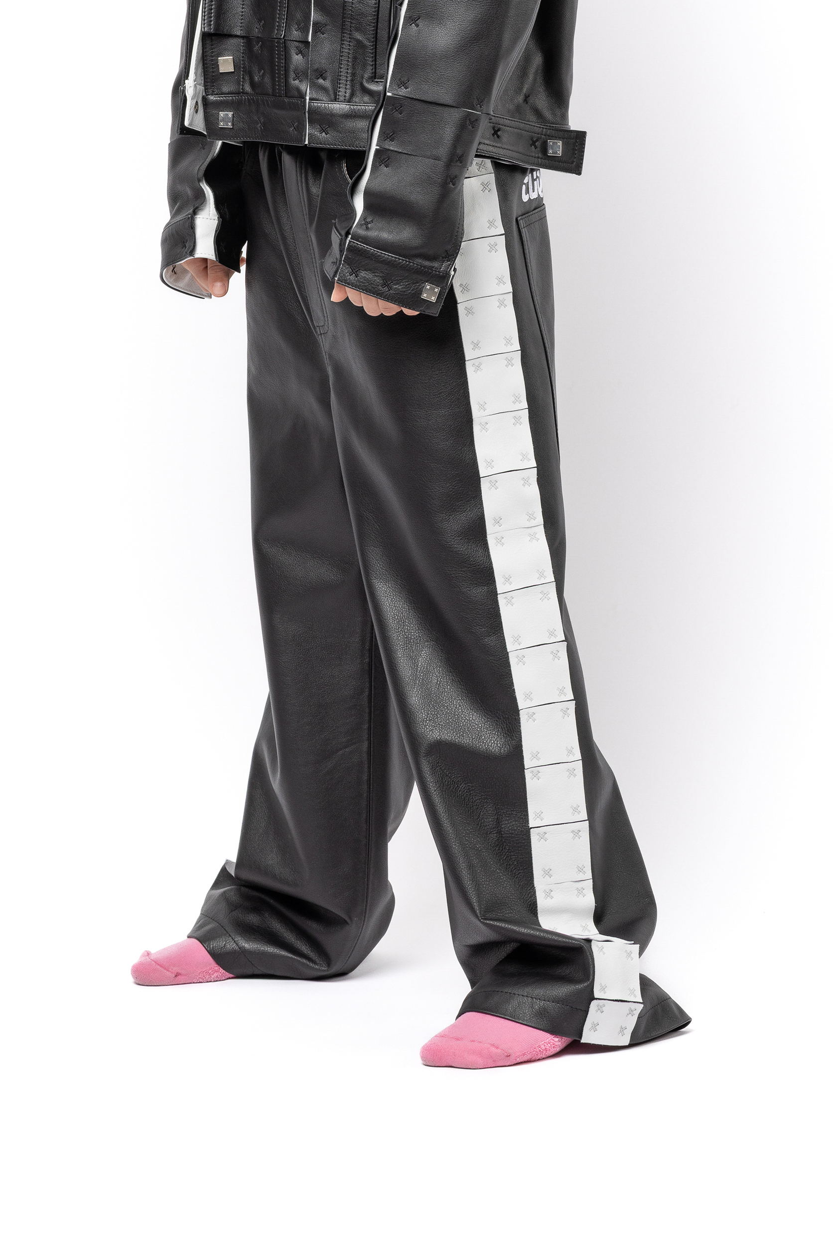 The brand's take on luxury lounge pants, blending a leisure-focused aesthetic with grunge & motorcycle detailing. Comes in a loose, elongated, slightly flared cut. Made from 100% Italian Bovina leather with "3D" patch side stripes, an elongated removable back pocket, a classic 5-pocket structure, and a silk elastic waistband insert resembling a boxer short. Features multiple embroidered, patched, and printed graphic motifs throughout.