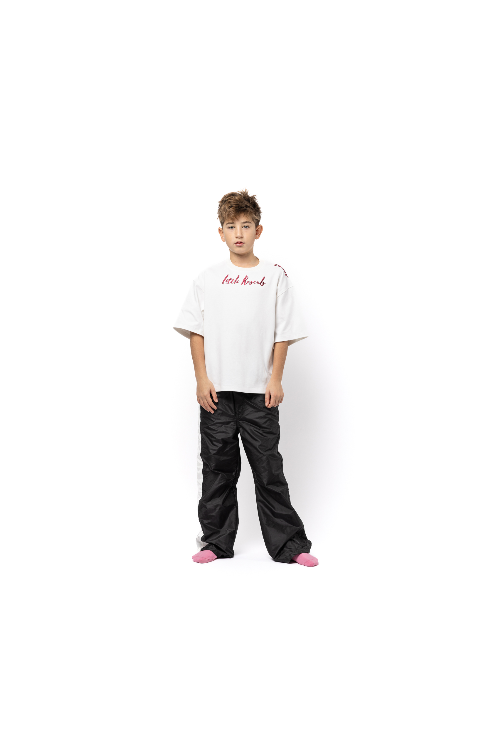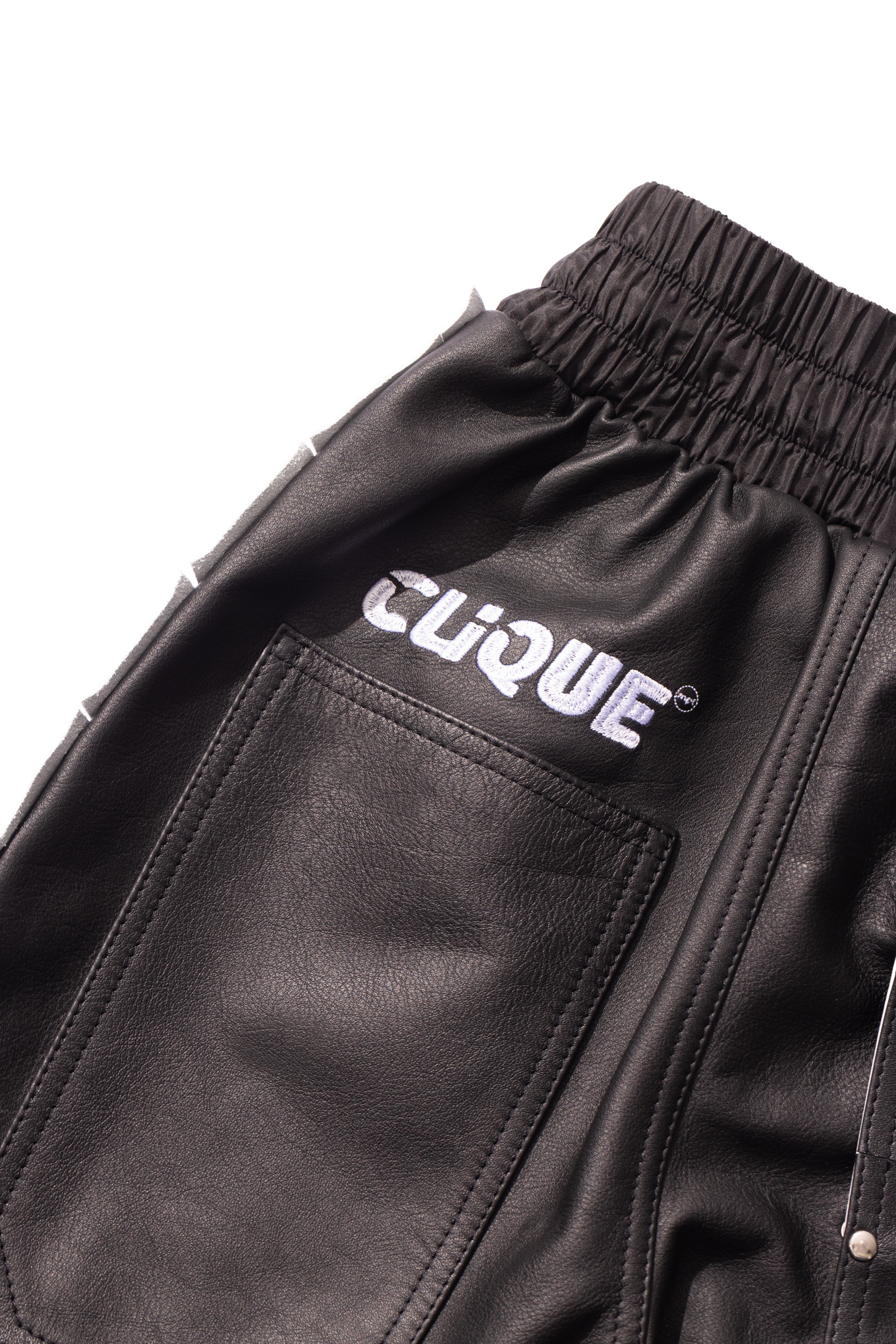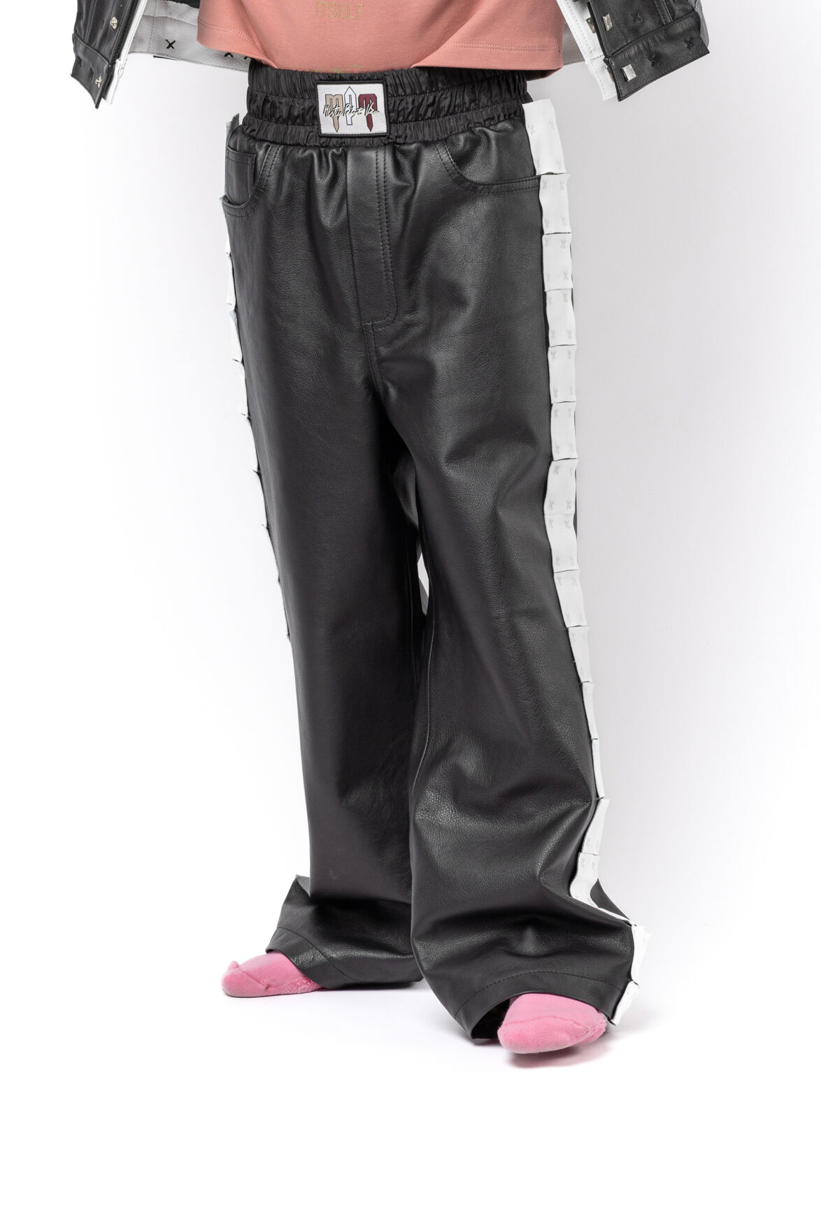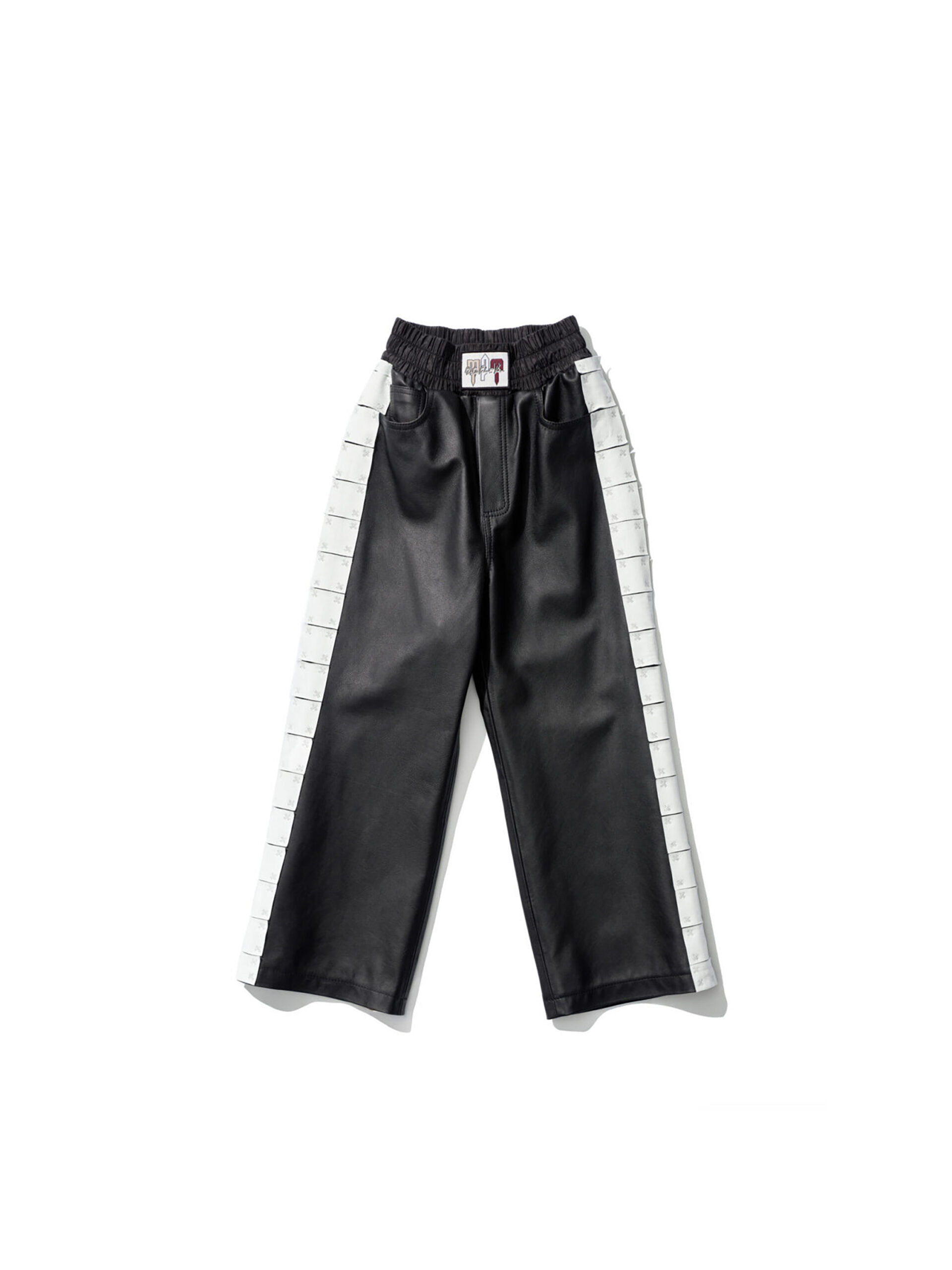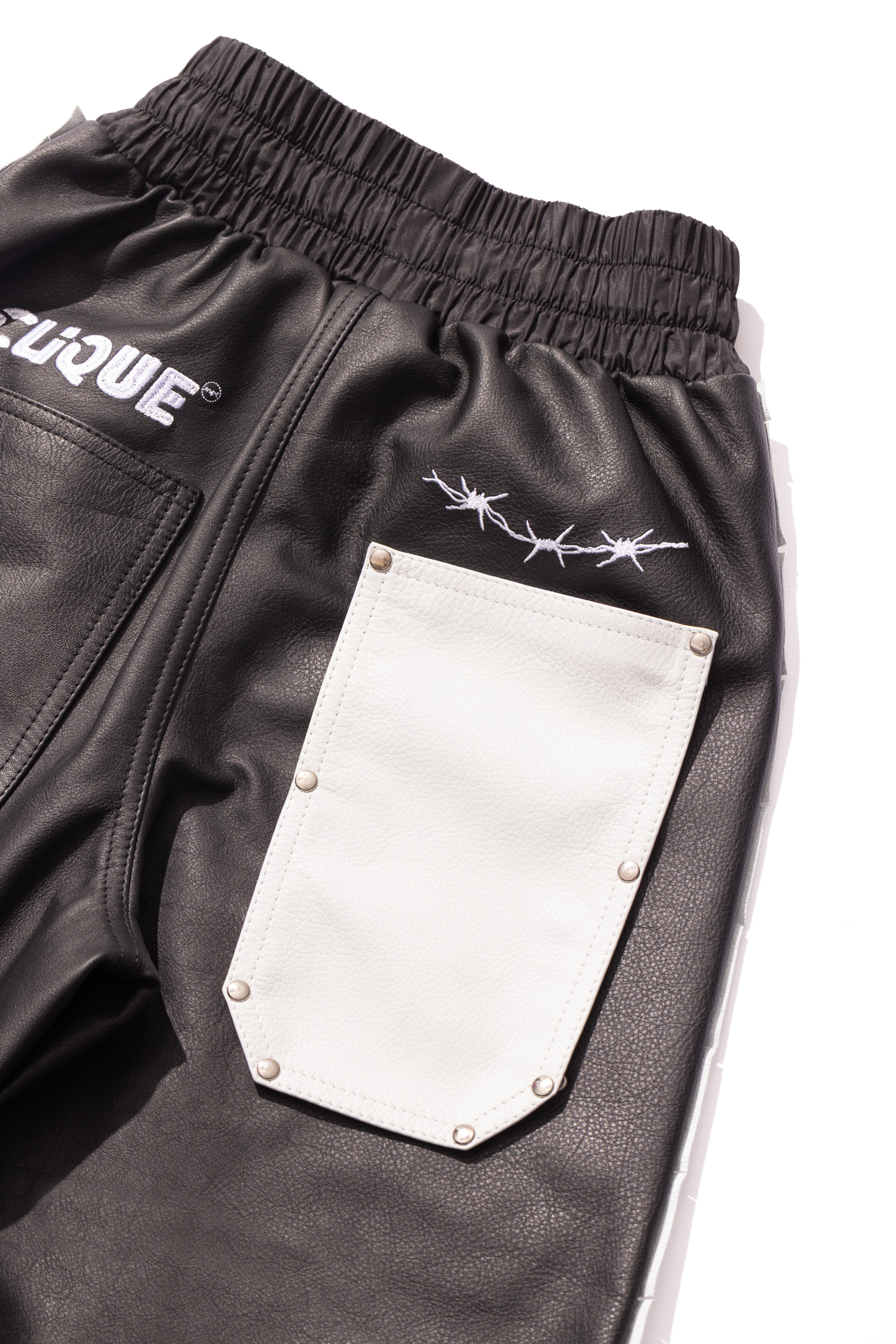 The brand's take on luxury lounge pants, blending a leisure-focused aesthetic with grunge & motorcycle detailing. Comes in a loose, elongated, slightly flared cut. Made from 100% Italian Bovina leather with "3D" patch side stripes, an elongated removable back pocket, a classic 5-pocket structure, and a silk elastic waistband insert resembling a boxer short. Features multiple embroidered, patched, and printed graphic motifs throughout.