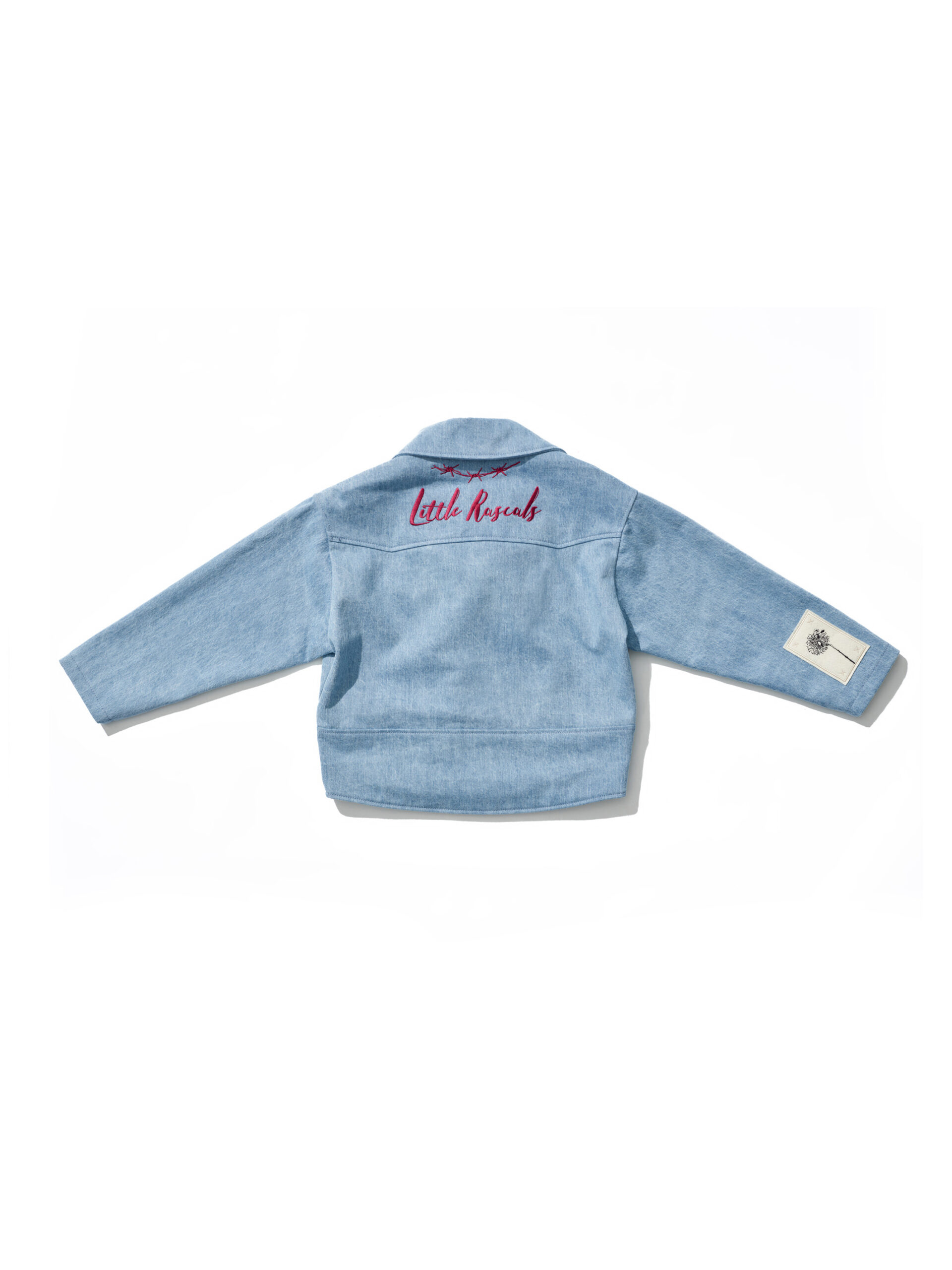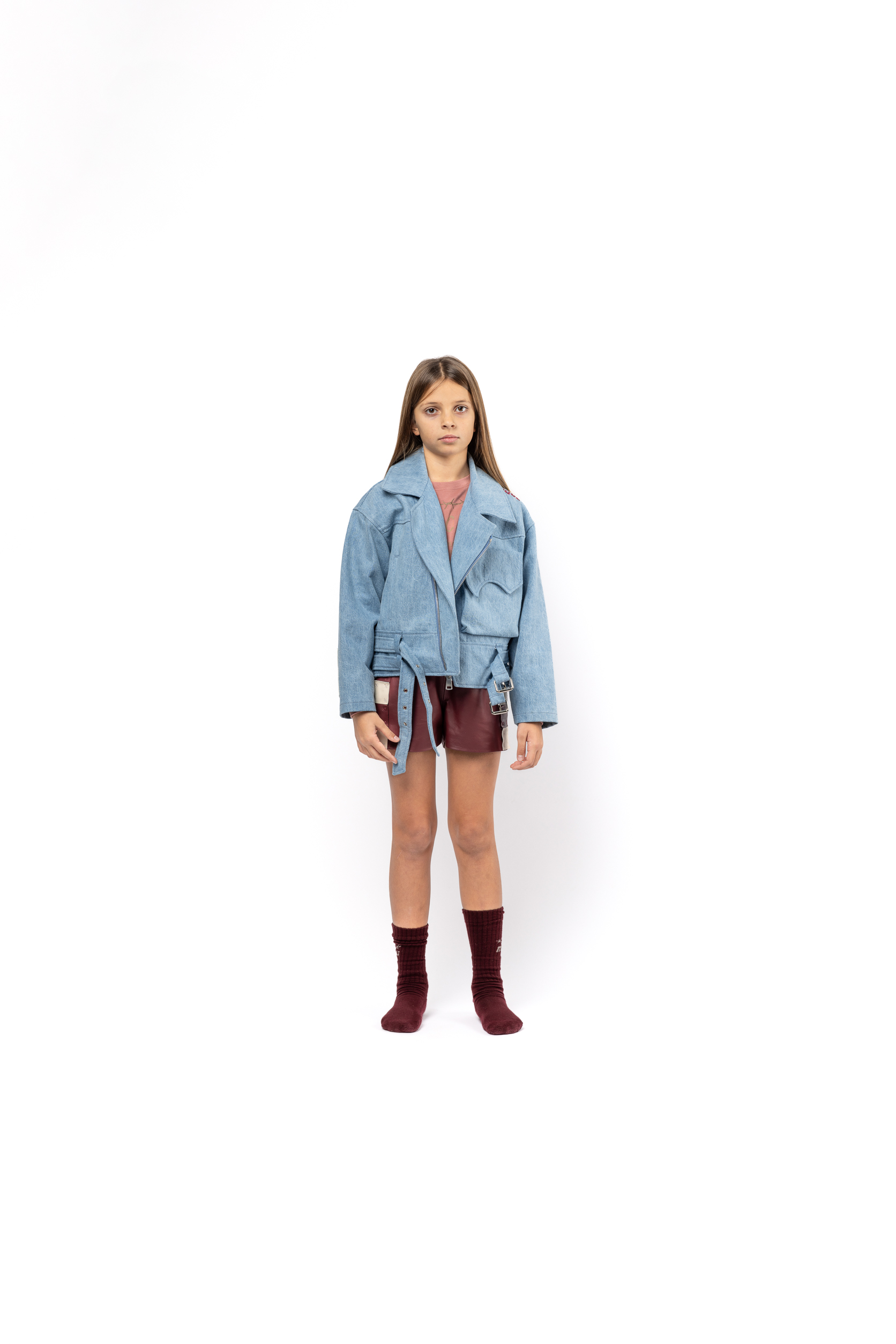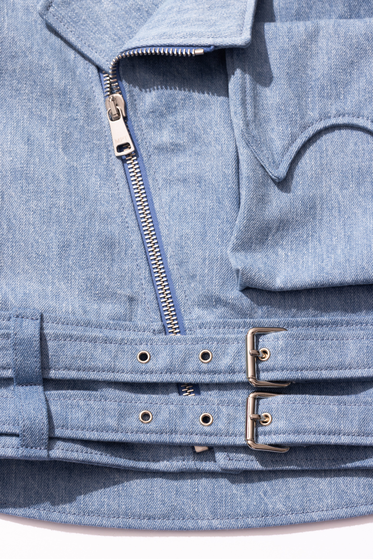 The "Jr." addition symbolizes the garment's shrinking to accommodate even the youngest of wearers. An oversized biker jacket featuring exaggerated versions of typical moto details with biker lapels, a double waistbelt and reinforced back panels, with an oversized external storage pouch. Made from high count Italian denim with a soft, breathable cupro lining and heavy-duty hardware.