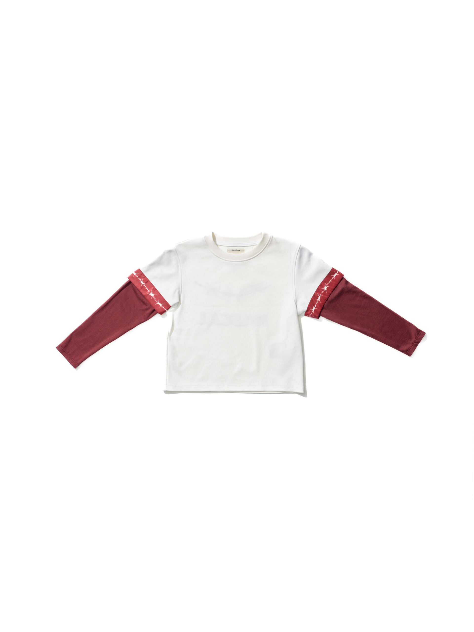 The "Jr." addition symbolizes the garment's shrinking to accommodate even the youngest of wearers. A substantially boxy-fitting, cropped-length long-sleeve t-shirt, featuring a cotton/silk blend long sleeve insert, resembling two layered t-shirts, a 90s staple. Short-sleeve body is made from 100% Italian interlock cotton, the inserts are made of an extra fine cotton/silk blend. Also features multiple embroidered motifs throughout