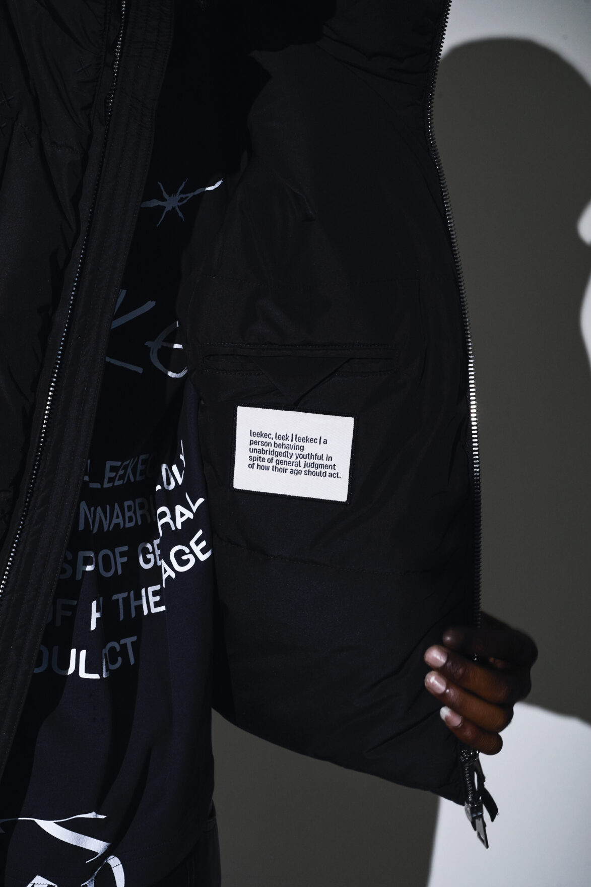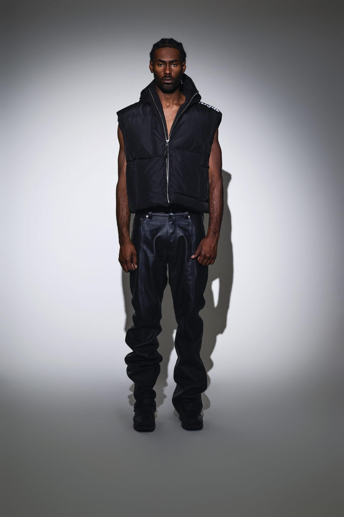 A regular-fitting down sleeveless vest with a slightly cropped length and slightly exaggerated shoulders. Made from 100% Italian nylon weave with a real down filling and a protective hood. Utilizes the brand's signature "3D" texture in an asymmetric "mosaic" structure. Comes with multiple printed motifs throughout.