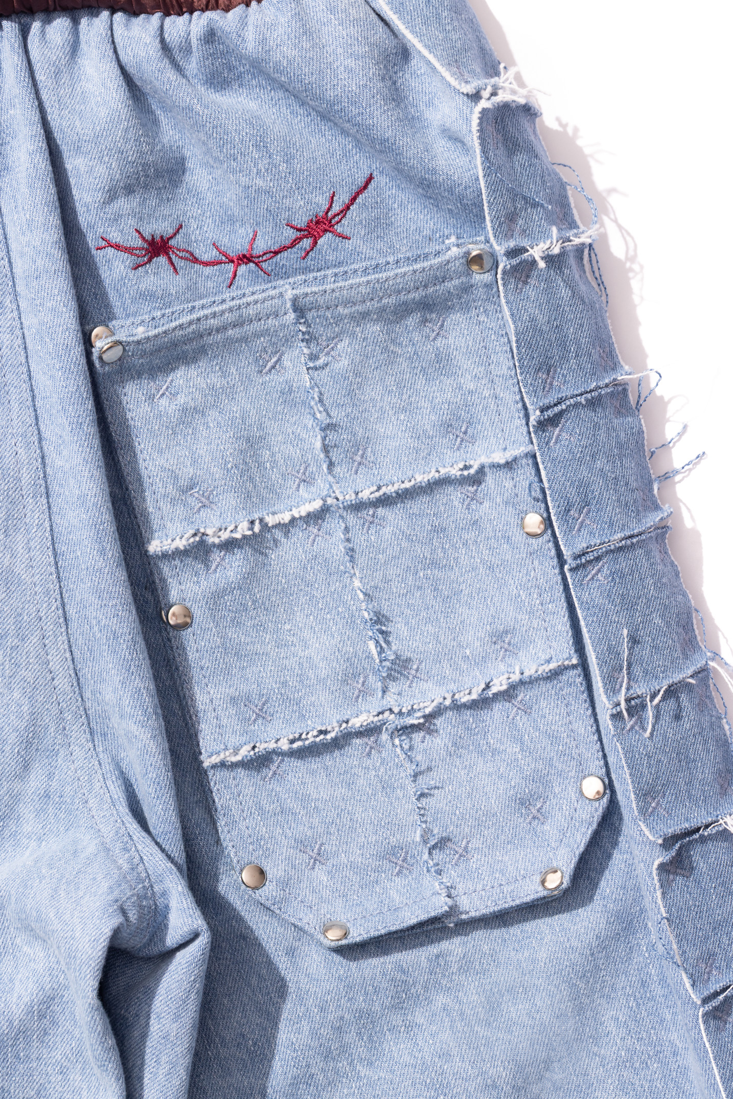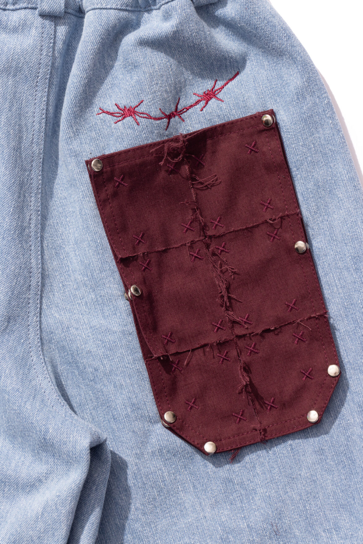 A pair of sturdy denim pants featuring a performance-inspired silk waist insert along with a removable back pocket, side stripes and multiple printed, patched and embroidered motifs throughout. Inspired by 90s tennis equipment and working out in denim, focused to showcase a uniform look.