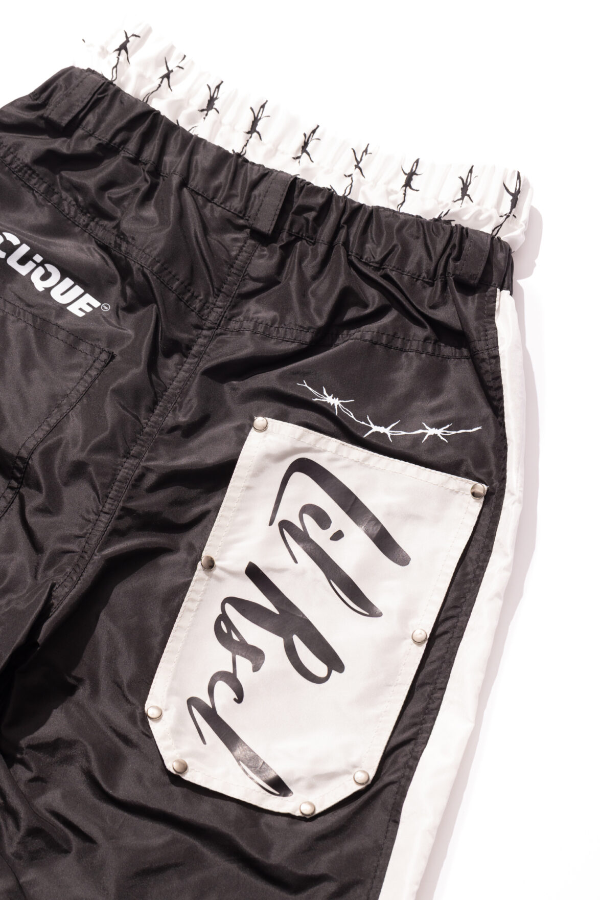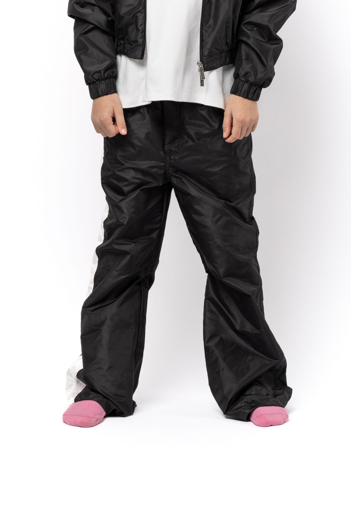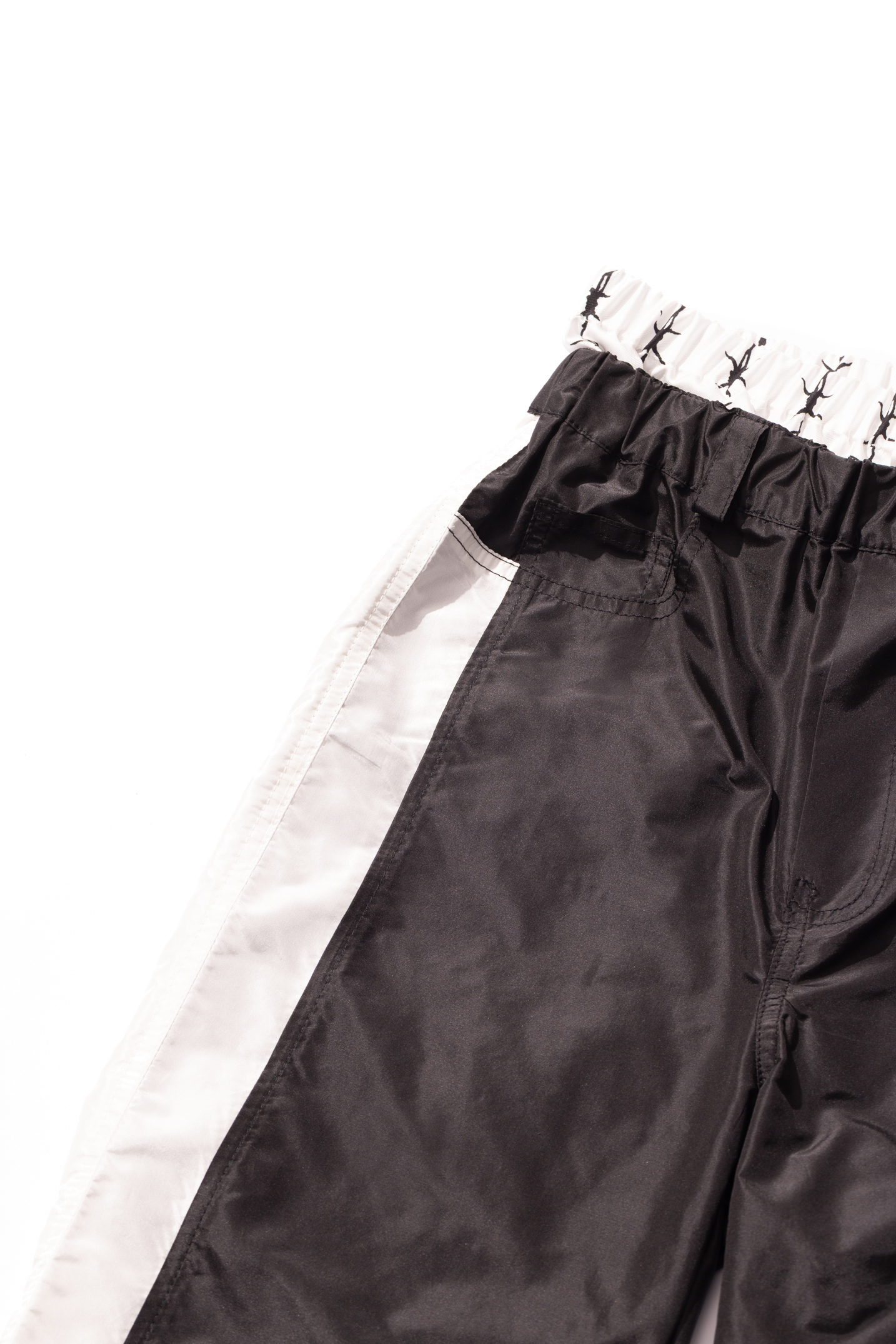 A pair of flowy, light sports trousers made from a high-sheen Italian silk, featuring a performance-inspired silk boxer short waist insert along with a removable elongated back pocket, side stripes and multiple printed motifs throughout. Inspired by 90s tennis equipment, focused to showcase a uniform look.