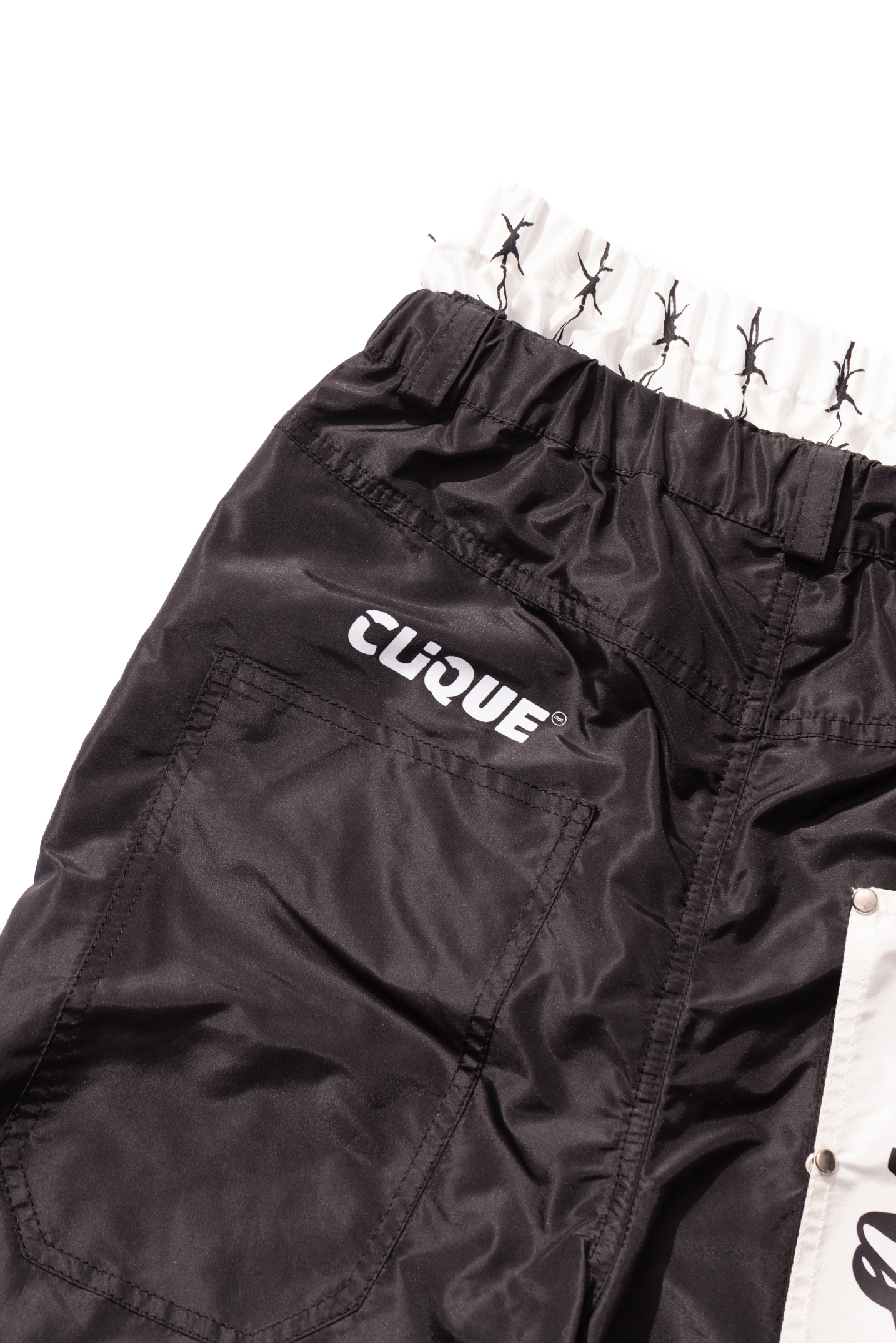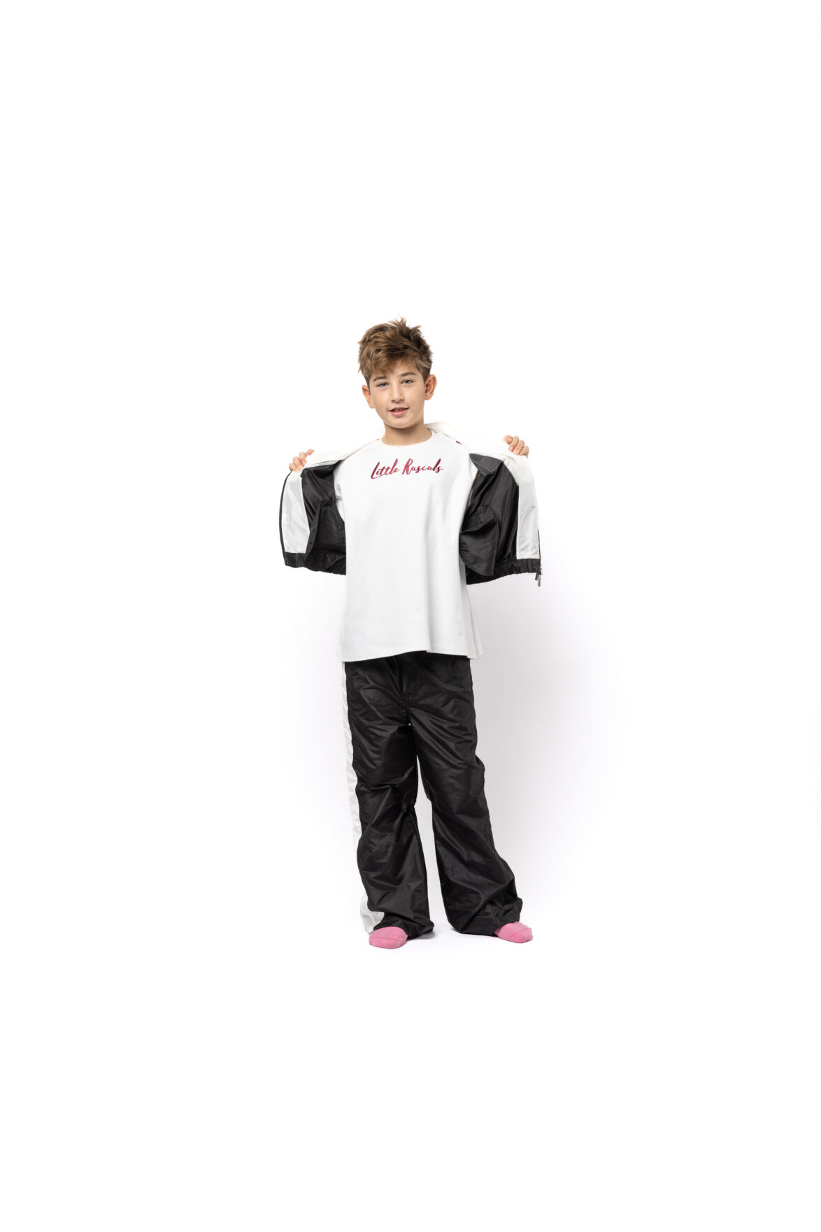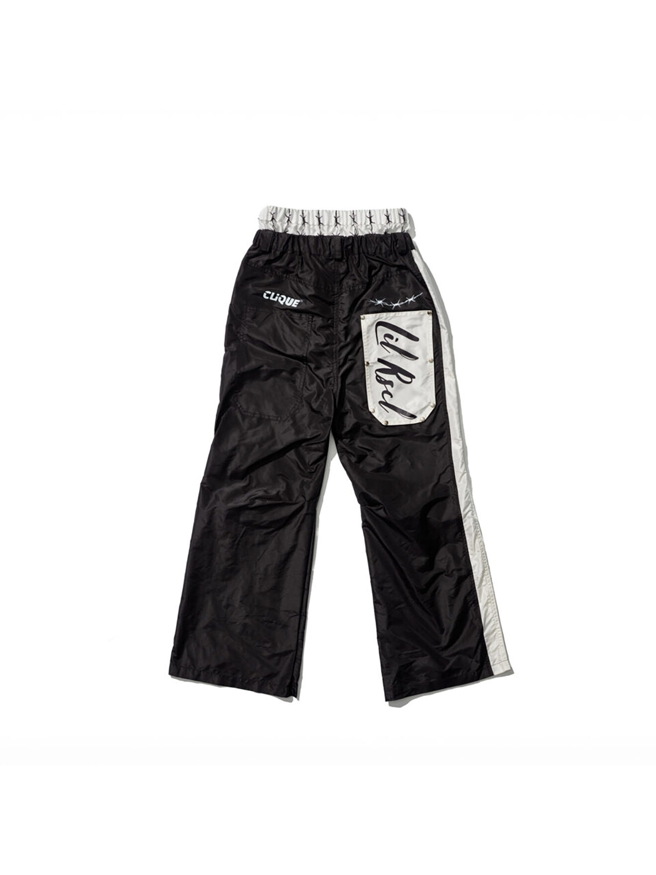 A pair of flowy, light sports trousers made from a high-sheen Italian silk, featuring a performance-inspired silk boxer short waist insert along with a removable elongated back pocket, side stripes and multiple printed motifs throughout. Inspired by 90s tennis equipment, focused to showcase a uniform look.