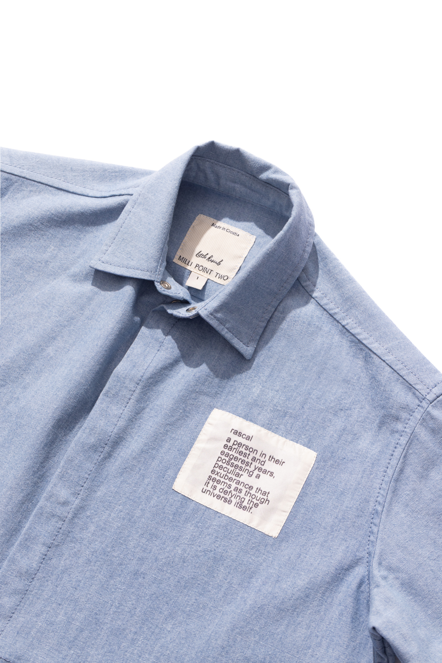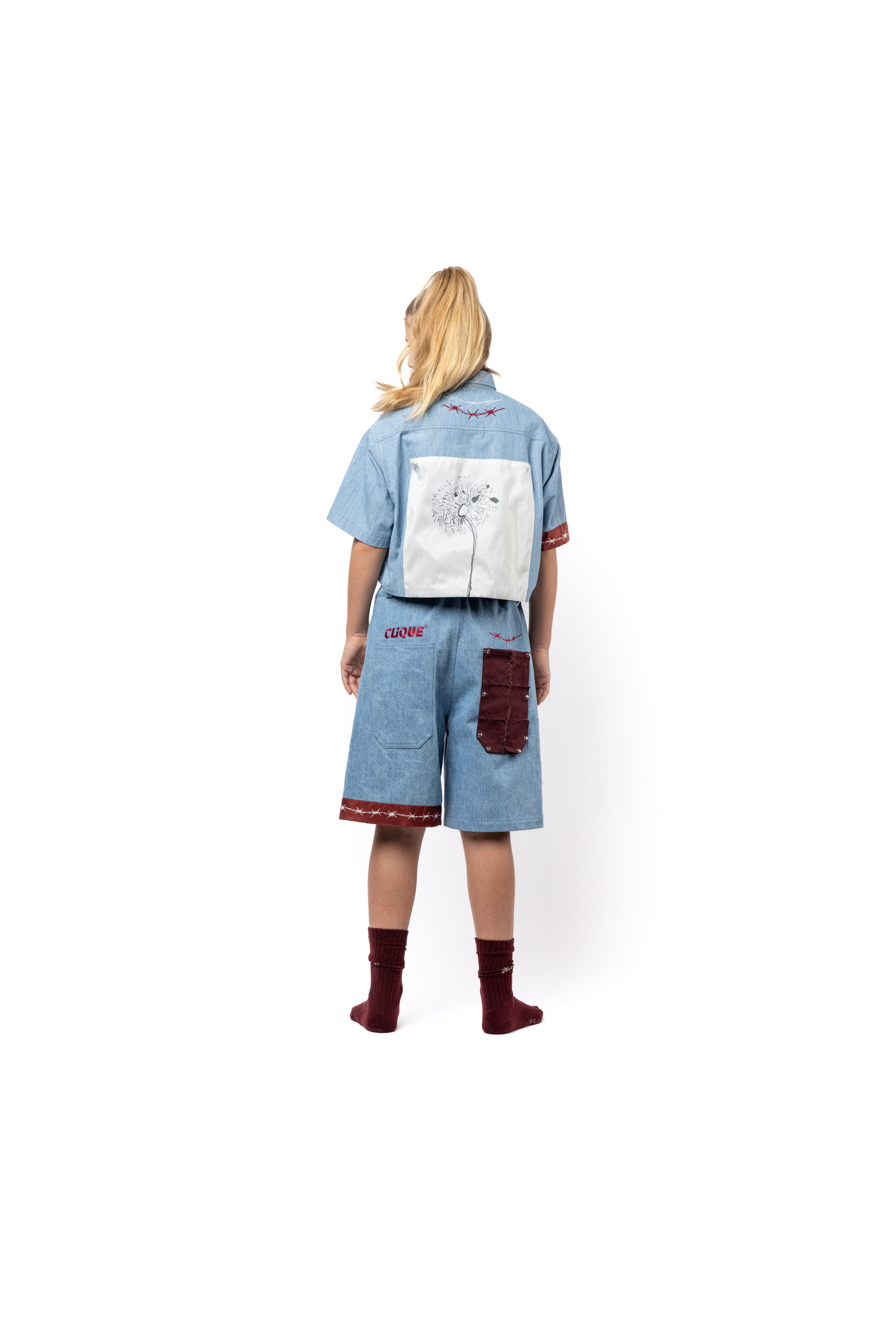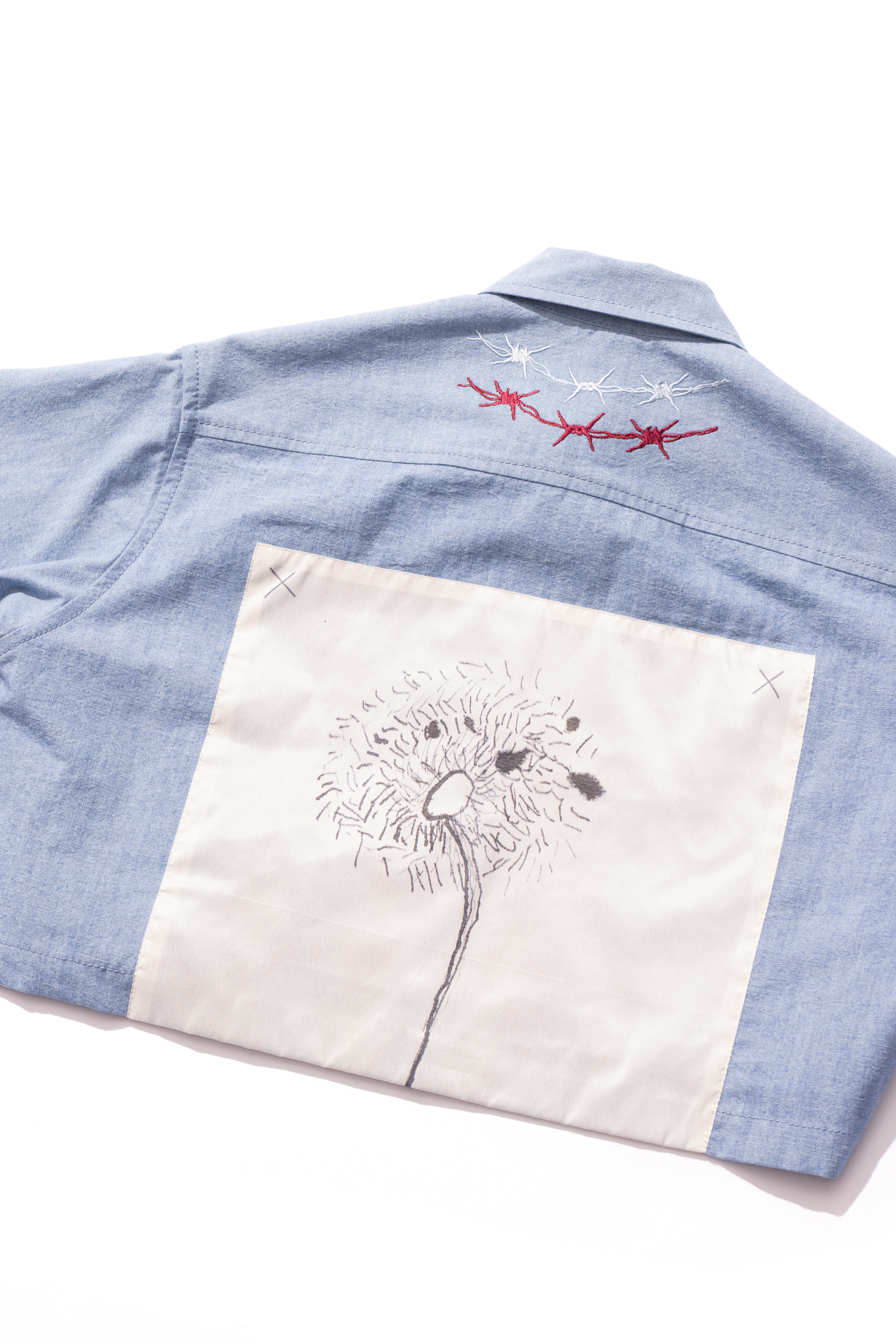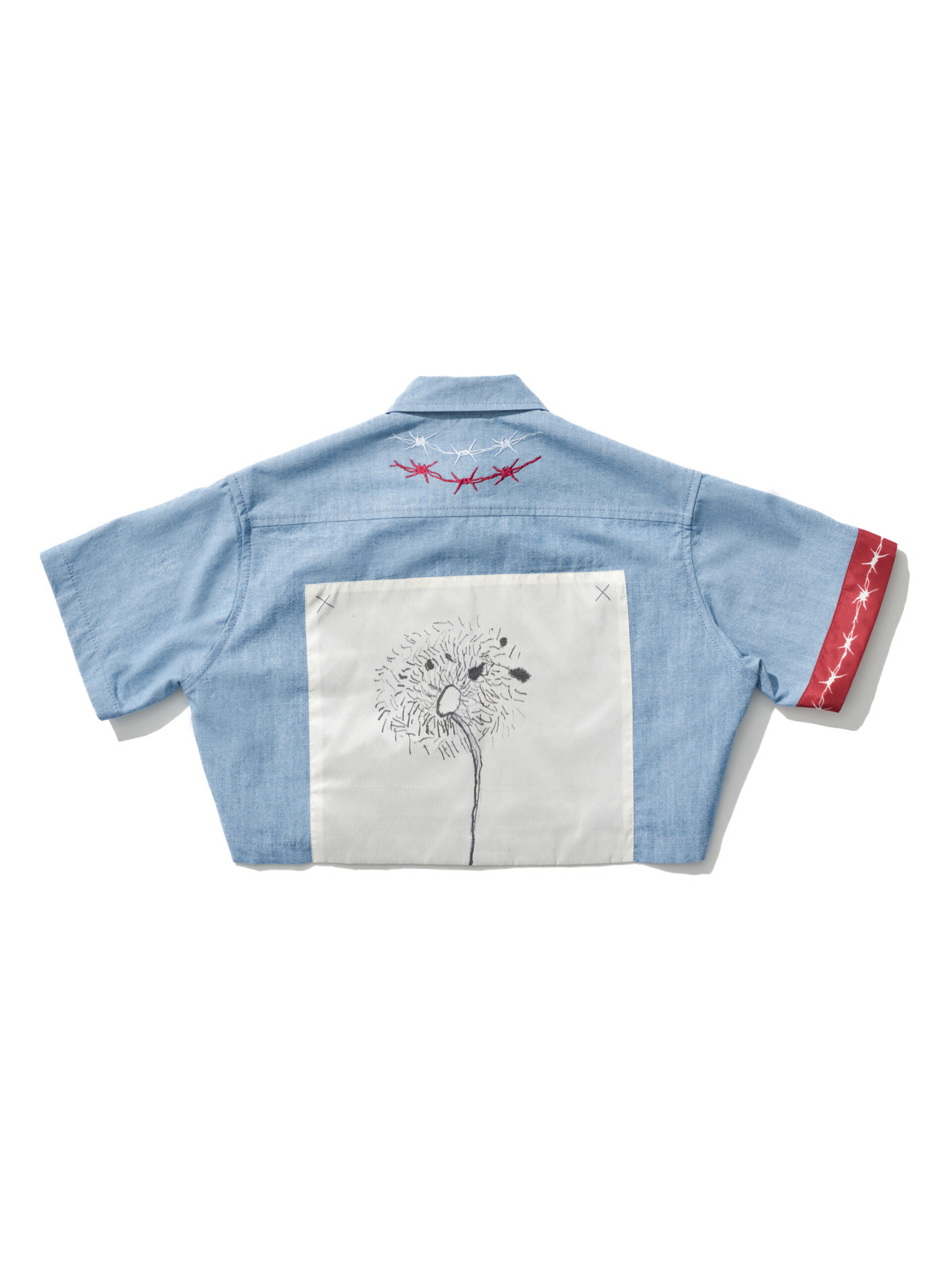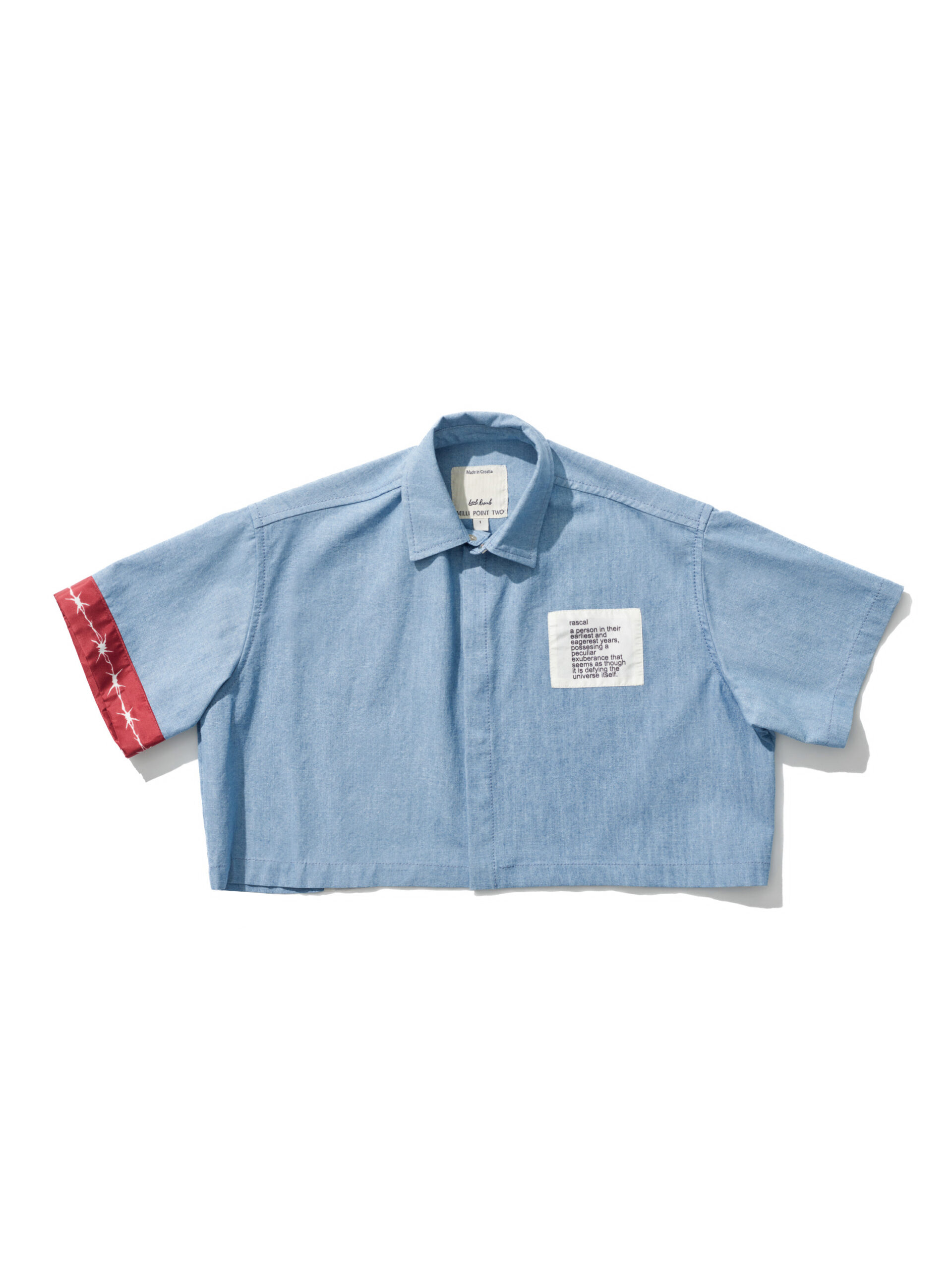 An exclusive to the youngest audience, the Minute Taker shirt is a play on operative labourers and features a cropped, wide silhouette accompanied by various motifs applied as patches and embroideries, with the maxi graphic being drawn by Tomo's own son.