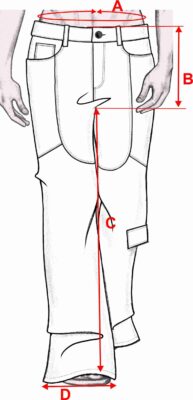 - 5-pocket structure with removable backpockets and a storage pocket on the calf