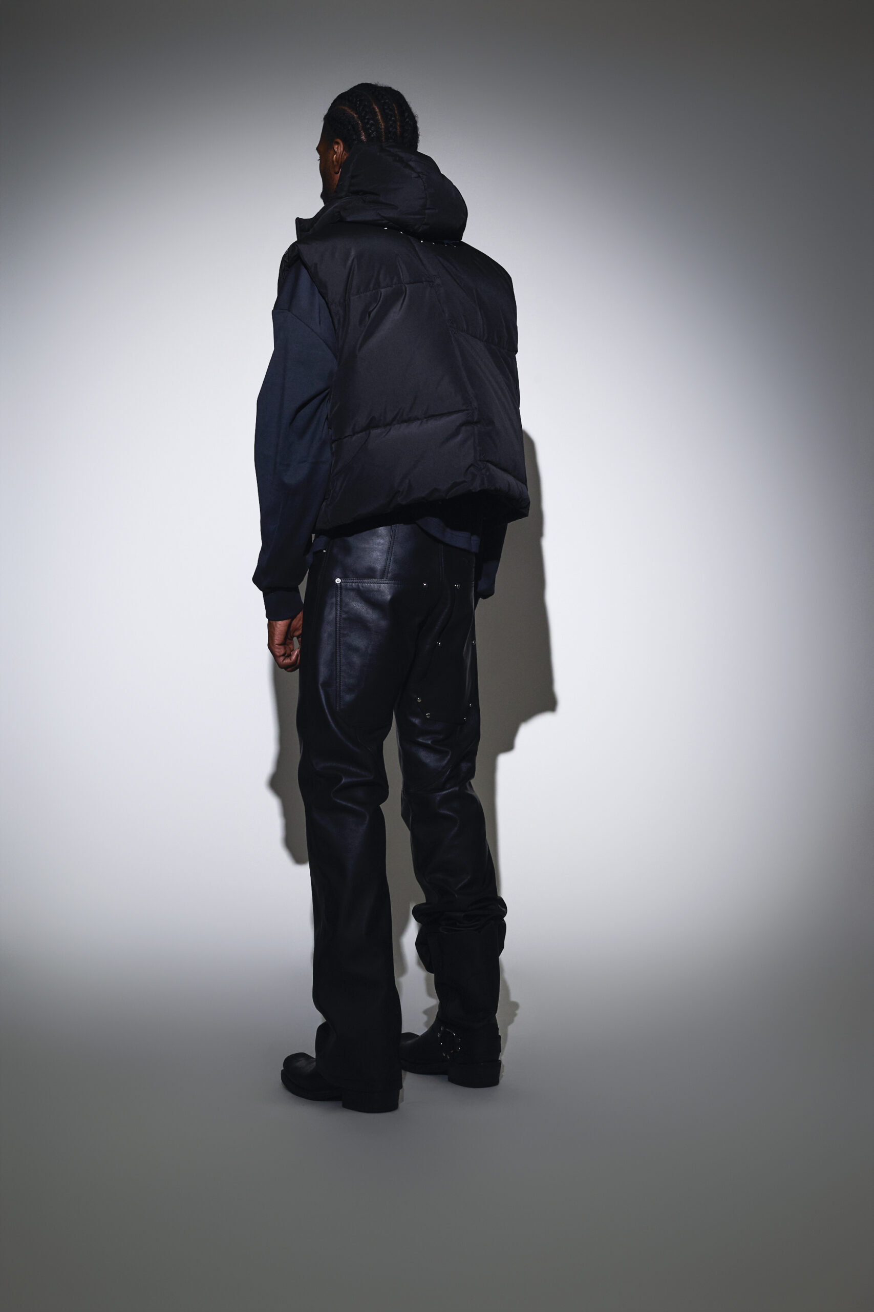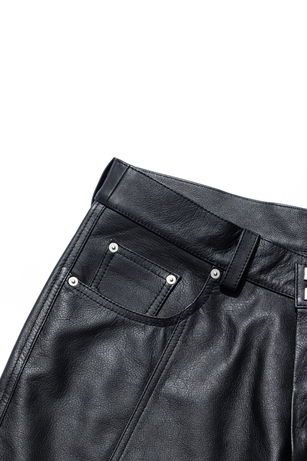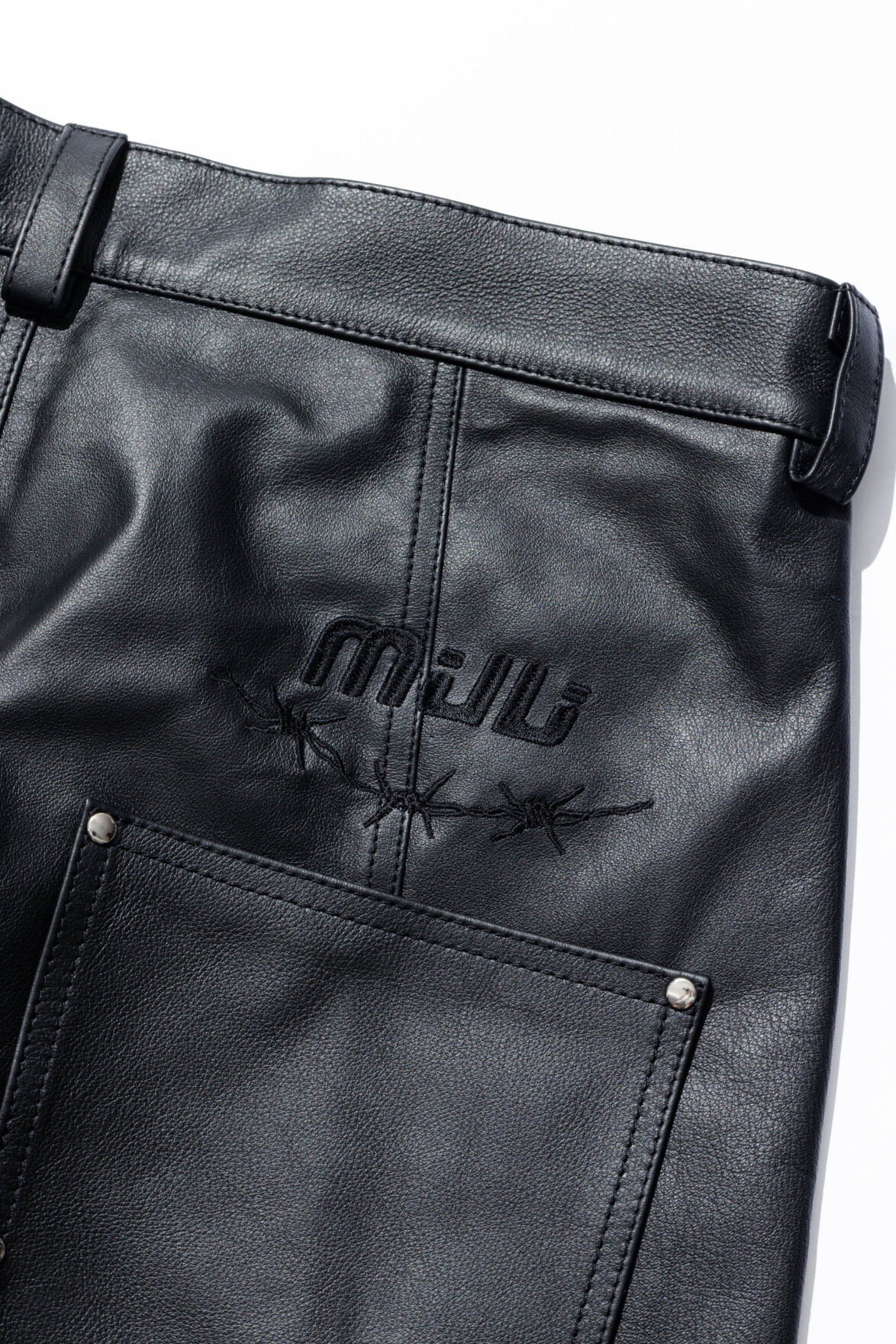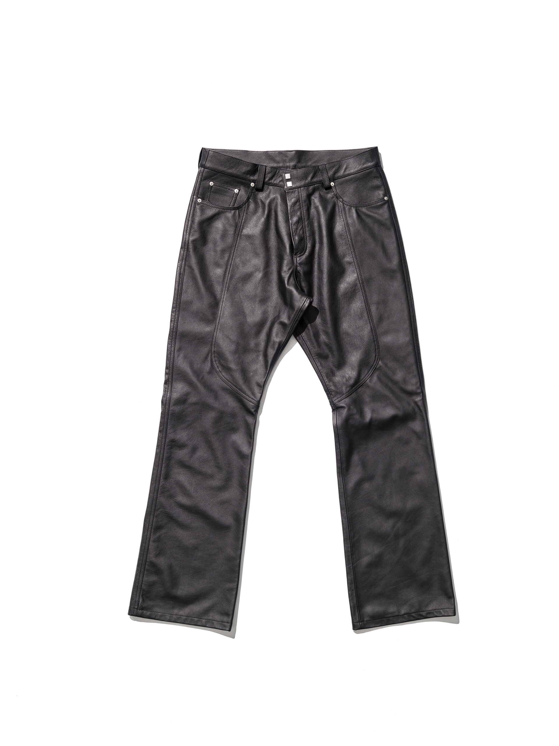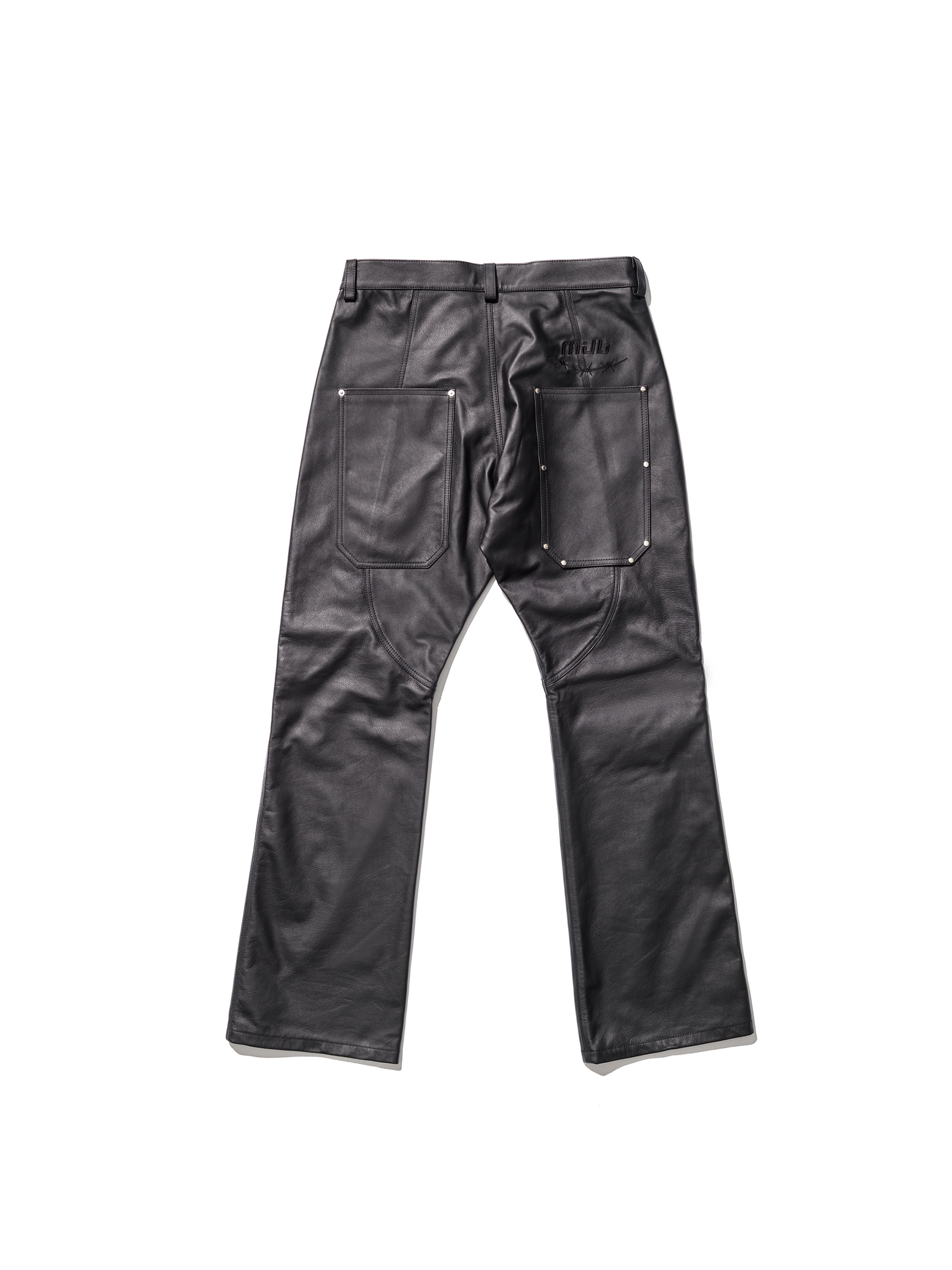 A pair of leather motocross pants with a loose bootcut fit similar to cuts prominent in 90s hip-hop culture. Features reinforcements on the knees and crotch, a zip fly, and an asymmetric storage pocket on the calf. Made from Italian Bovina leather. Also features a branded silk waistband insert. Comes with signature branding and an interchangeable back pocket.