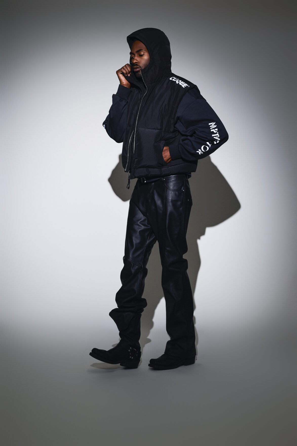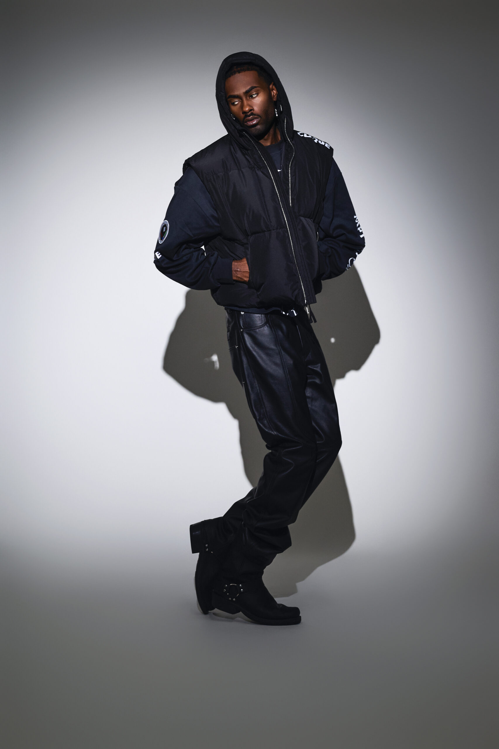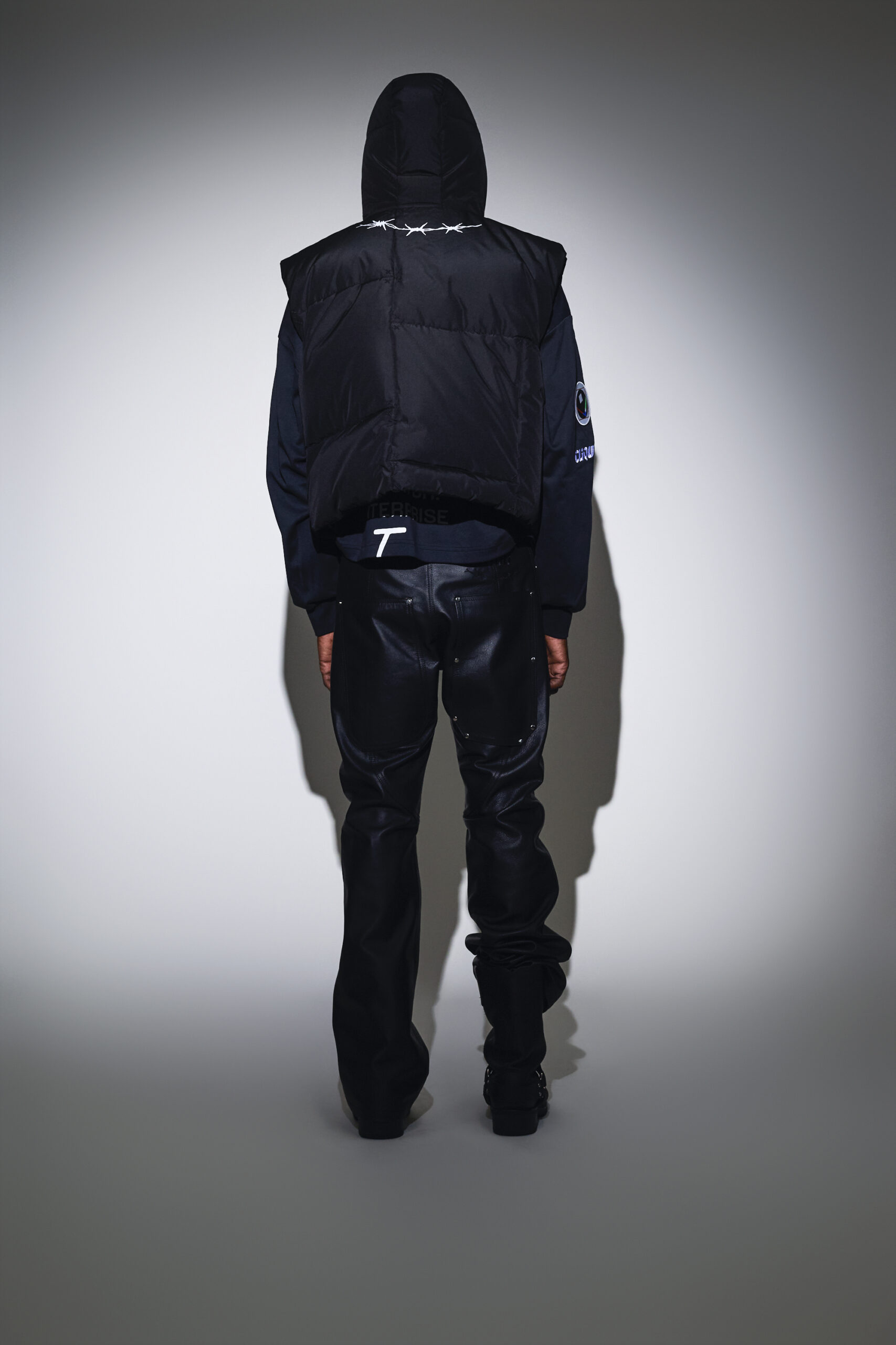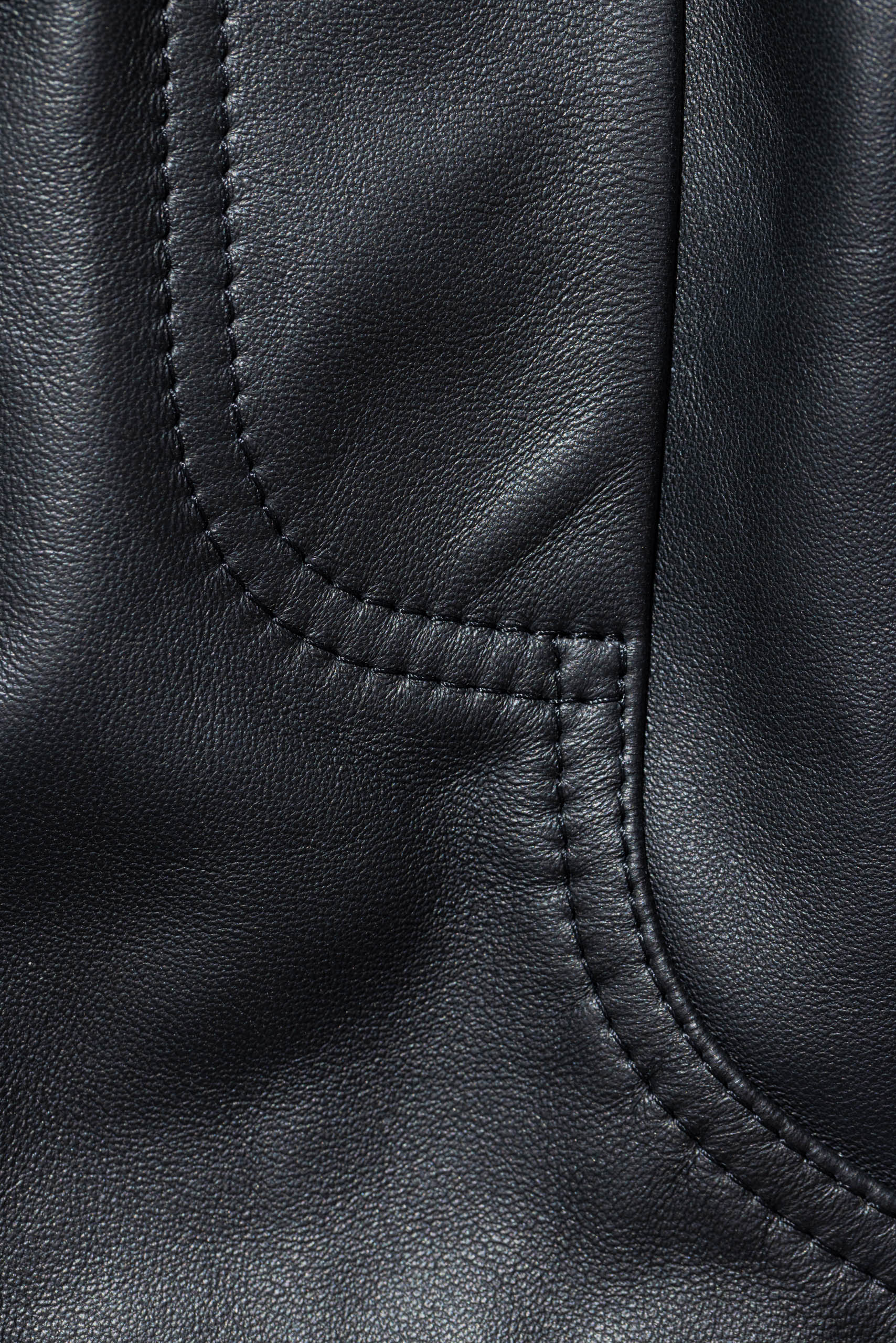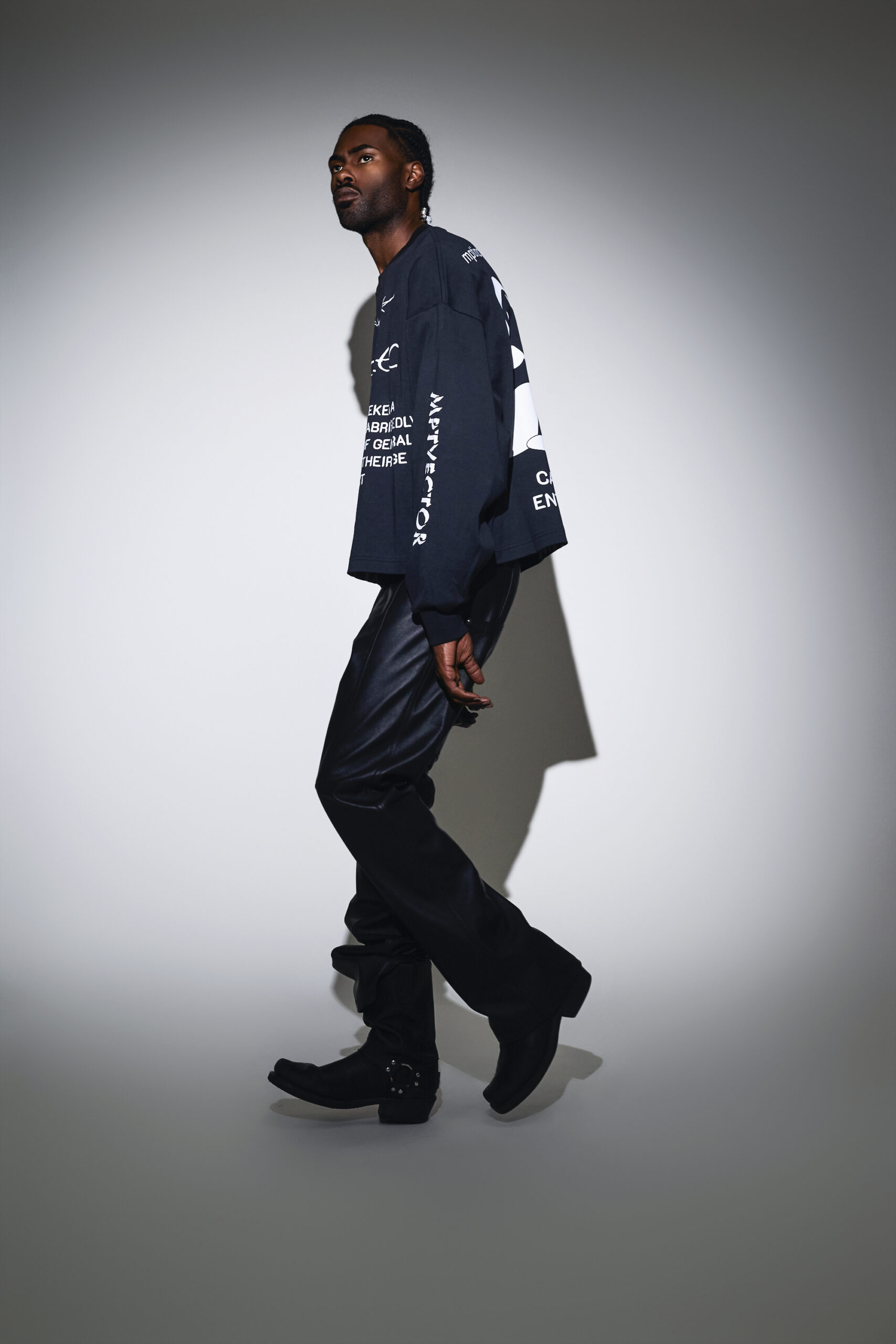 A pair of leather motocross pants with a loose bootcut fit similar to cuts prominent in 90s hip-hop culture. Features reinforcements on the knees and crotch, a zip fly, and an asymmetric storage pocket on the calf. Made from Italian Bovina leather. Also features a branded silk waistband insert. Comes with signature branding and an interchangeable back pocket.