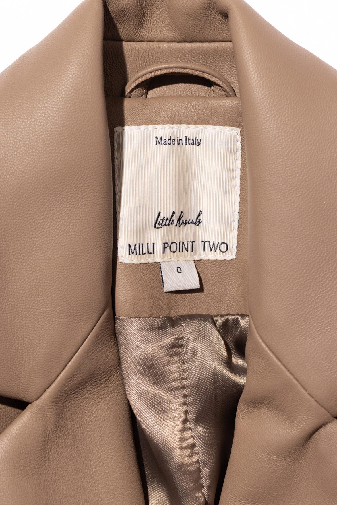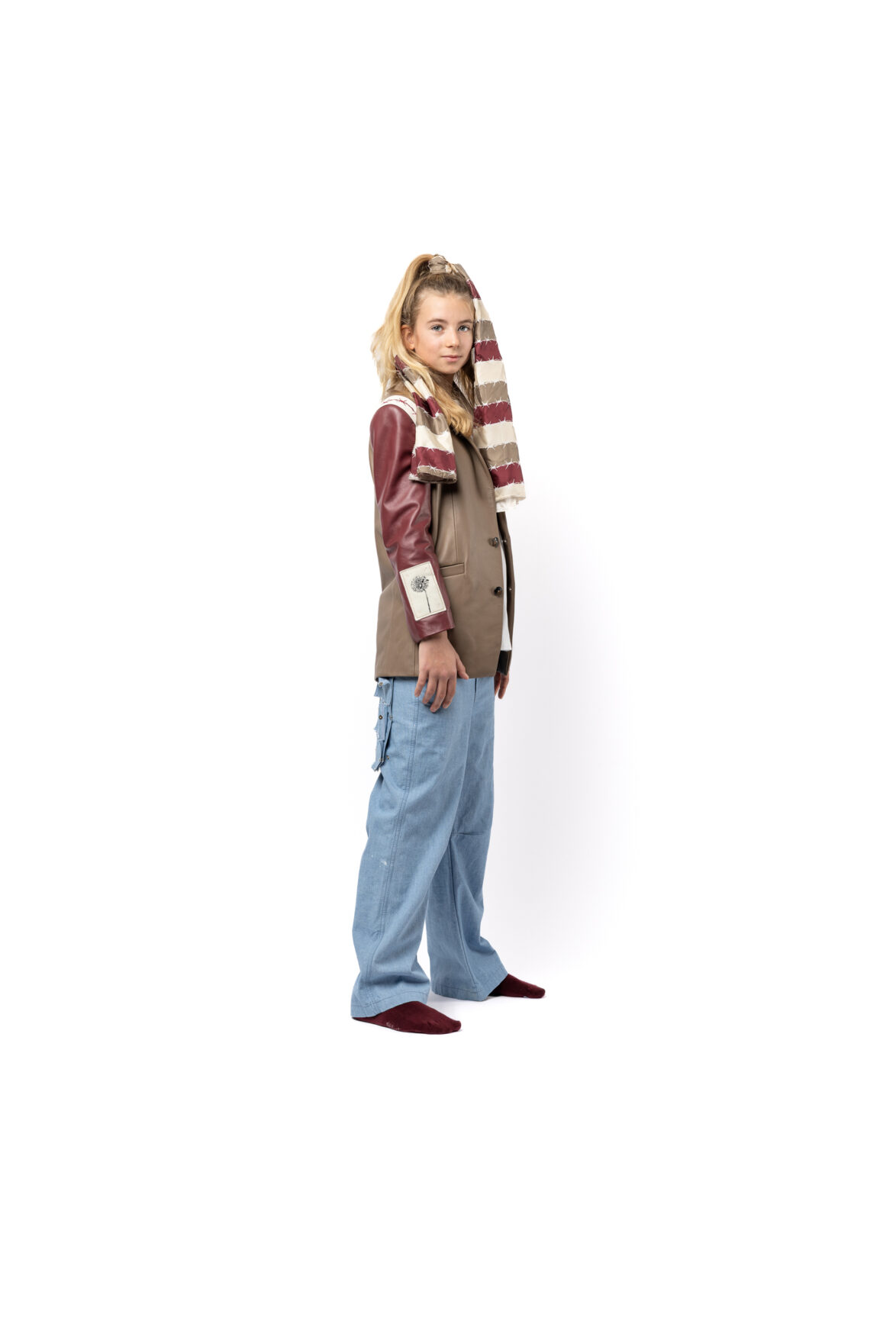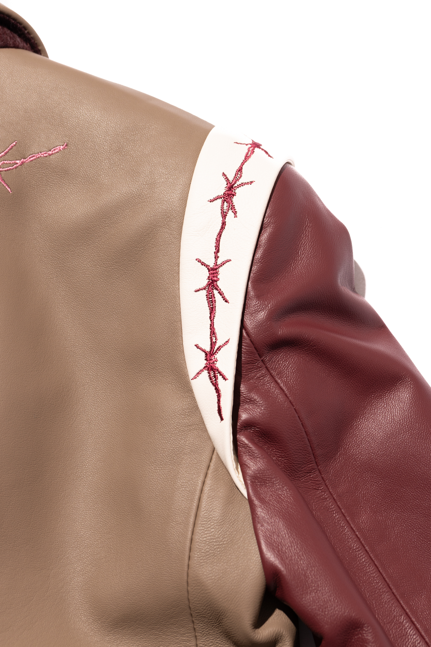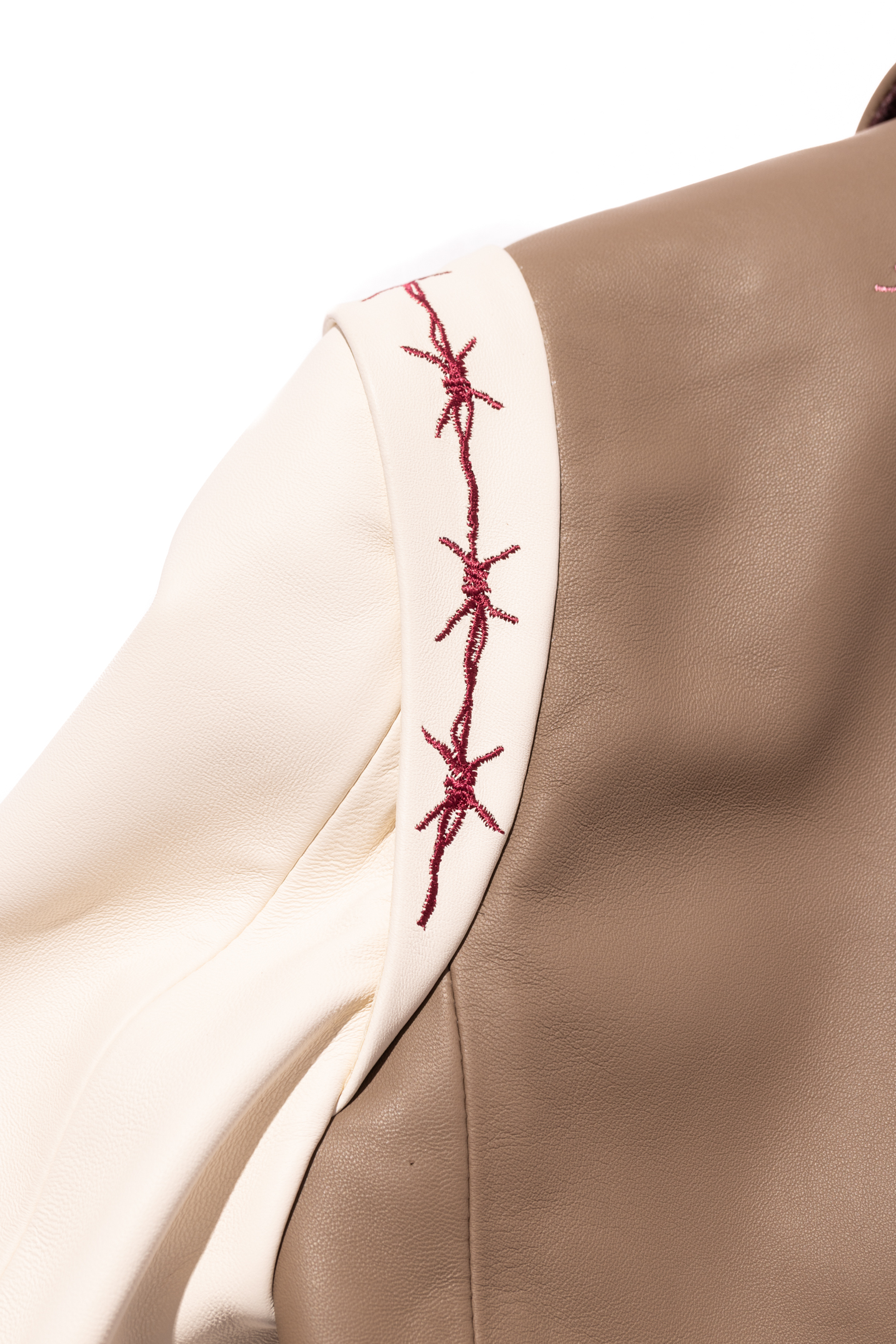 An oversized suit jacket with exaggerated shoulders, two-button closure and peak lapels. Inspired by 90s power suiting and featuring contrast coloured silk shoulder inserts along with embroideries and printed motifs throughout. Made from high grain Italian Bovina with a soft cupro lining.
