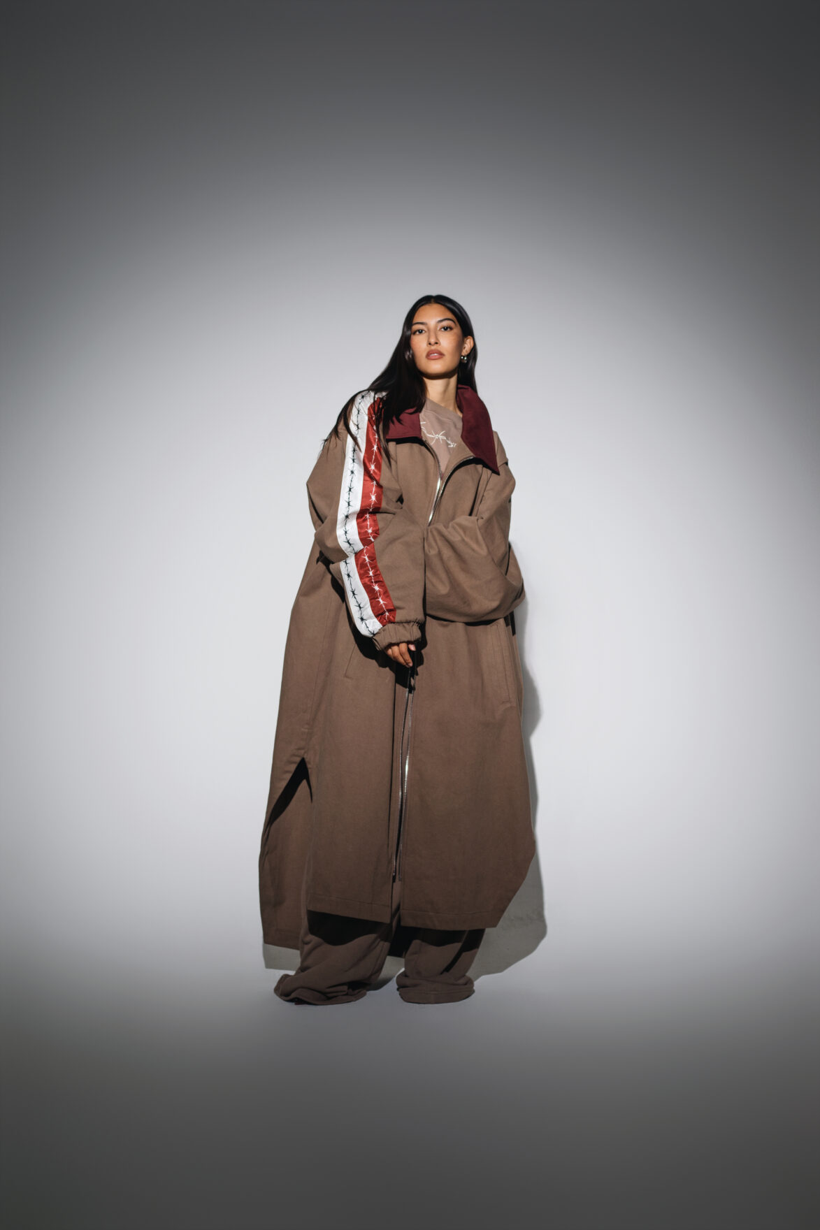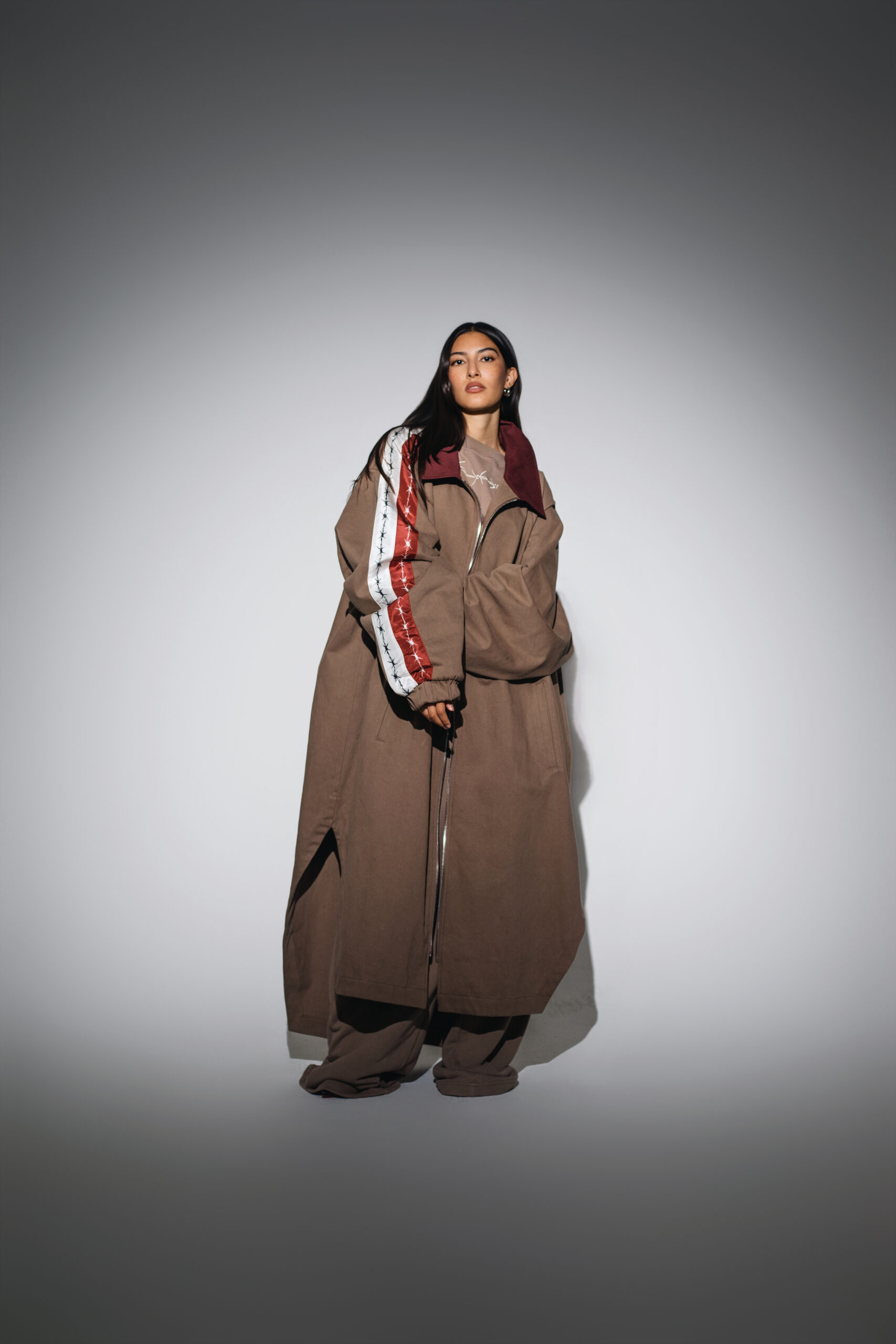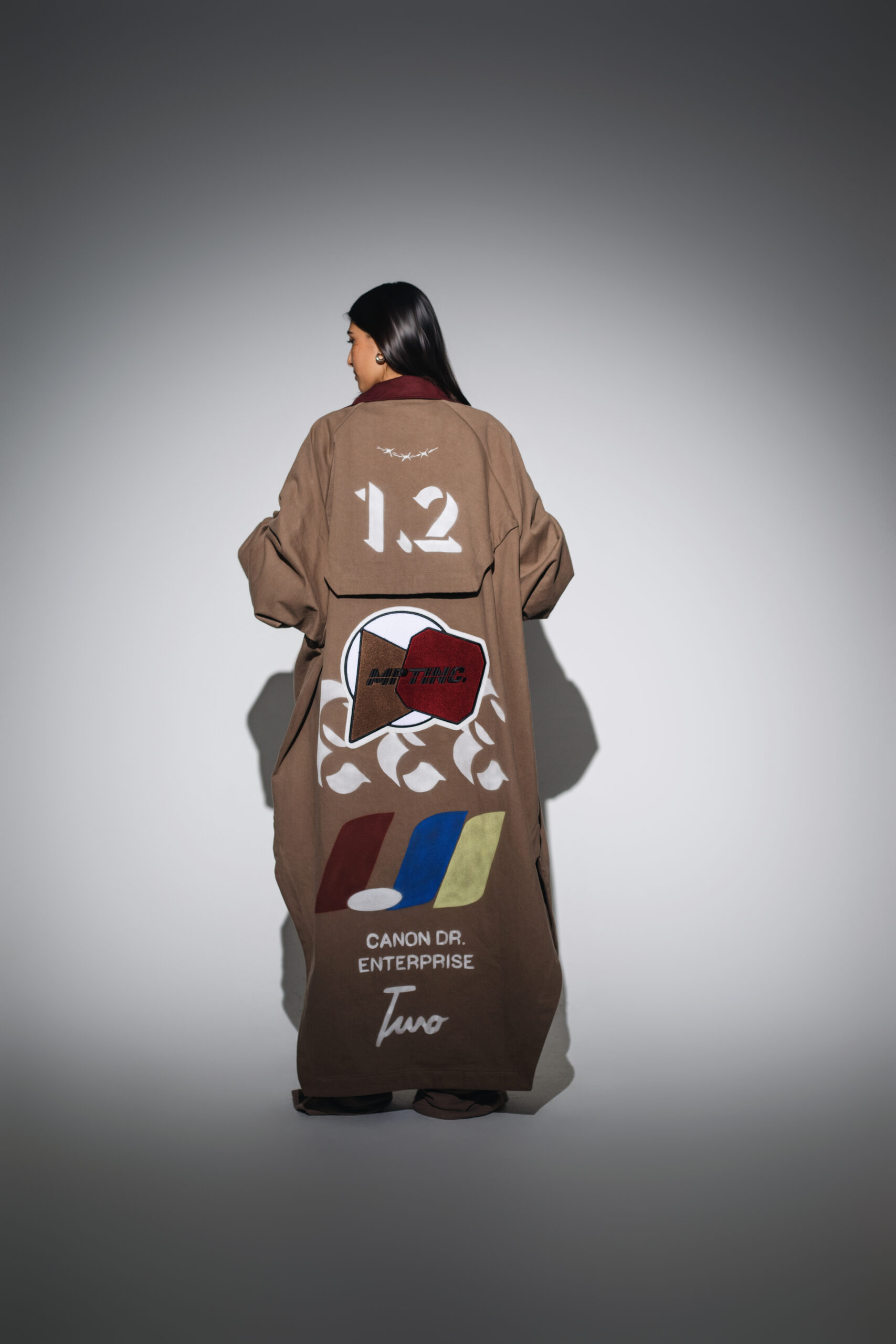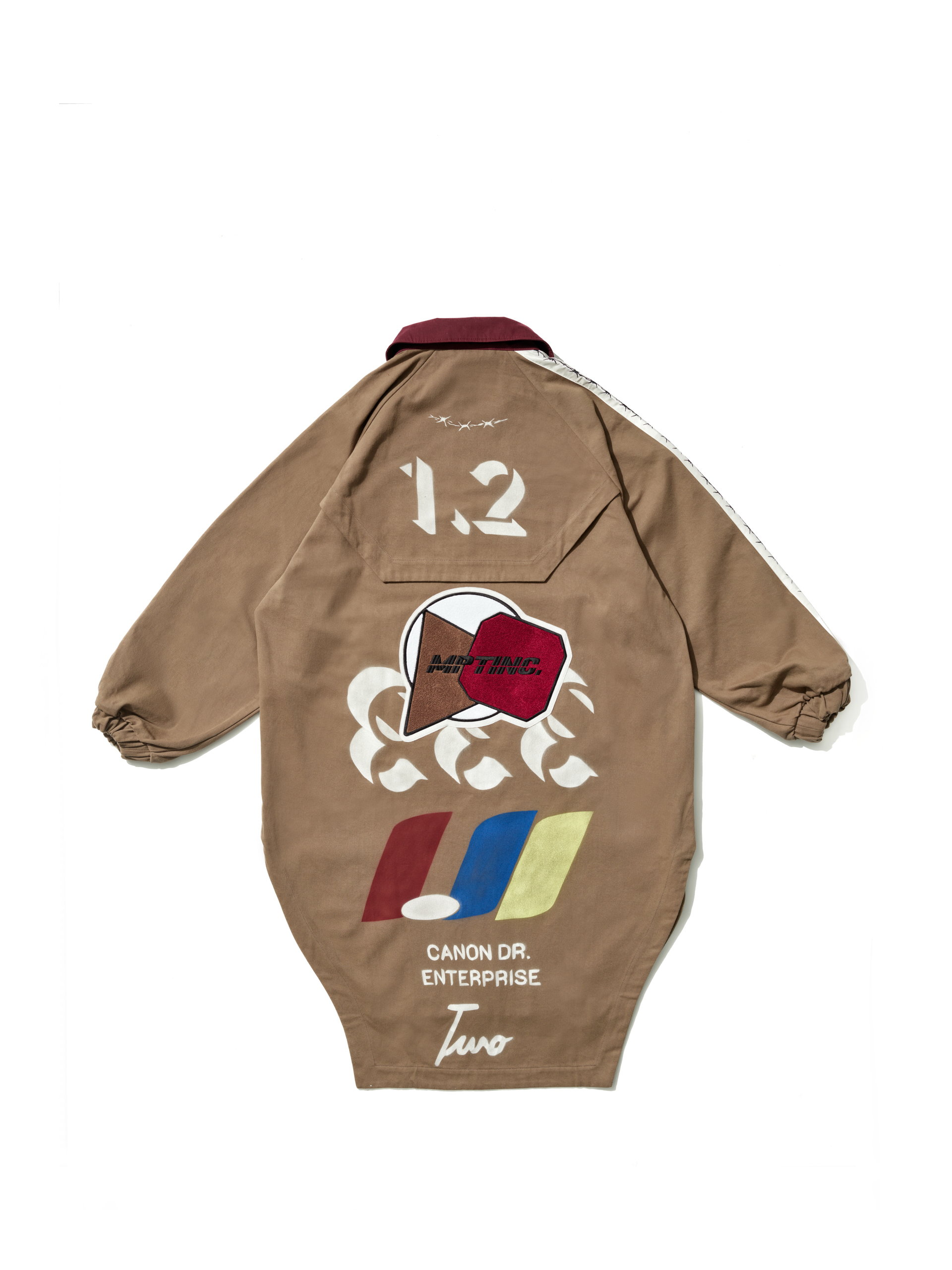 A reinterpretation of a battle-ready, heavy-condition trench coat. Features a richly elongated cut with the signature "calyxa" hemline, a blouson-like collar, and oversized, finely-ribbed sleeves. Made from a 100% Italian denim twill, with multiple printed, patched, and embroidered motifs throughout.