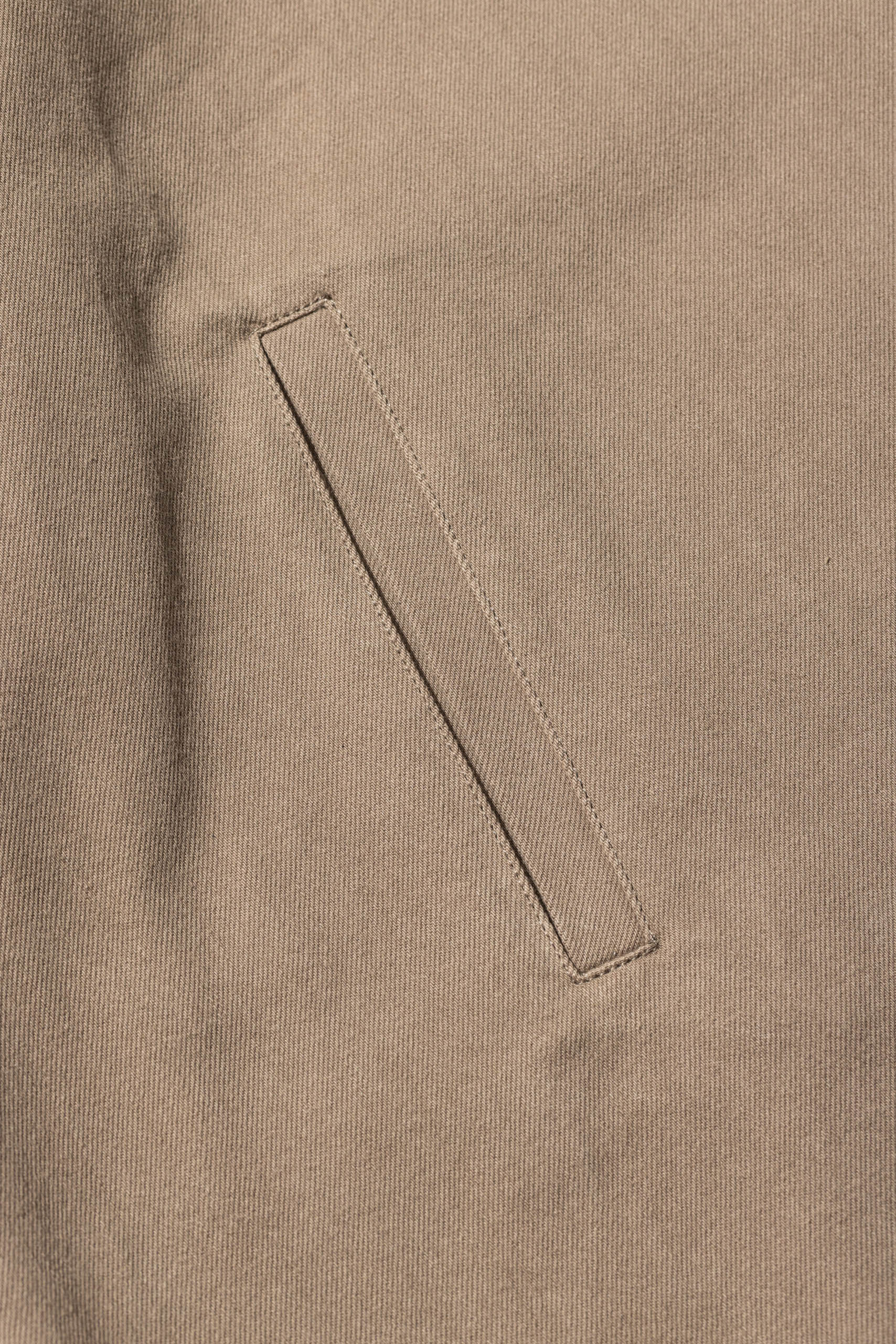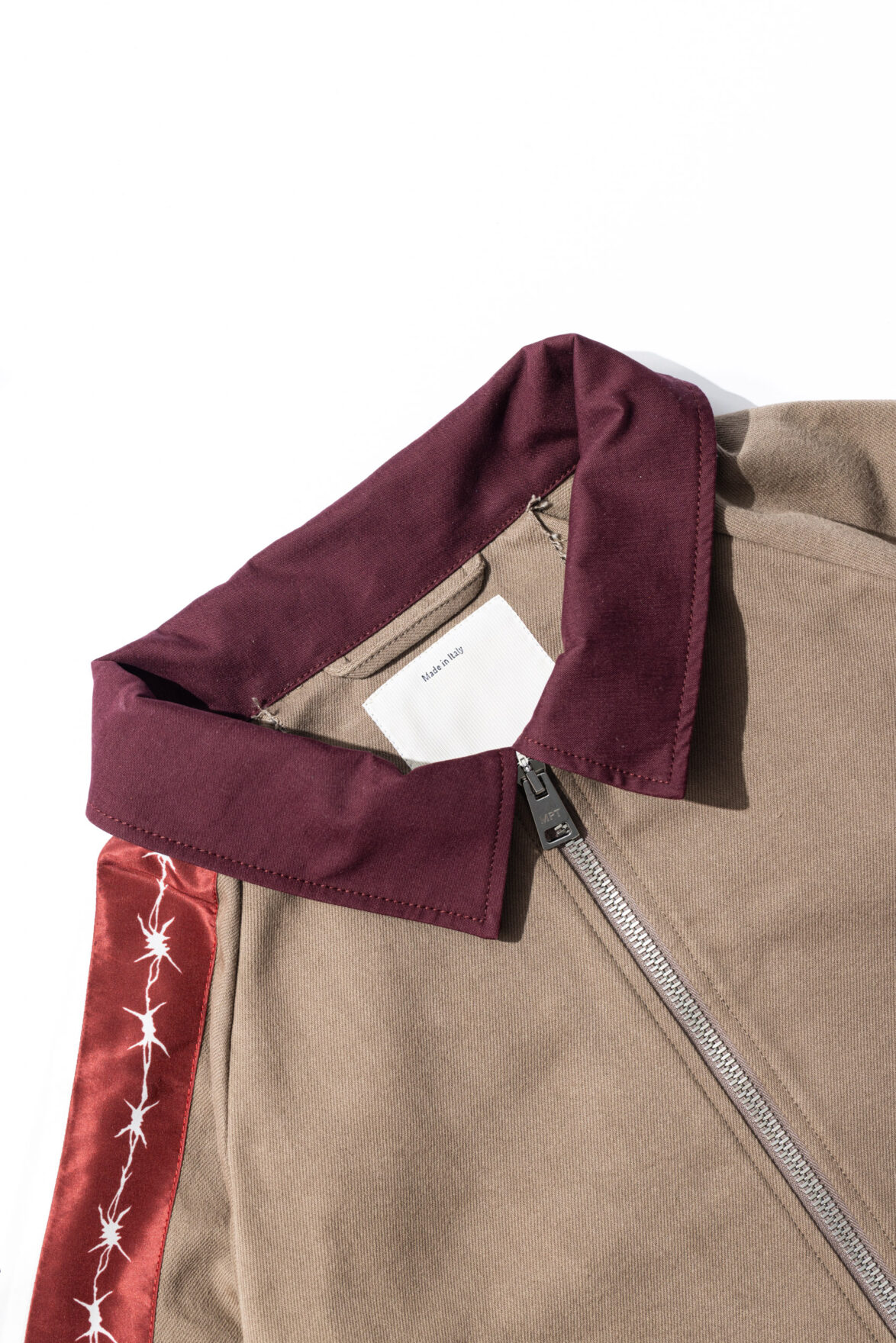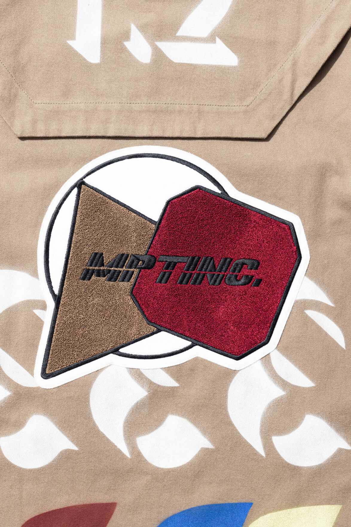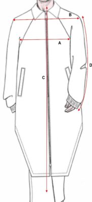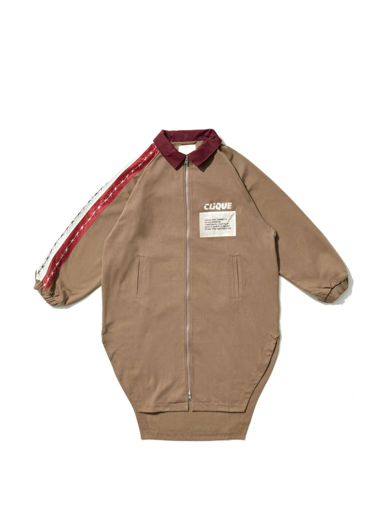 A reinterpretation of a battle-ready, heavy-condition trench coat. Features a richly elongated cut with the signature "calyxa" hemline, a blouson-like collar, and oversized, finely-ribbed sleeves. Made from a 100% Italian denim twill, with multiple printed, patched, and embroidered motifs throughout.
