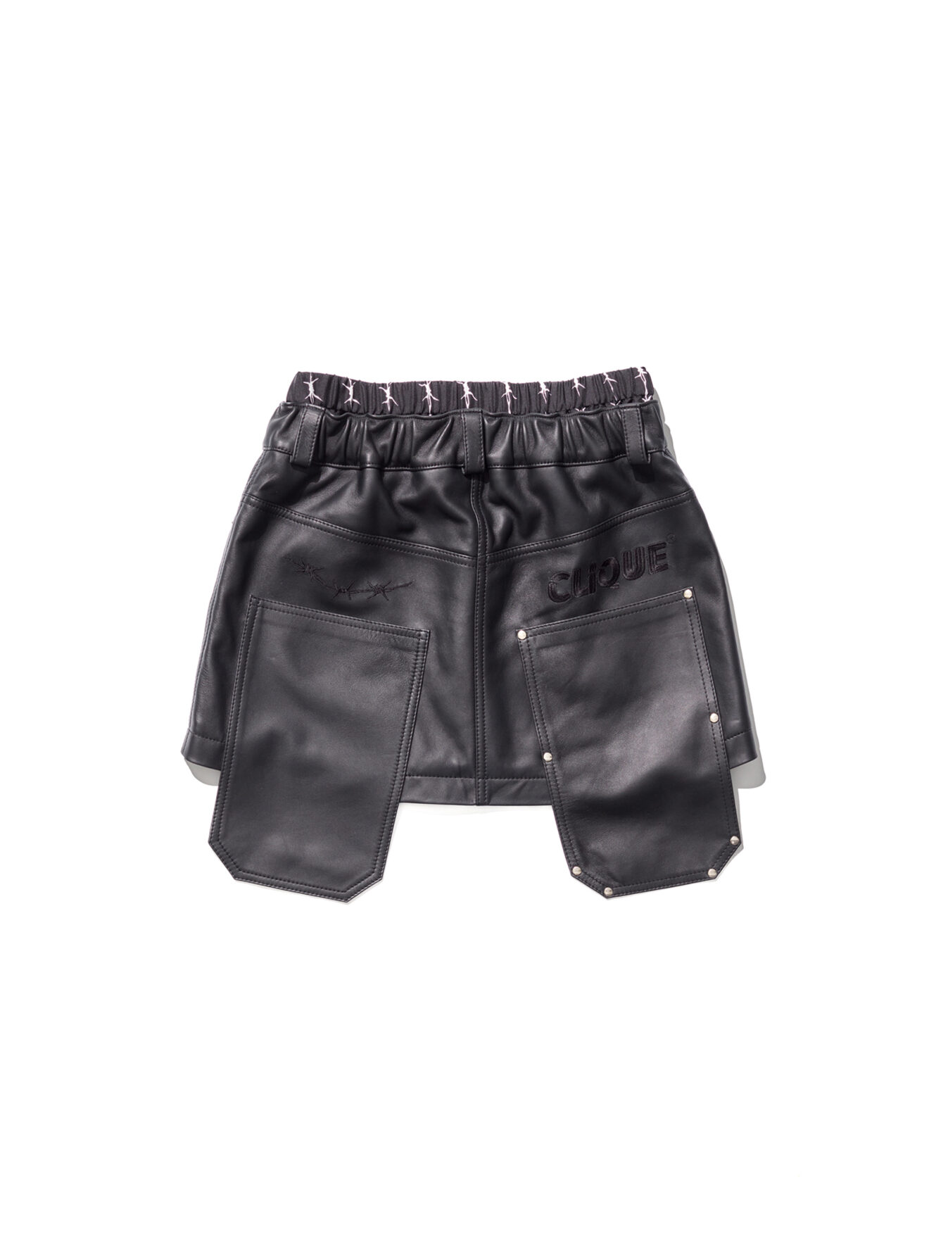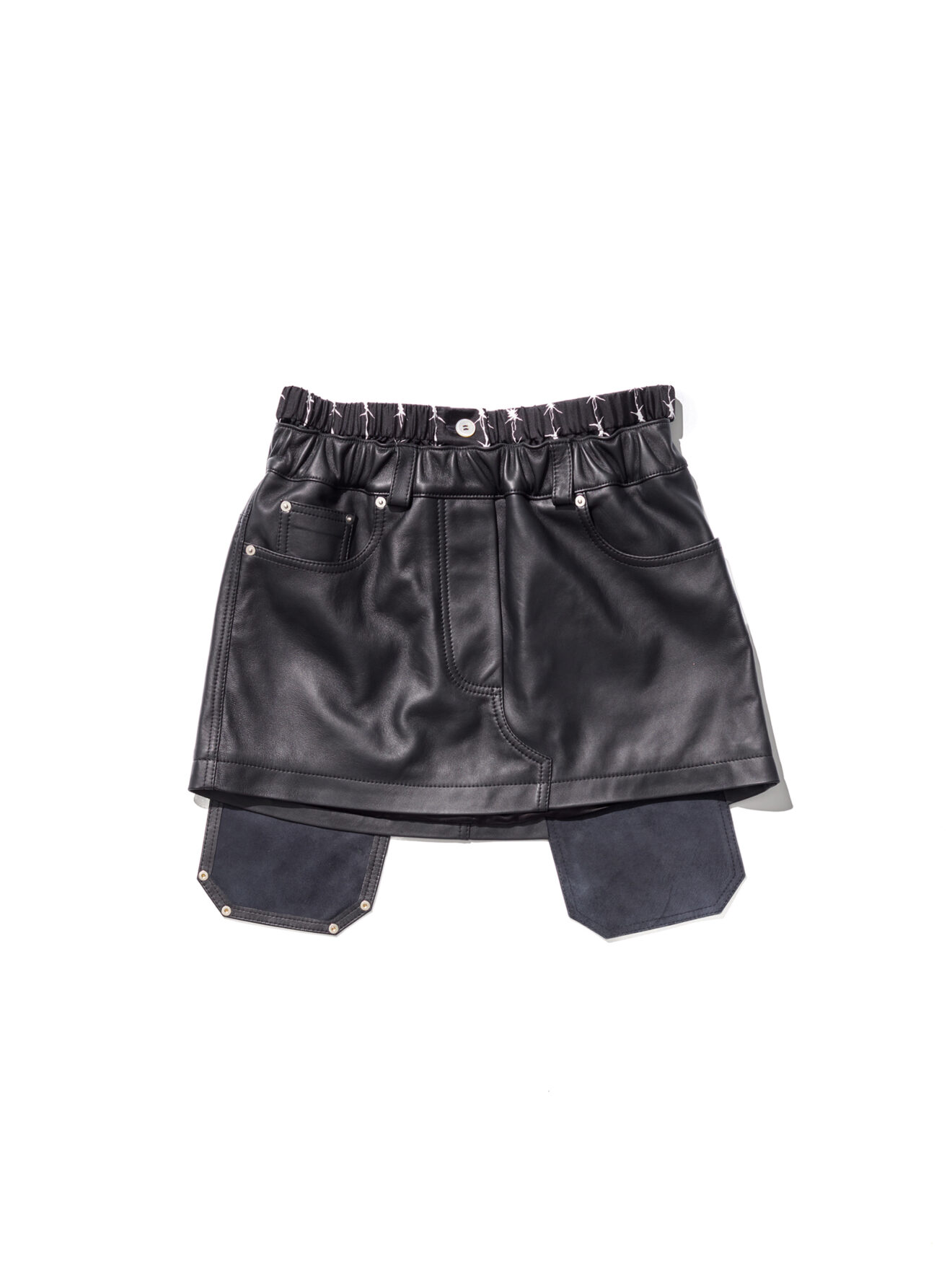 A leather-clad skirt piece made with a woman's body in mind. It retains all the signature MPT trouser details such as the elongated removable back pockets, the silk boxer short insert and belt hoops, all accumulated on an elegant, edgy, sharp short skirt silhouette. Features signature printed graphic motifs on the backside. Made from a 100% Italian Bovina leather.