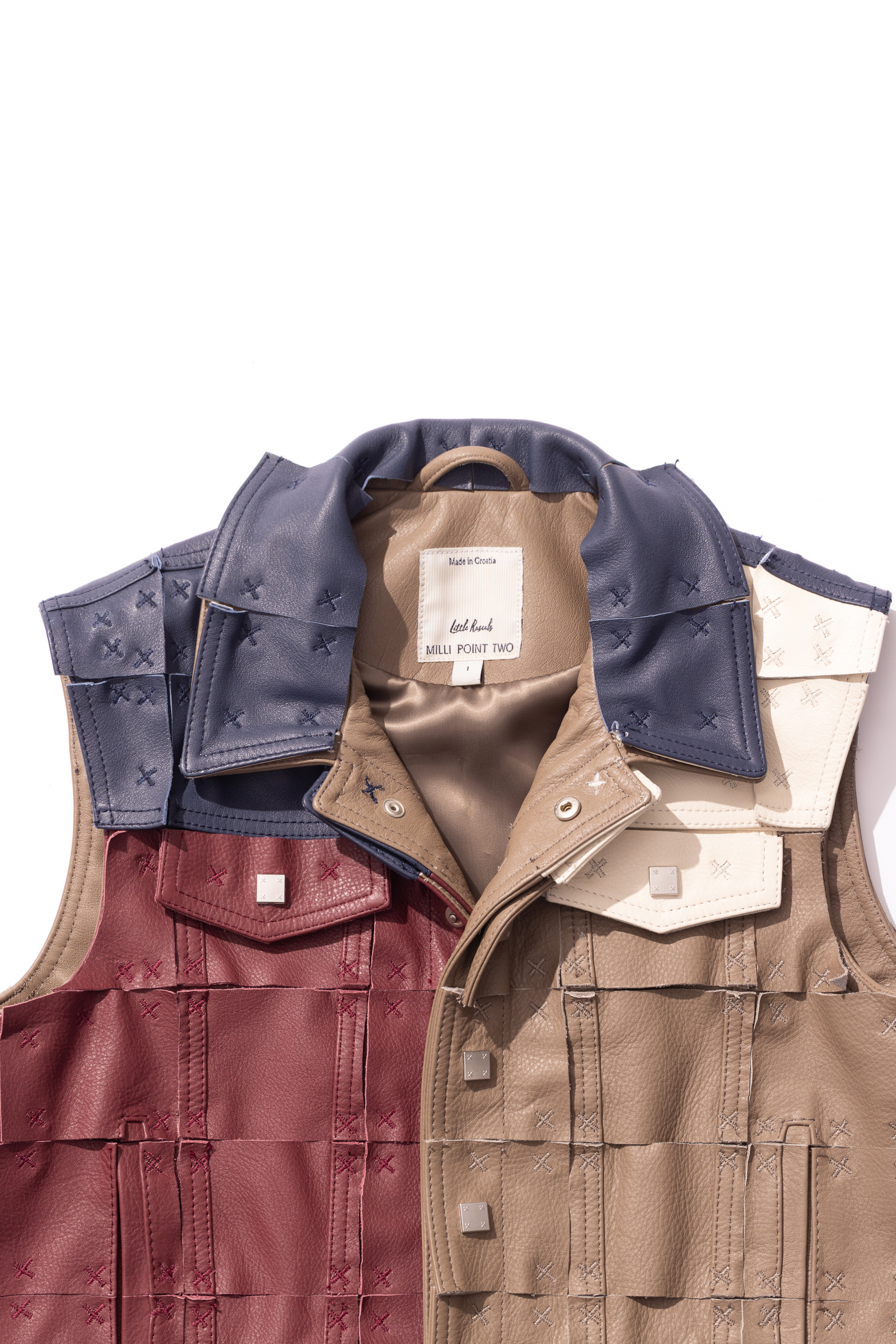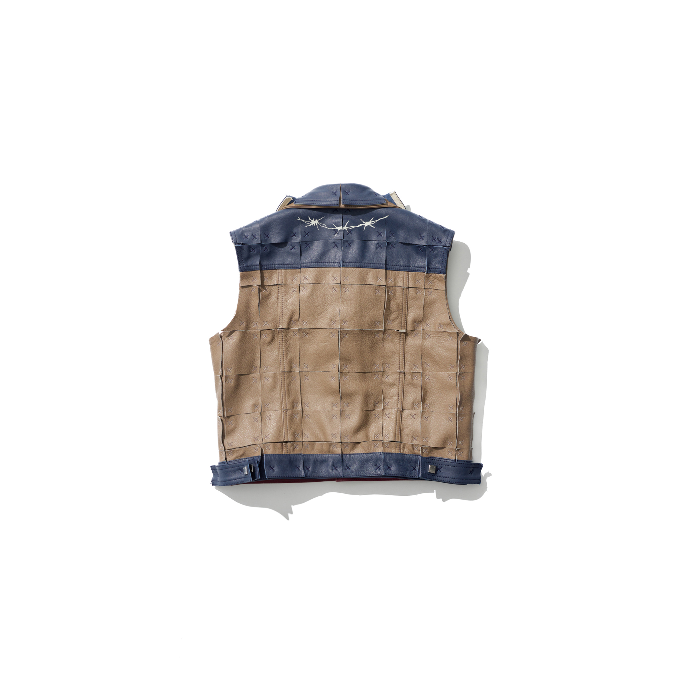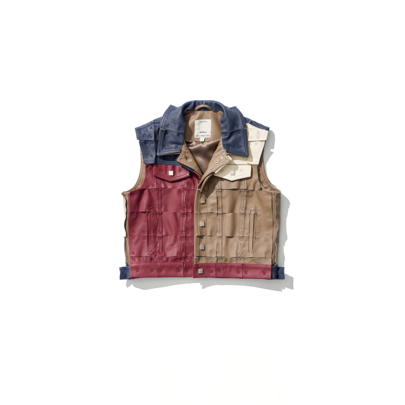 A cropped sleeveless jacket made from 100% Italian Bovina leather, utilizing the signature "3D" deconstructed finish. The vest was made by fusing two identical pieces with one lasercut into square fragments and sewn onto the base garment. Features printed details on the body.