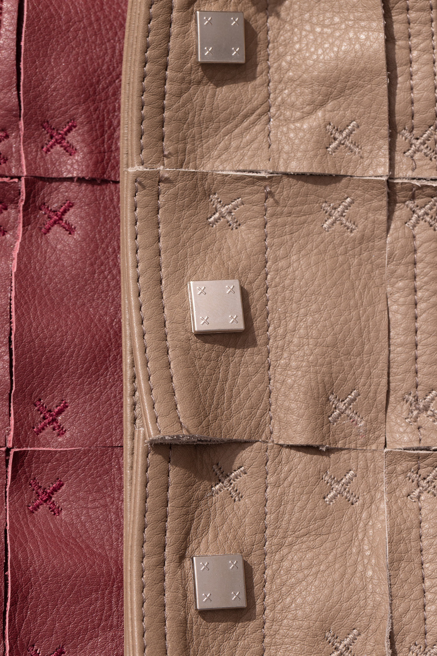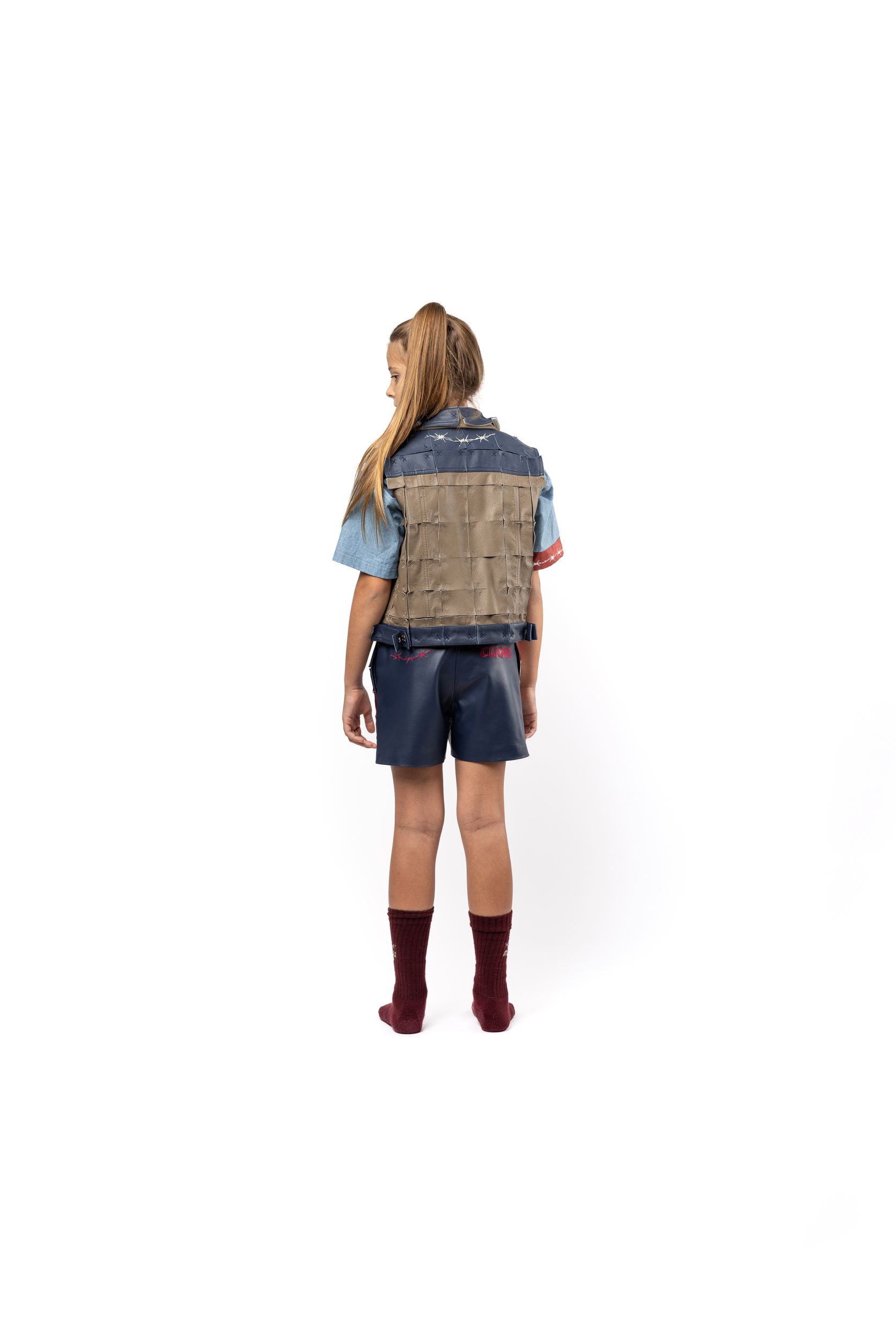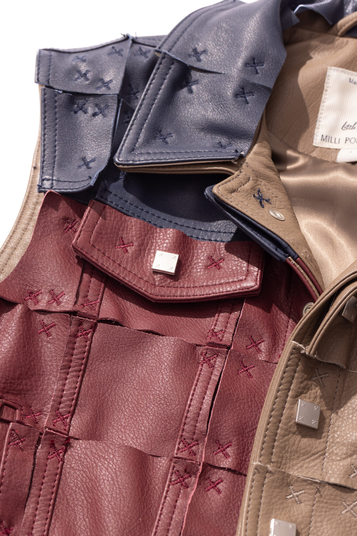 A cropped sleeveless jacket made from 100% Italian Bovina leather, utilizing the signature "3D" deconstructed finish. The vest was made by fusing two identical pieces with one lasercut into square fragments and sewn onto the base garment. Features printed details on the body.