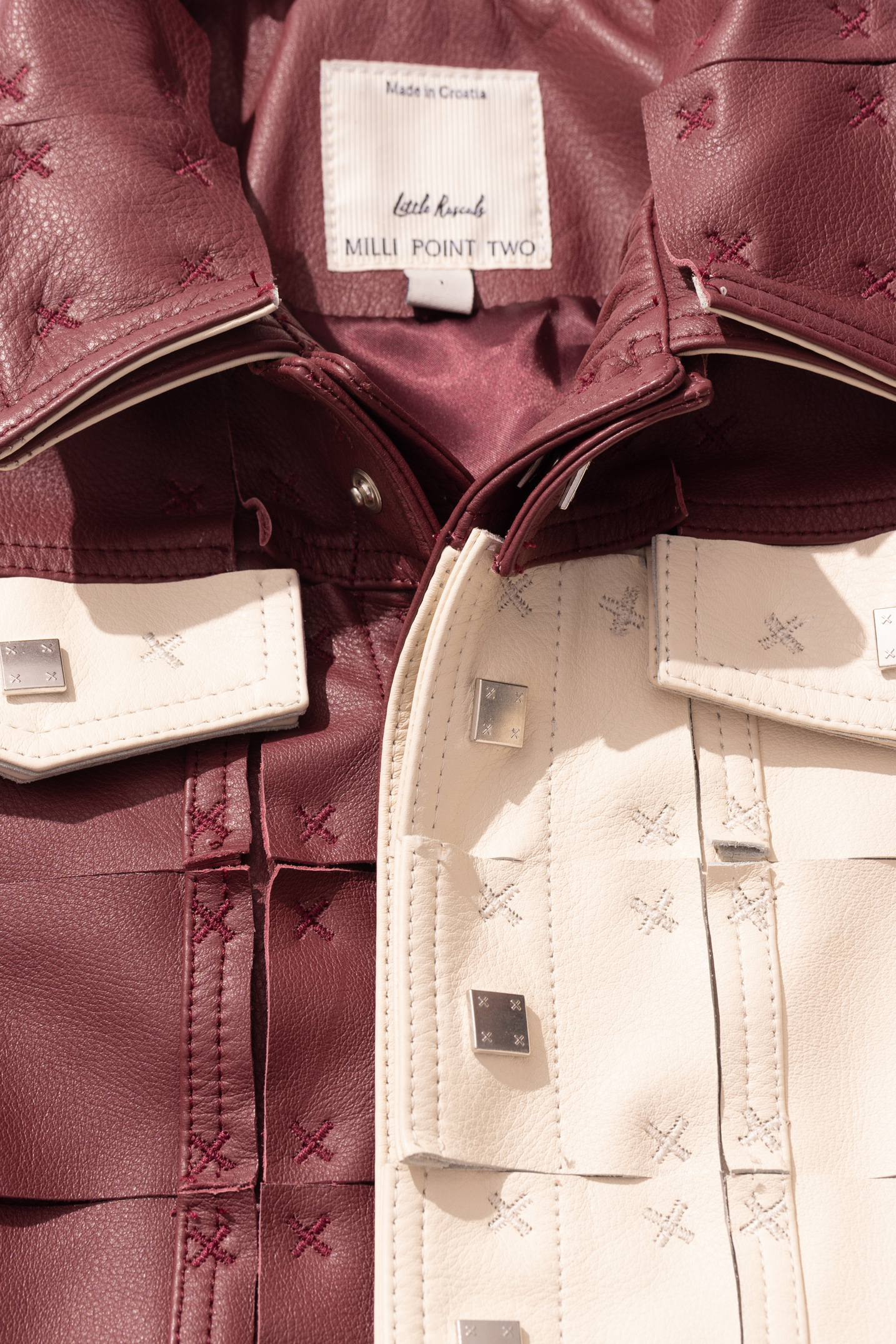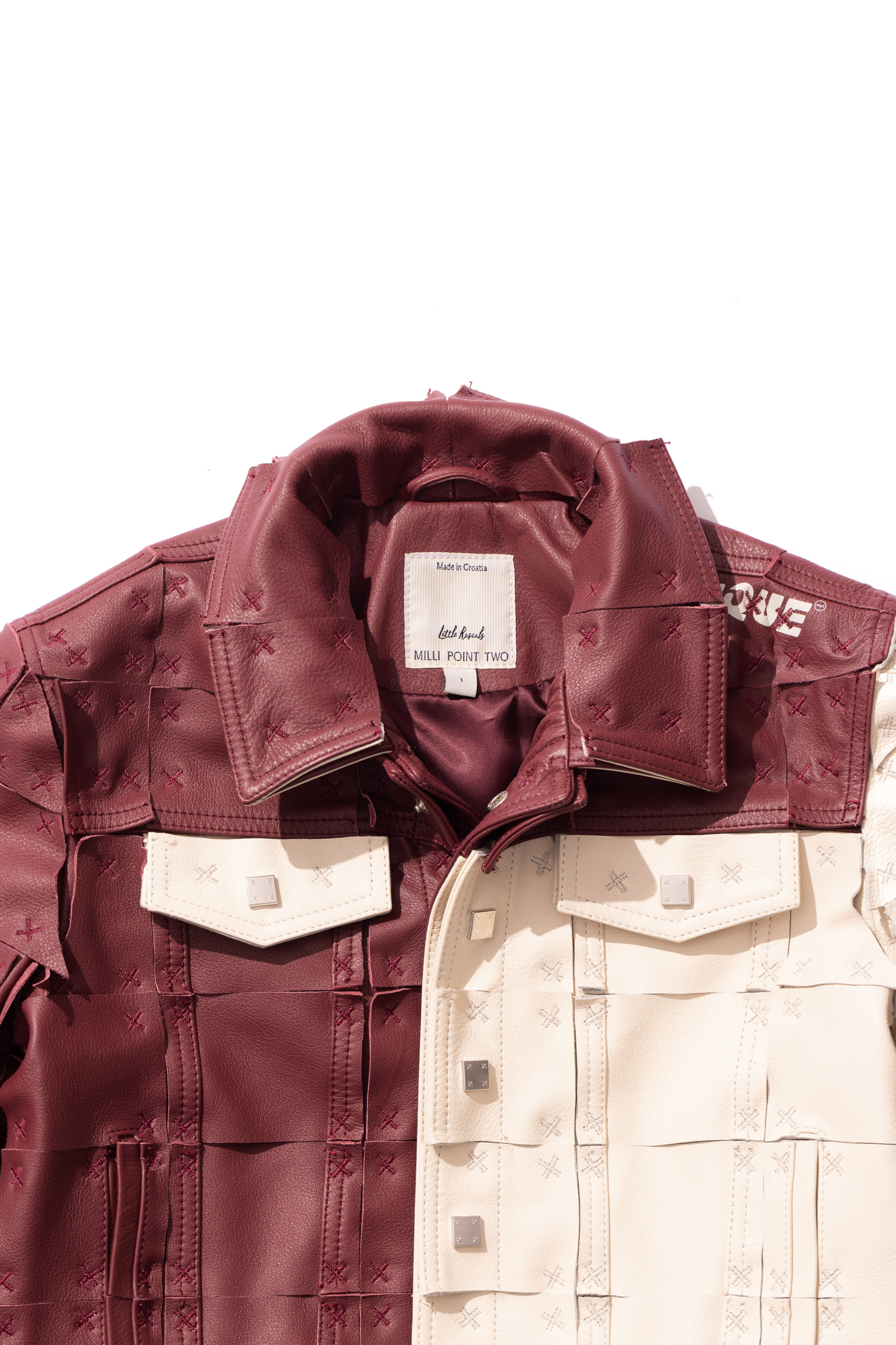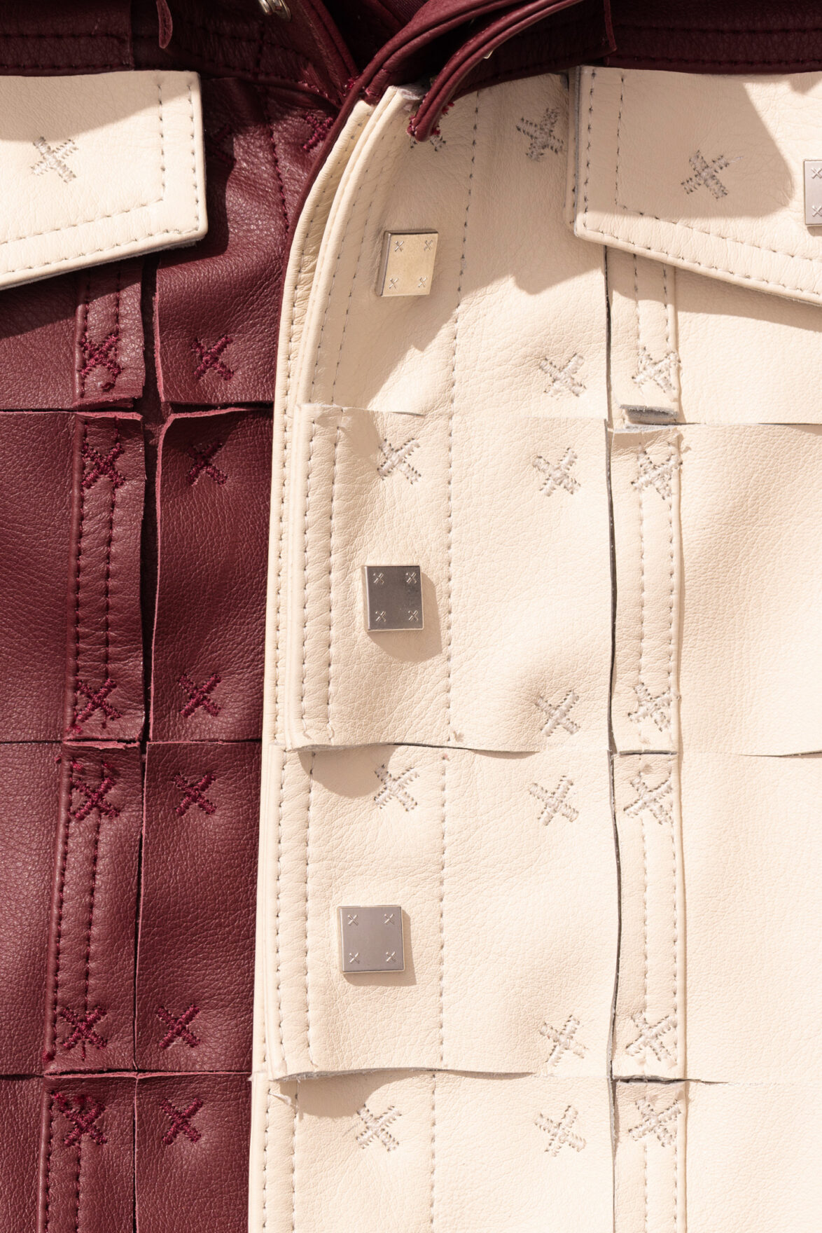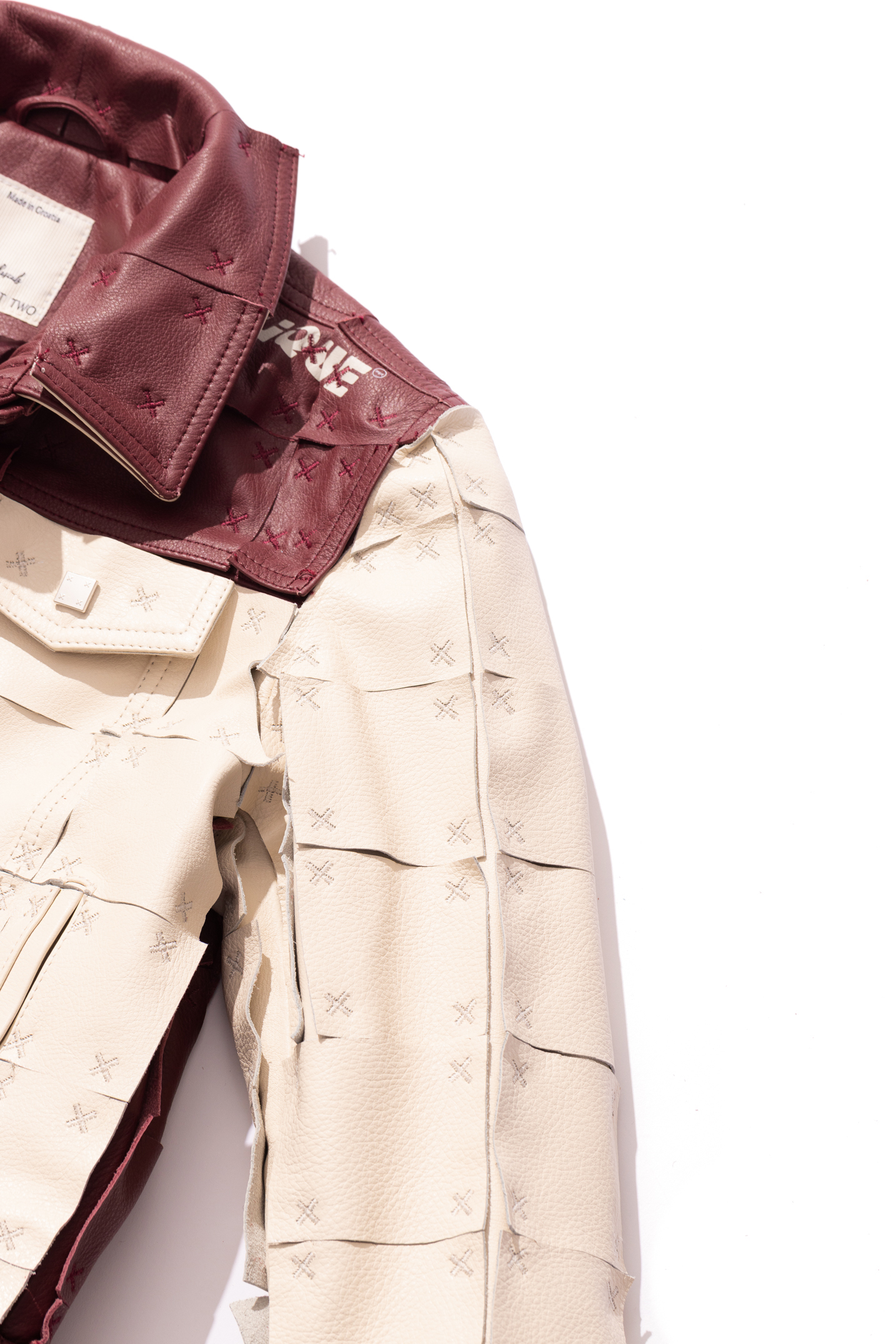 A trucker silhouette jacket made from grained Bovina leather utilizing the brand's signature "3D" deconstruction technique. The jacket was made by fusing two identical pieces with one lasercut into square fragments and sewn onto the base garment. Features printed details on the body.